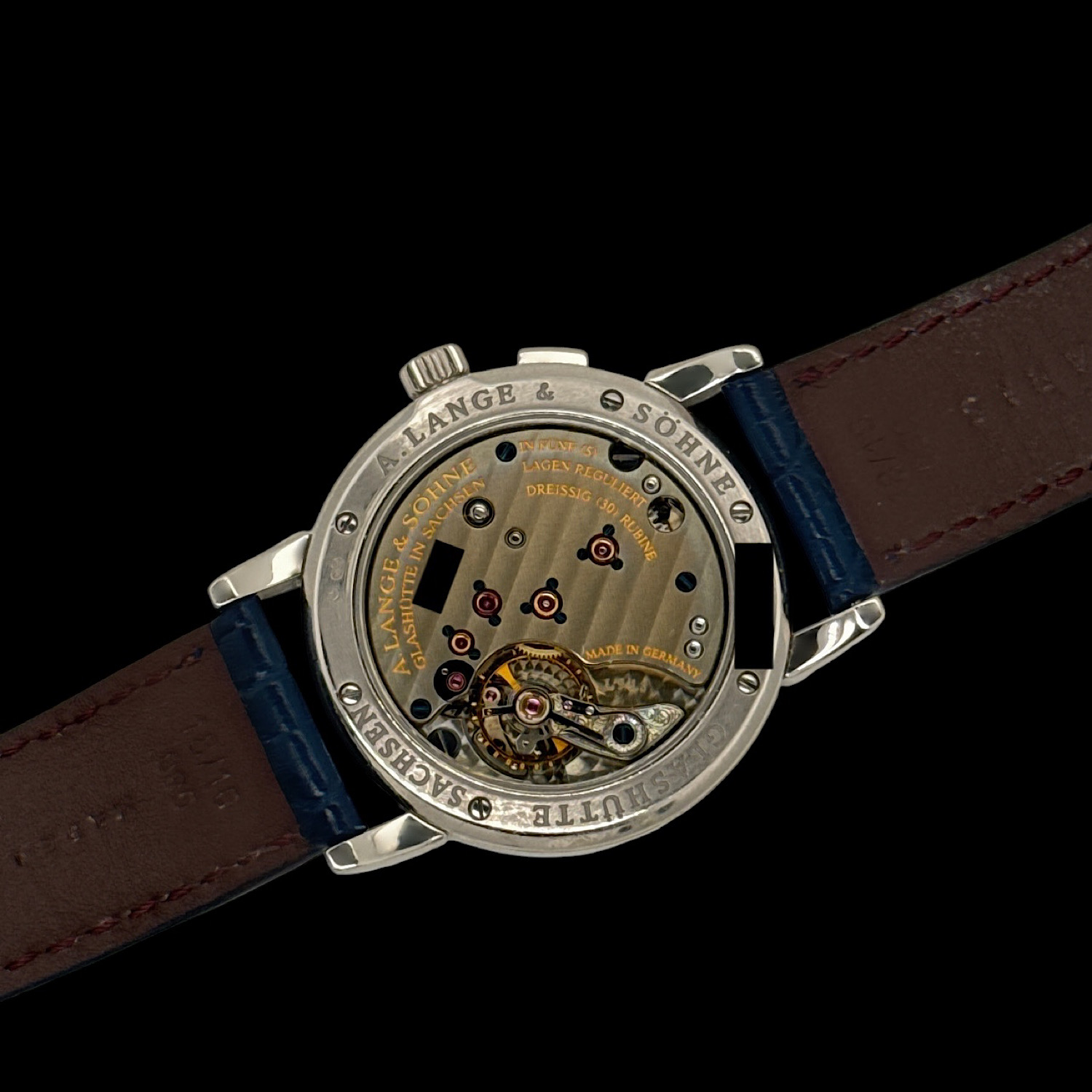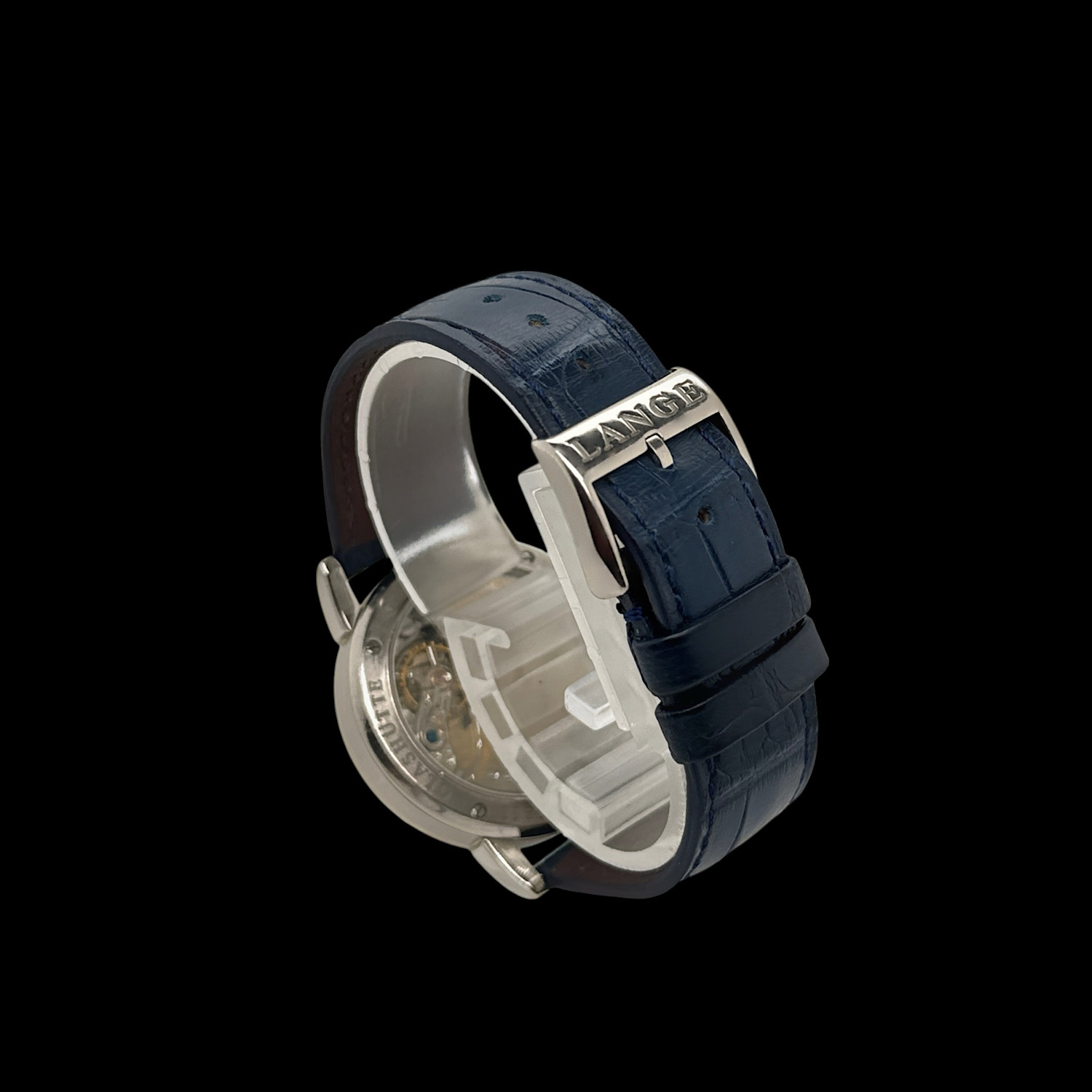 Das blaue Lederarmband wurde im Laufe der Zeit erneuert. Es befindet sich in sehr gutem Zustand. Die originale A. Lange & Söhne Dornschließe aus 18-karätigem Weißgold ist montiert.