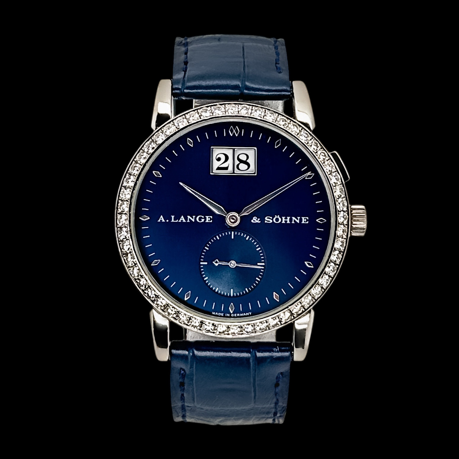 Das ca. 34-mm messende Gehäuse trägt das hauseigene Handaufzugskaliber L941.3, dessen handgravierter Unruhkloben durch den Saphirglasboden sichtbar ist. Das tiefblaue Zifferblatt mit weißgoldenen Applikationen und dem charakteristischen Großdatum bei 12 Uhr entfaltet im Zusammenspiel mit der funkelnden Lünette eine leise, kostbare Eleganz. Das blaue Lederarmband wurde im Laufe der Zeit erneuert und rundet mit der originalen Dornschließe aus 18-karätigem Weißgold das harmonische Gesamtbild ab.