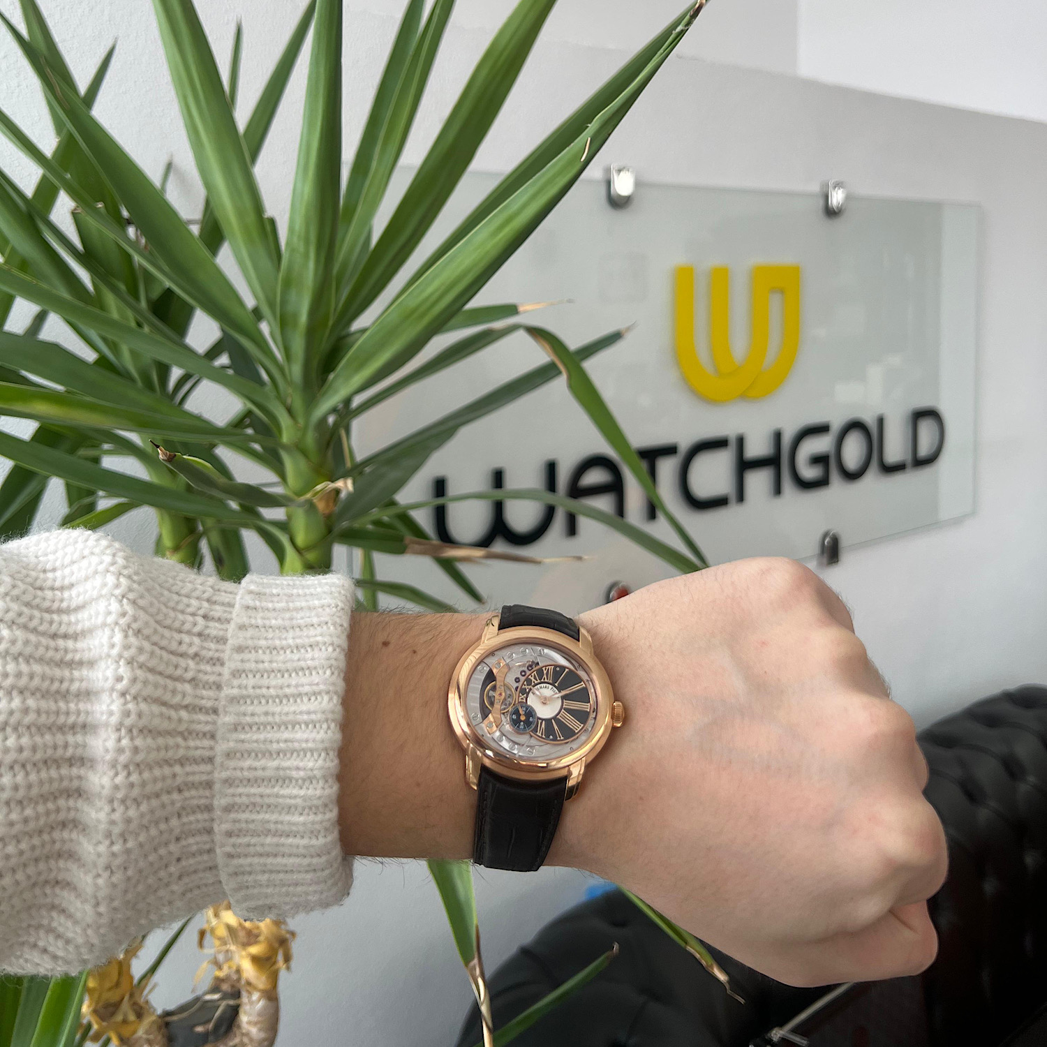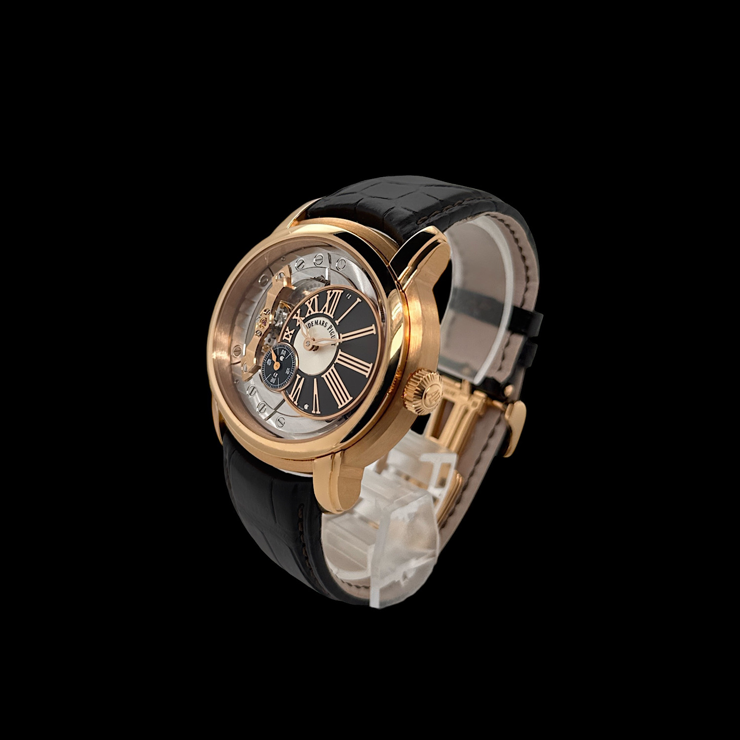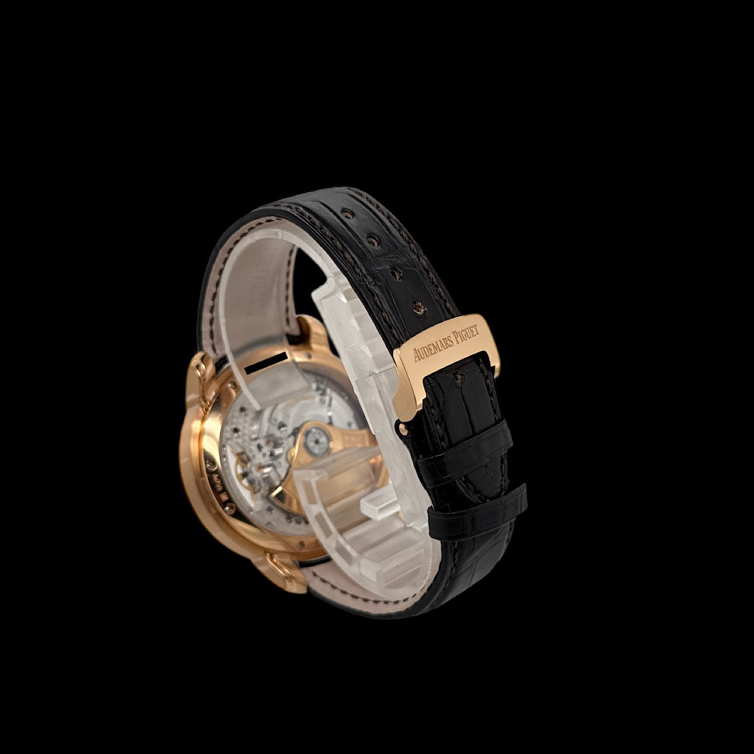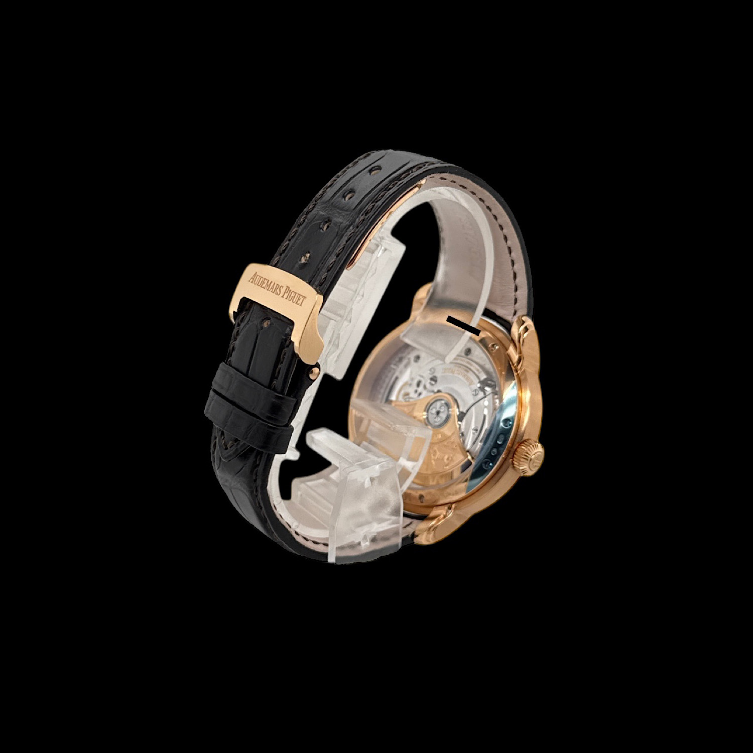 Die Audemars Piguet Millenary 4101 in 18-karätigem Roségold verkörpert eine der mutigsten Visionen der Schweizer Haute Horlogerie. Seit ihrer Präsentation im Jahr 2011 fasziniert diese außergewöhnliche Herrenuhr durch ihre revolutionäre Architektur: Das Manufakturkaliber 4101 wurde komplett invertiert konzipiert, sodass Unruh, Anker und Hemmung nicht im Verborgenen arbeiten, sondern auf der Zifferblattseite ihr mechanisches Ballett aufführen. Diese dreidimensionale Inszenierung, verstärkt durch die handveredelten Côtes de Genève und den 22-karätigen Goldrotor mit den Familienwappen, macht jede Sekunde zum visuellen Erlebnis.