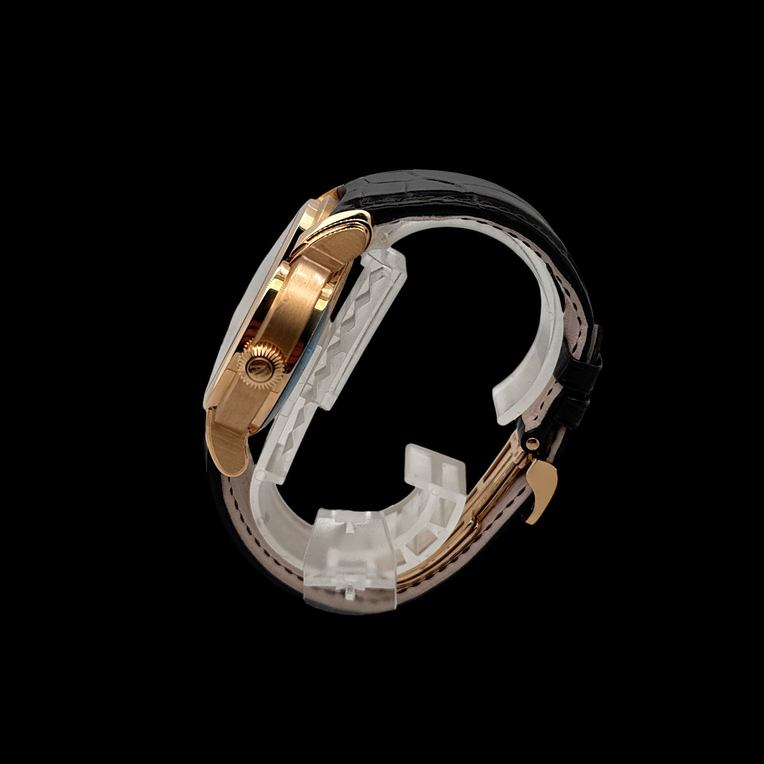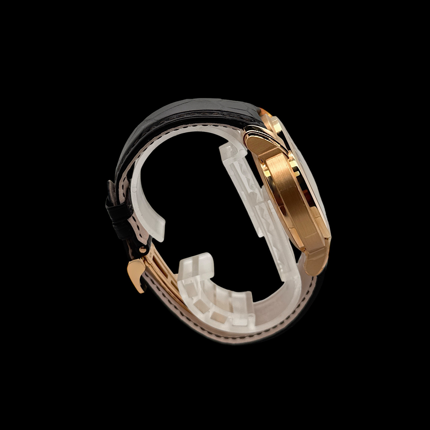 Das Gehäuse aus 18-karätigem Roségold befindet sich in einem ungetragenen Zustand. Leichte Lagerungsspuren können vorhanden sein.