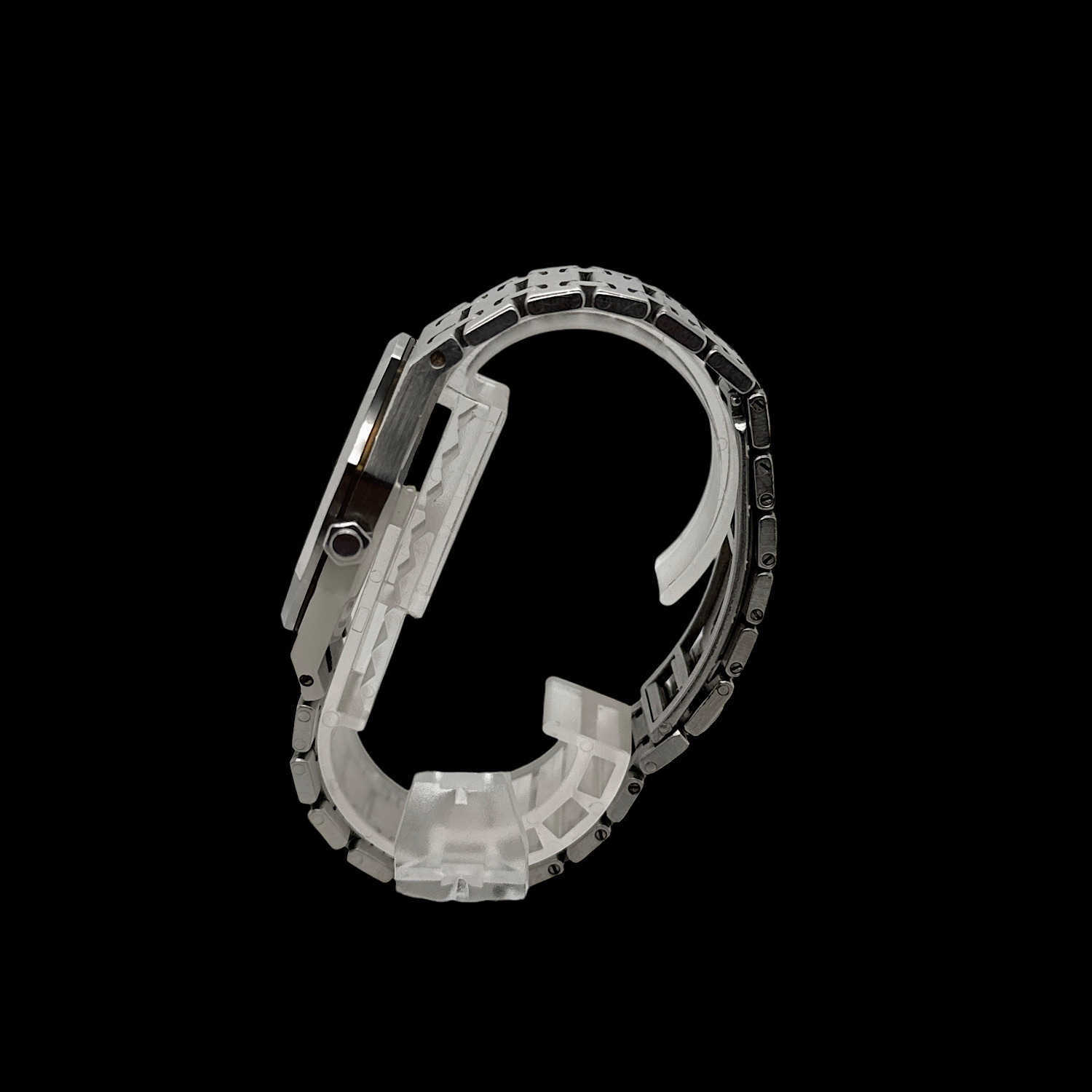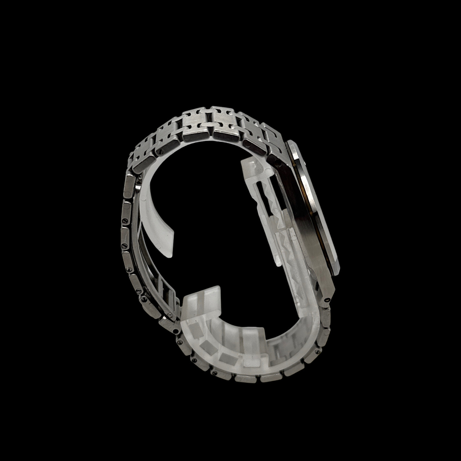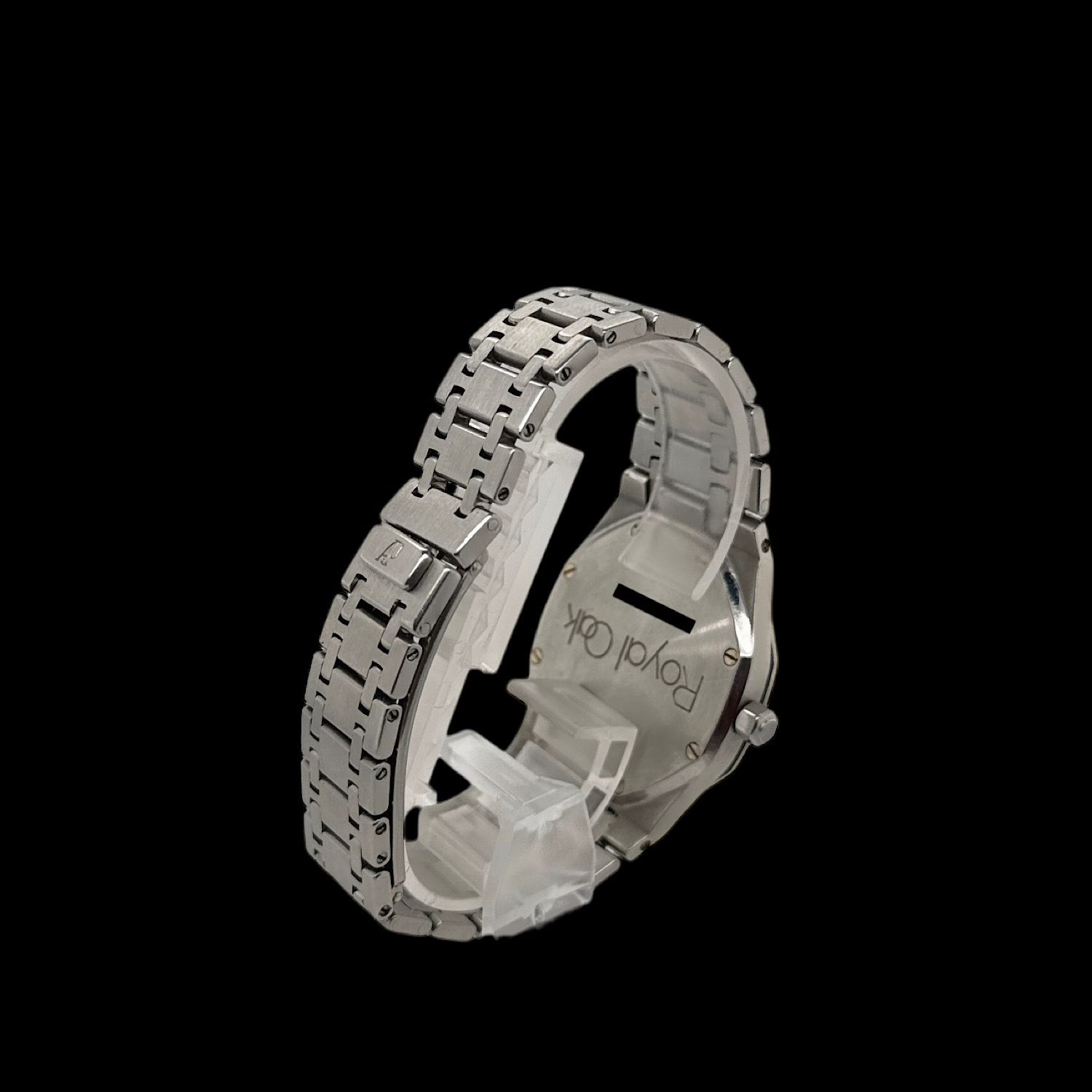 Was Sammler als „Mini-Jumbo" feiern, offenbart sich auf den ersten Blick: Mit 37 Millimetern ist sie die größte klassische Vintage-Royal Oak, ihre schmale Lünette lässt das tiefschwarze Petite Tapisserie-Zifferblatt deutlicher hervortreten, was die Lesbarkeit erhöht. Das vergrößerte AP-Logo und der zarte Automatic-Schriftzug sind Zeichen jener Experimentierfreude, mit der Gerald Gentas Meisterwerk neu interpretiert wurde. Die unsignierte Krone verbindet sie mit den frühesten Royal Oak Legenden.