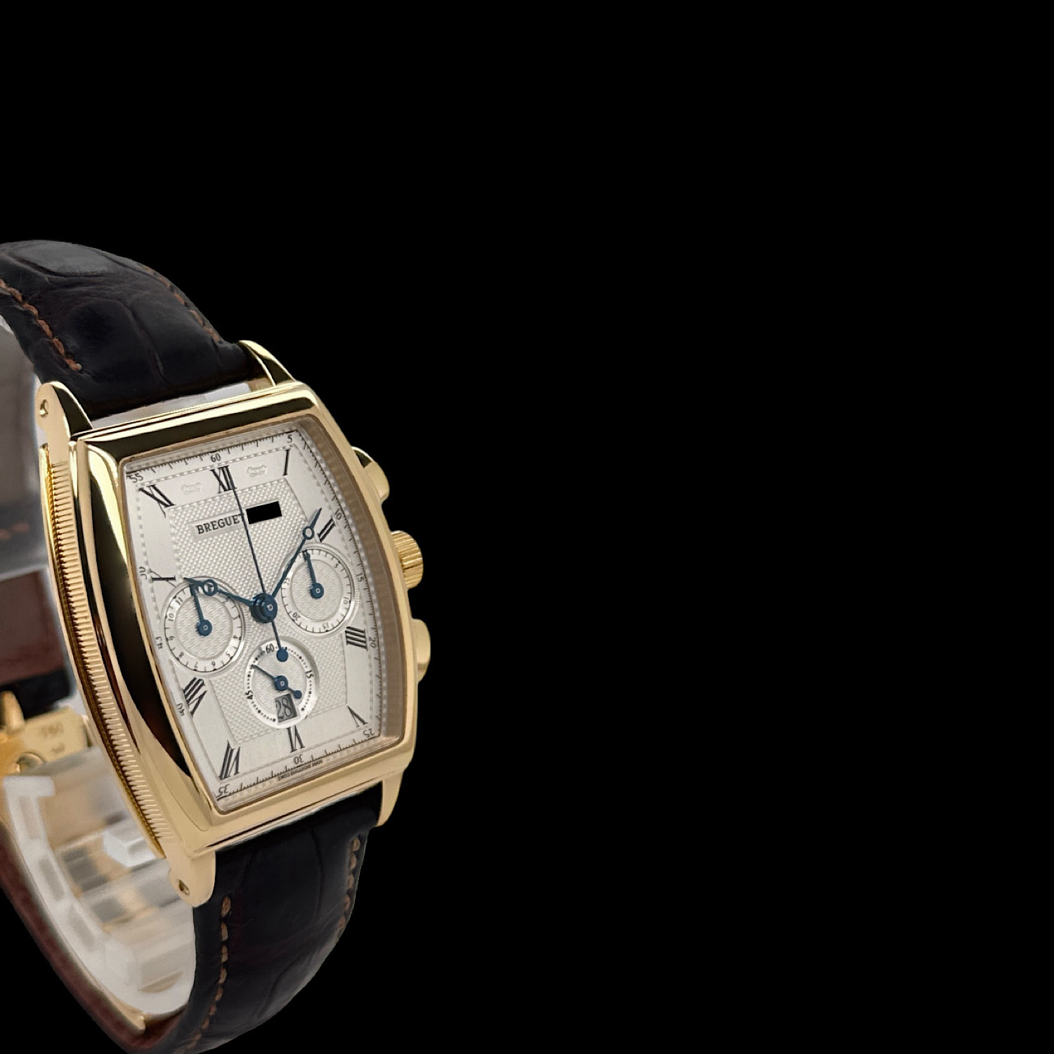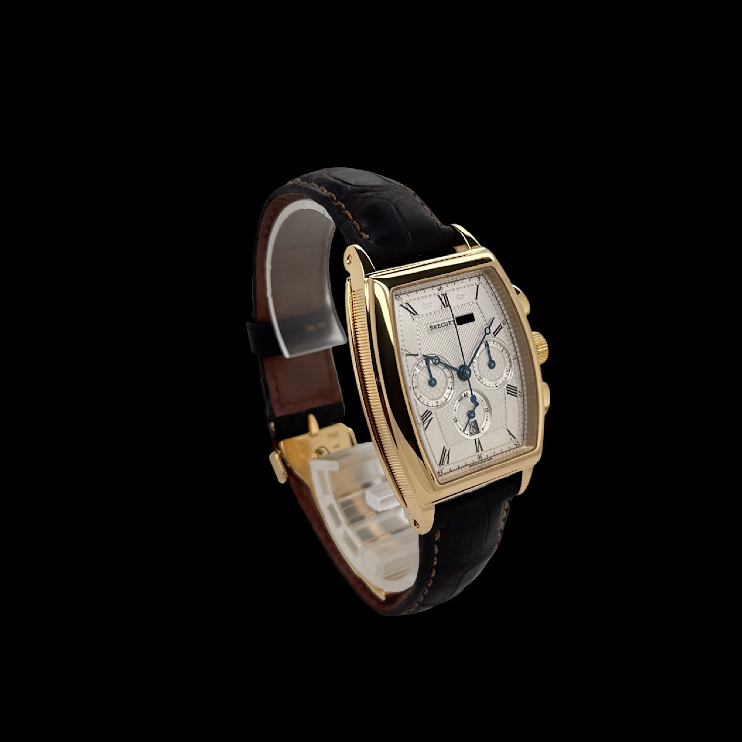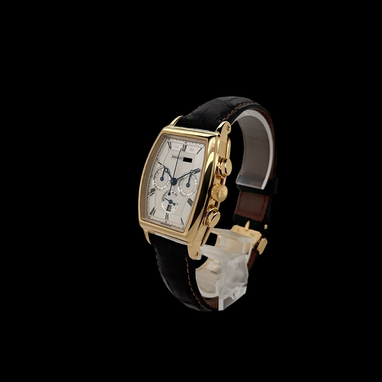 Das Breguet Leder-Armband ist angenehm eingetragen. Gerne sind wir Ihnen auf Wunsch bei der Suche nach einem neuen Breguet Armband behilflich. Die originale Breguet Faltschließe aus 18-karätigem Gelbgold ist montiert.