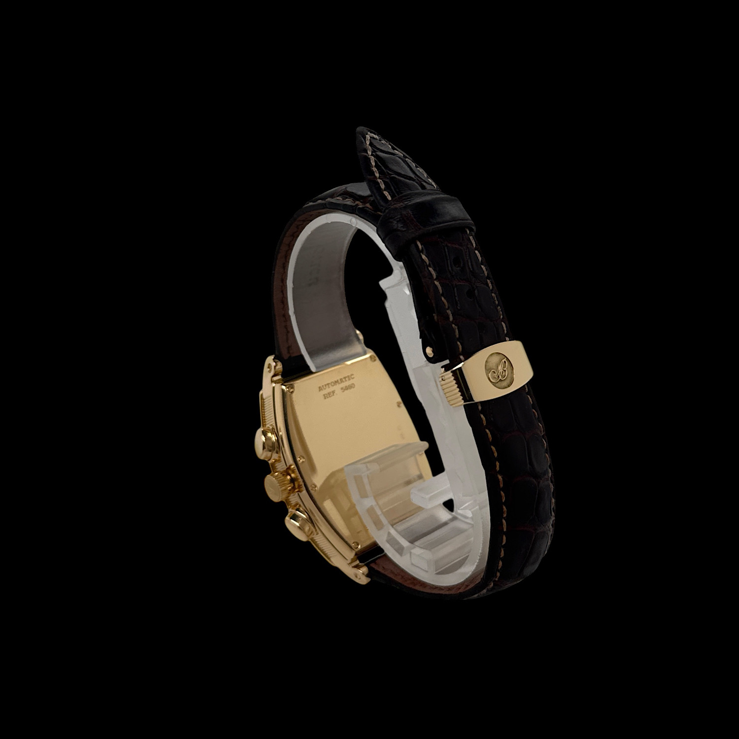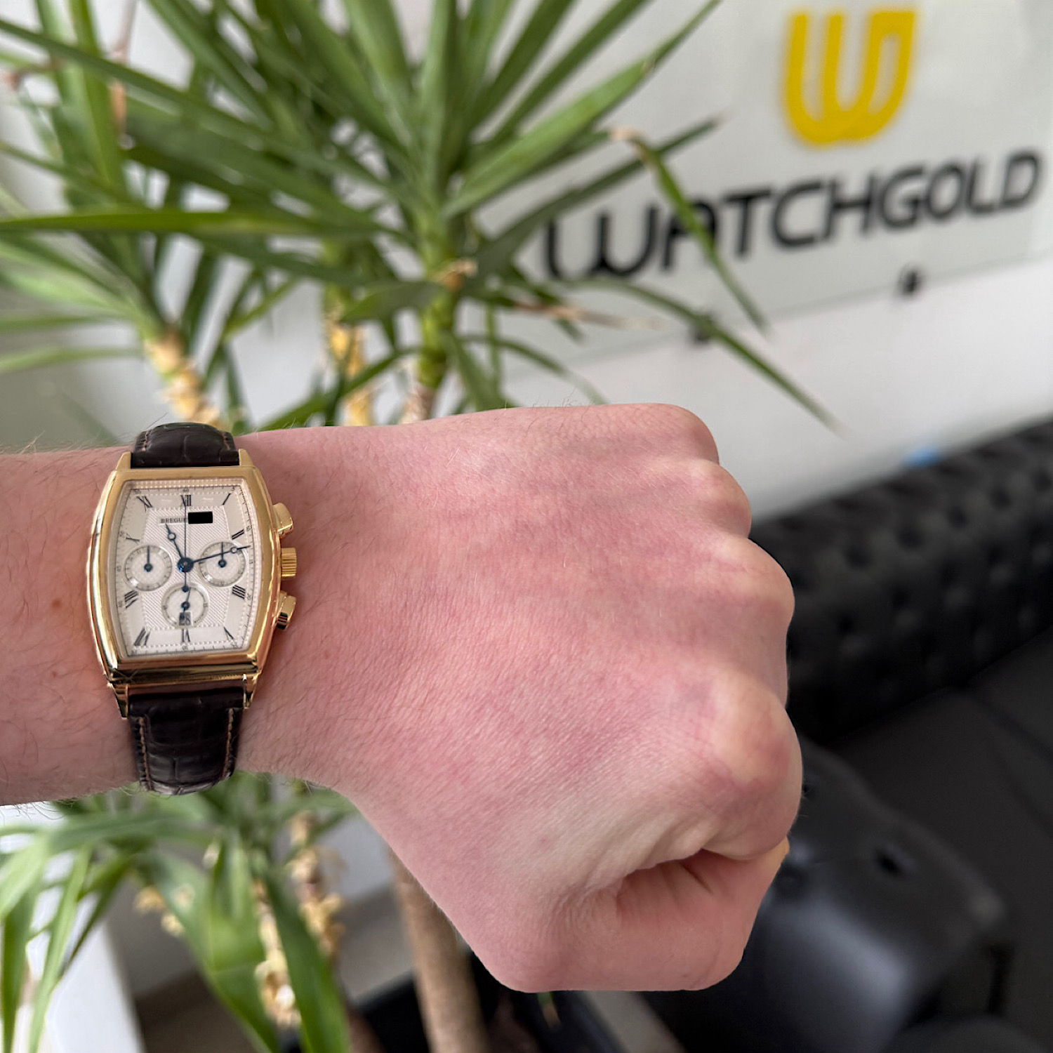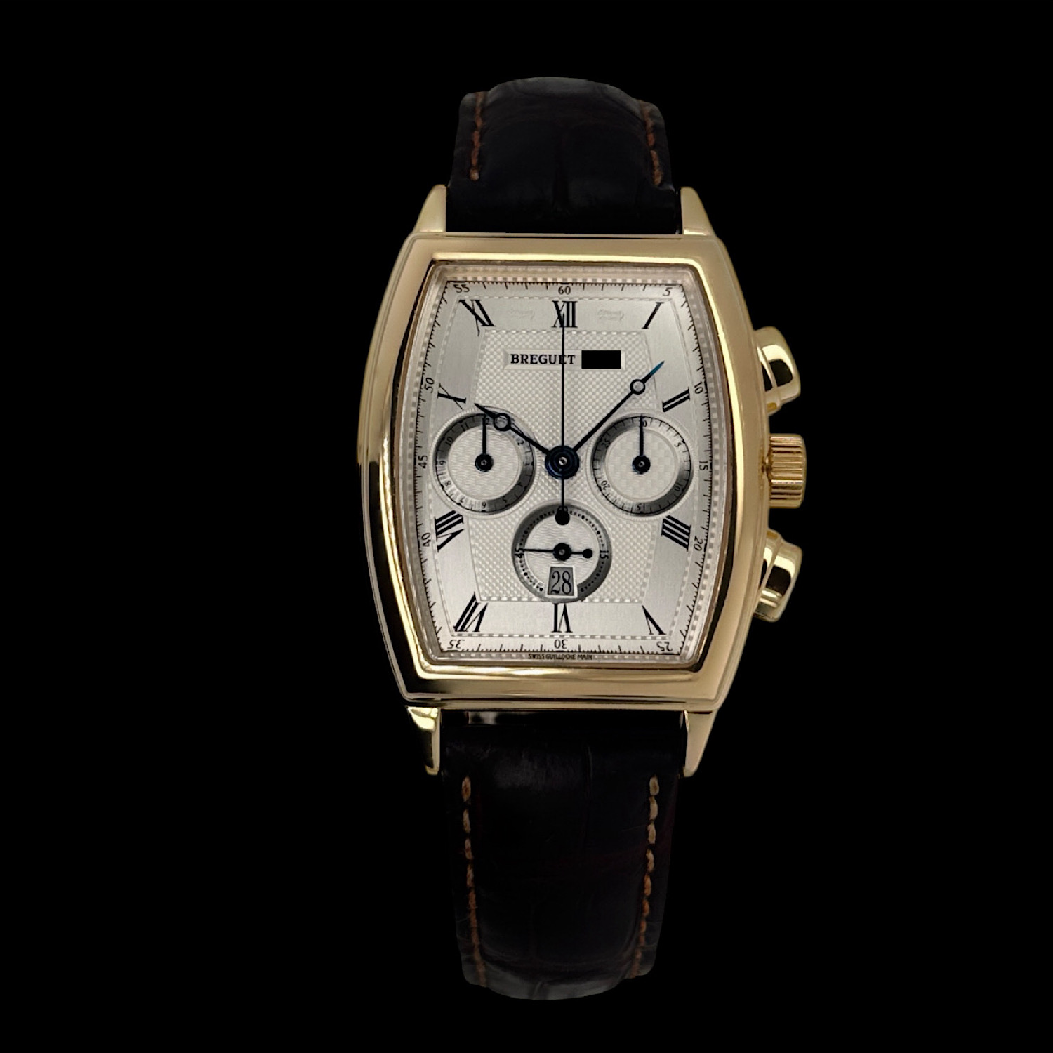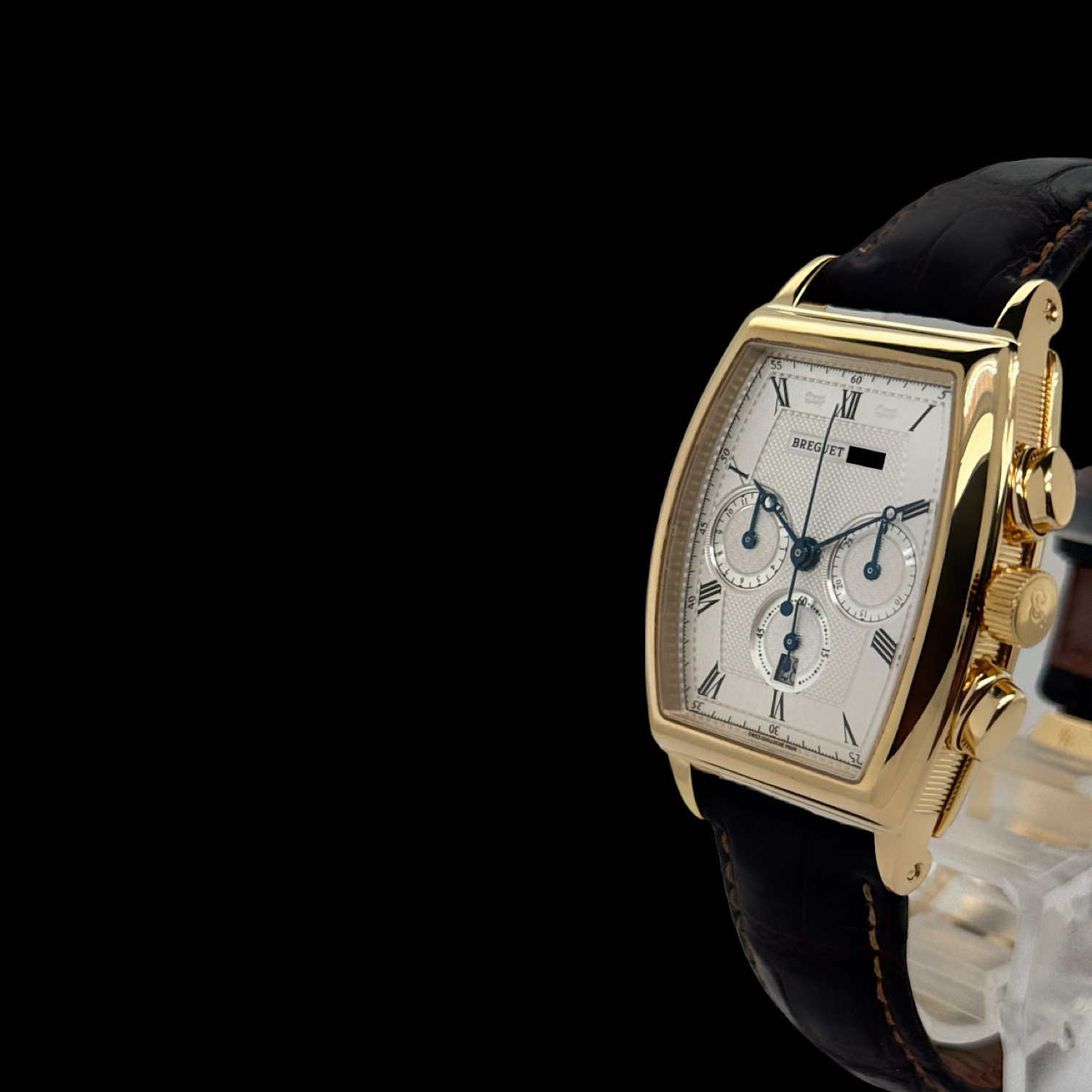 Das Breguet Leder-Armband ist angenehm eingetragen. Gerne sind wir Ihnen auf Wunsch bei der Suche nach einem neuen Breguet Armband behilflich. Die originale Breguet Faltschließe aus 18-karätigem Gelbgold ist montiert.