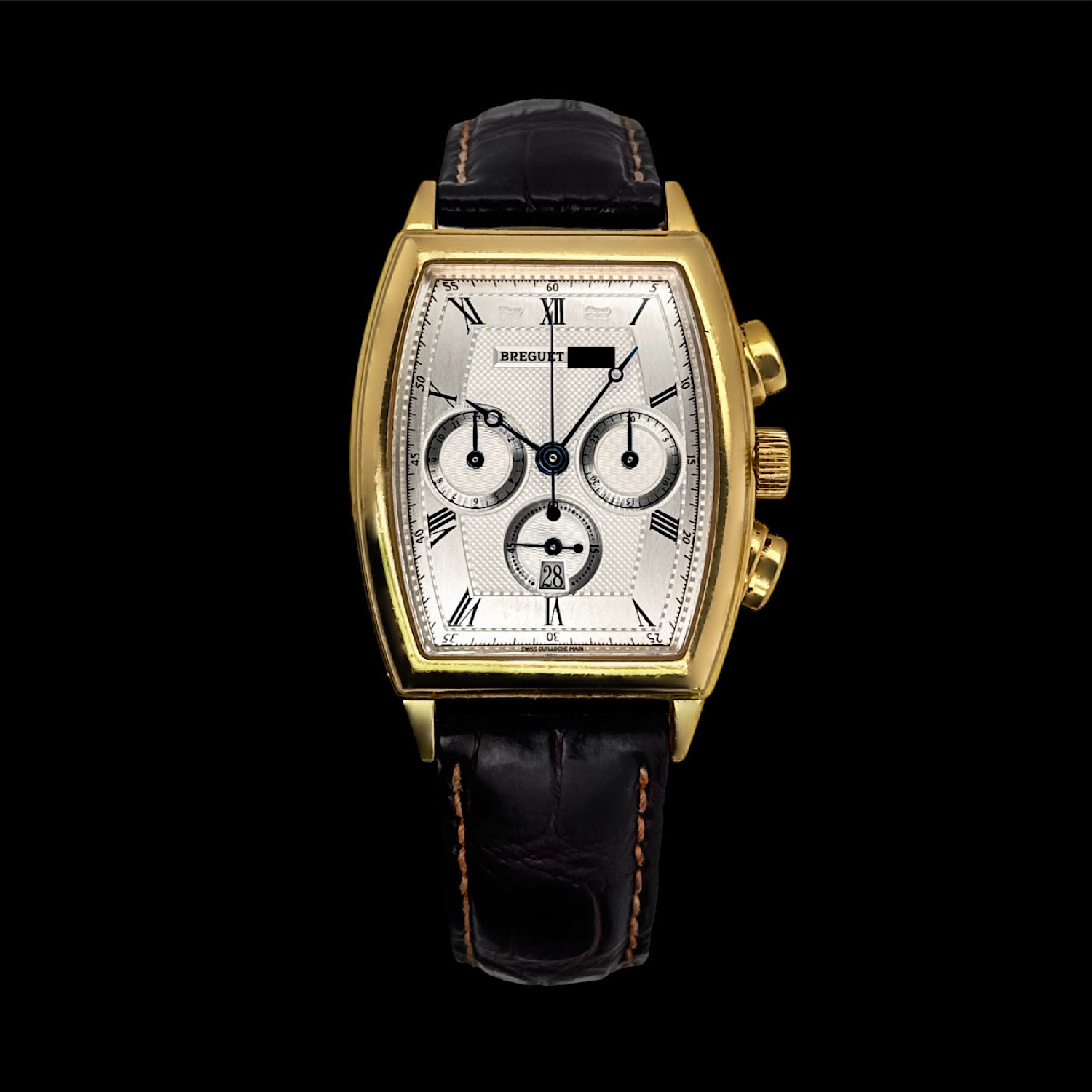 Das handguillochierte Silberzifferblatt zeigt verschiedene Gravurmuster, die römischen Ziffern und gebläute Breguet-Zeiger sorgen für exzellente Lesbarkeit. Die Chronographenfunktion mit 30-Minuten- und 12-Stunden-Zählern sowie Datumsanzeige bei sechs Uhr machen diesen Zeitmesser zum vielseitigen Begleiter.