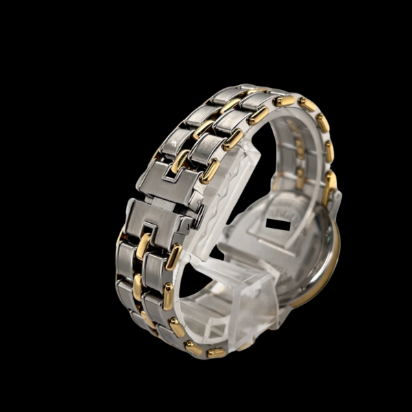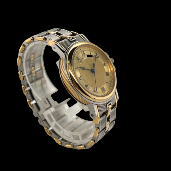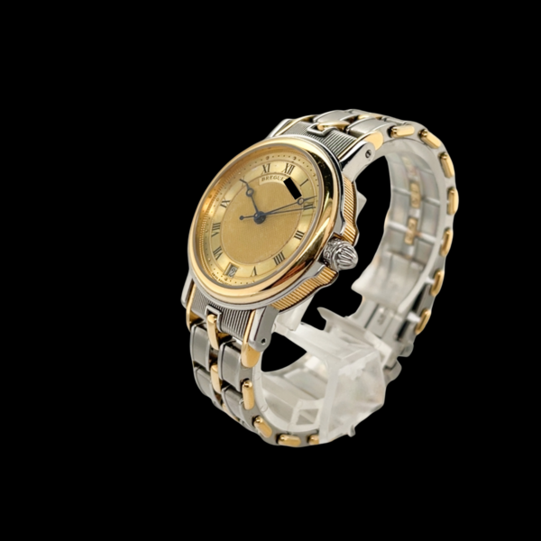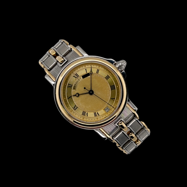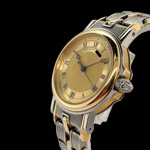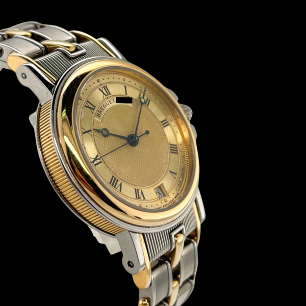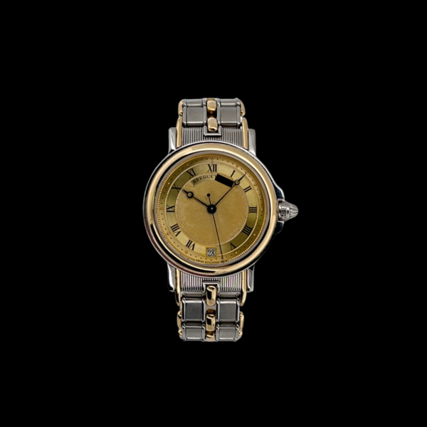 Das angebotene Modell besticht durch seine elegante Kombination aus Edelstahl und 18-karätigem Gelbgold. Mit einem Gehäusedurchmesser von 35,5 mm eignet sich die Uhr ideal als Unisex-Modell und spricht Damen wie Herren an, die klassische Proportionen und zeitloses Design zu schätzen wissen. Das silberne Zifferblatt ist fein guillochiert – eine typische Breguet-Signatur – und trägt römische Ziffern, die dem Gesamtbild eine besondere Noblesse verleihen. Eine gleichmäßige Patina verleiht dem Zifferblatt zusätzlich Charakter und unterstreicht die Authentizität dieses Zeitmessers. Die Datumsanzeige bei sechs Uhr fügt sich harmonisch ins zurückhaltende Drei-Zeiger-Design ein.