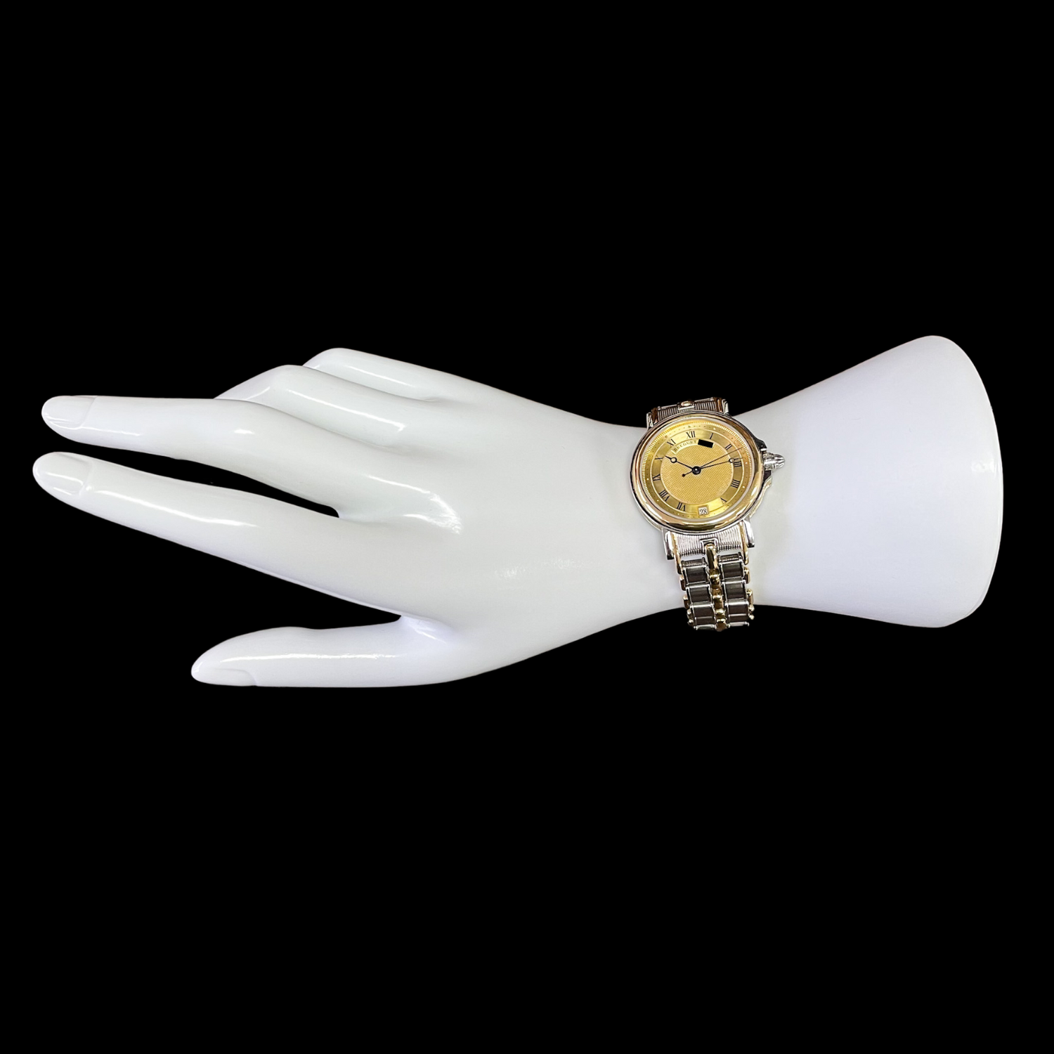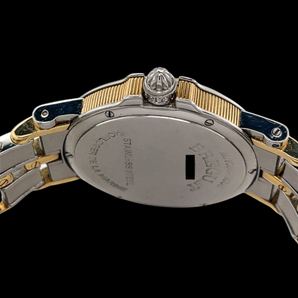 Das Breguet Armband aus Edelstahl kombiniert mit 18-karätigem Gelbgold kann bis zu einem Armumfang bis 15,5 cm getragen werden. Ein Ersatzglied gehört zum Lieferumfang.