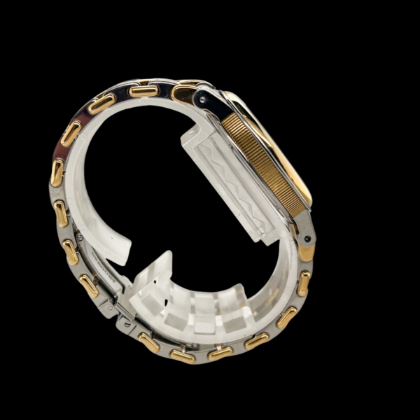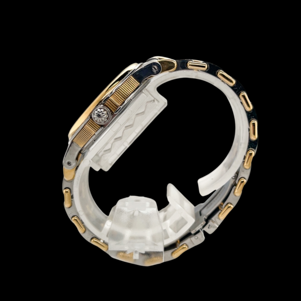 Das integrierte Armband der Marine aus Edelstahl und Gelbgold zeigt leichte Spannungsverluste und trägt – wie das Gehäuse – sichtbare, gleichmäßige Tragespuren, die den Charme dieser Uhr unterstreichen. Die aktuelle Armbandlänge beträgt ca. 15,5 cm – ein Ersatzglied zur Verlängerung liegt bei und ermöglicht die individuelle Anpassung an das Handgelenk.