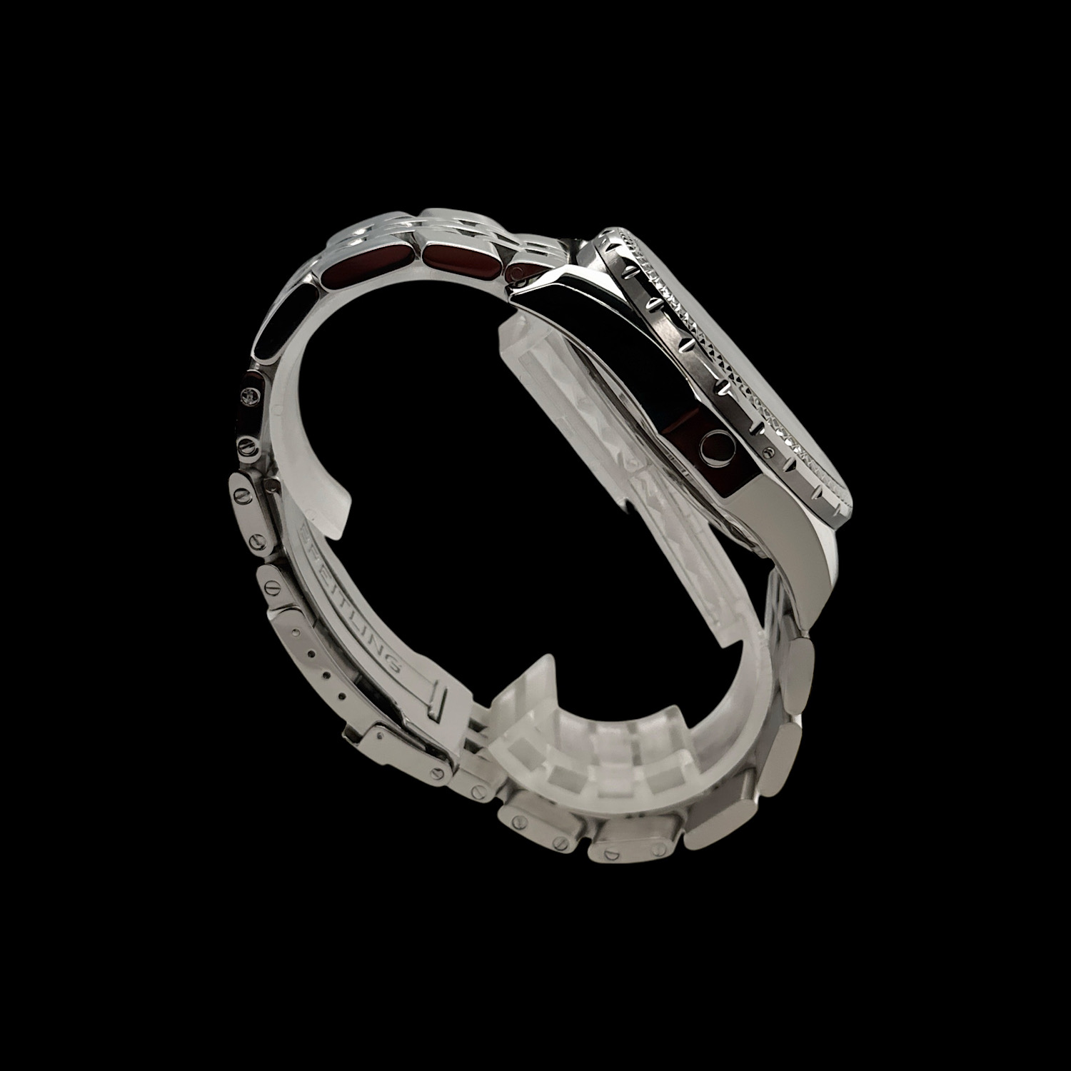 Das originale Speed Bracelet aus Edelstahl mit seiner markanten Gliederkonstruktion rundet das Gesamtbild ab und bietet hohen Tragekomfort bis zu einem Armumfang von circa 20 cm.
