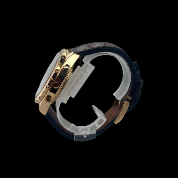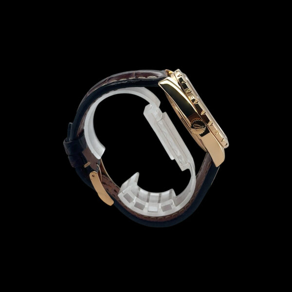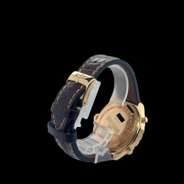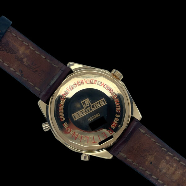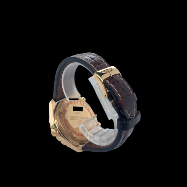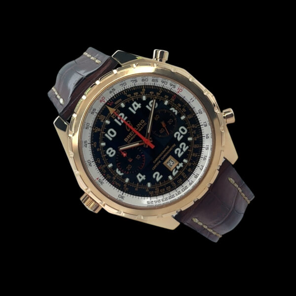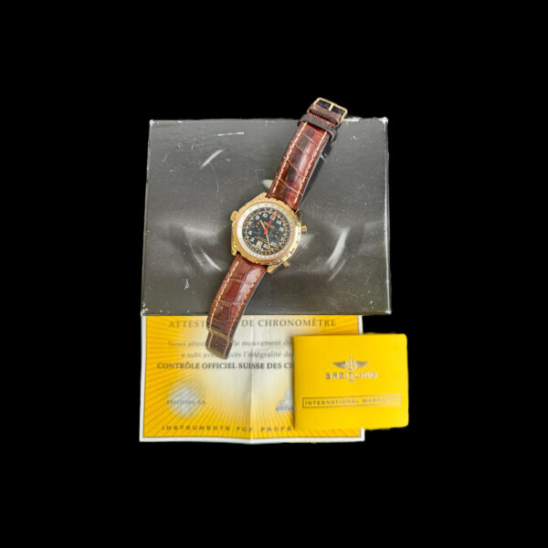 Diese seltene Roségold-Interpretation zeigt sich in bemerkenswert authentischem Zustand. Minimale Tragespuren bezeugen respektvolle Behandlung, während der noch original verklebte Rückendeckel nach dem letzten Service dokumentiert: Diese Uhr blieb seither unberührt. Das komplette Set umfasst das originale braune Lederarmband mit passender 18K-Roségold-Dornschließe sowie die vollständige Breitling-Ausstattung inklusive Klavierlackbox, Umkarton und Papieren.