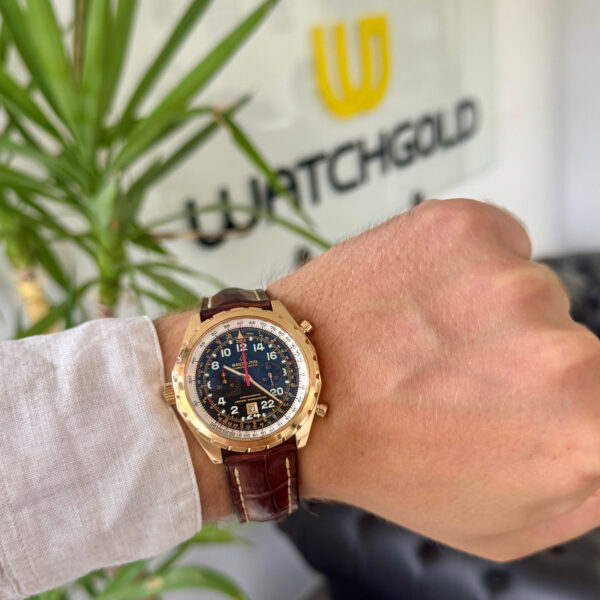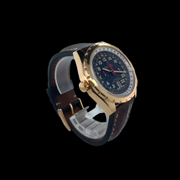 Das imposante 44-mm-Gehäuse beherrscht das Handgelenk mit der Präsenz eines echten Instrumentes. Das historische 24-Stunden-Zifferblatt und die bidirektionale Rechenschieberlünette verschmelzen klassische Fliegeruhren-DNA mit kompromisslosem Luxusanspruch. Die bewusst links positionierte Krone erinnert direkt an das bahnbrechende Kaliber 11 – jenen Meilenstein der Chronographenwelt.