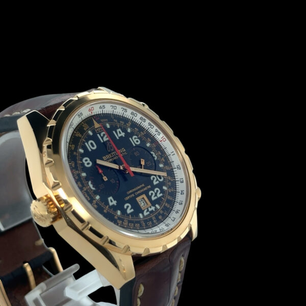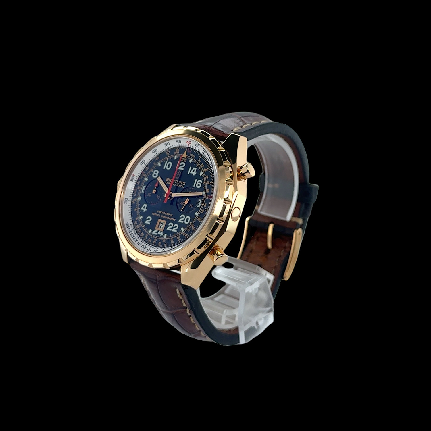 Das originale Lederband mit Dornschließe aus 18-karätigem Roségold fügt sich harmonisch in das Gesamtbild der Uhr ein und befindet sich in gepflegtem, angenehm getragenem Zustand. Auf Wunsch unterstützen wir Sie gerne bei der Suche nach einem neuen Breitling-Armband.