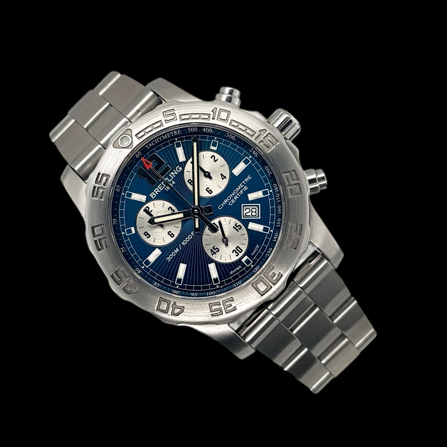 Das 44 Millimeter große Edelstahlgehäuse mit polierter Oberfläche wird von einer unidirektional drehbaren Lünette mit eingefrästen Ziffern gekrönt. Im Inneren arbeitet das COSC-zertifizierte Kaliber 73, ein thermokompensiertes SuperQuartz-Chronographenwerk, das zehnmal präziser arbeitet als herkömmliche Quarzkaliber und chronometrische Genauigkeit auf höchstem Niveau garantiert. Das markante blaue Zifferblatt mit radialem Strahlenschliff wird von drei silbernen Totalisatoren dominiert, während leuchtende Stabindizes und eine große arabische Zwölf höchste Lesbarkeit gewährleisten. Der zentrale Chronographen-Sekundenzeiger mit charakteristischer roter Spitze ermöglicht präzise Zeitmessungen bis auf Zehntelsekunden. Das Professional III Edelstahl-Gliederarmband mit Faltschließe bietet höchsten Tragekomfort.
