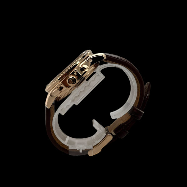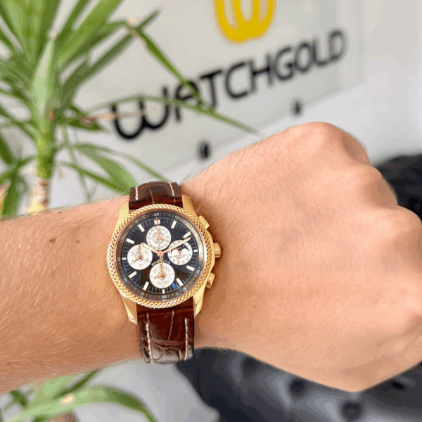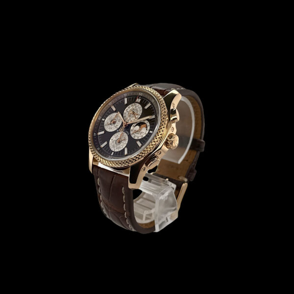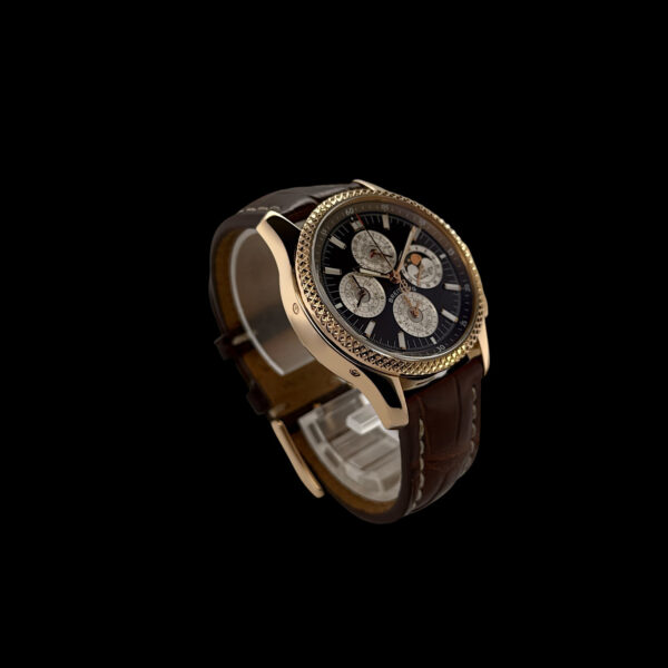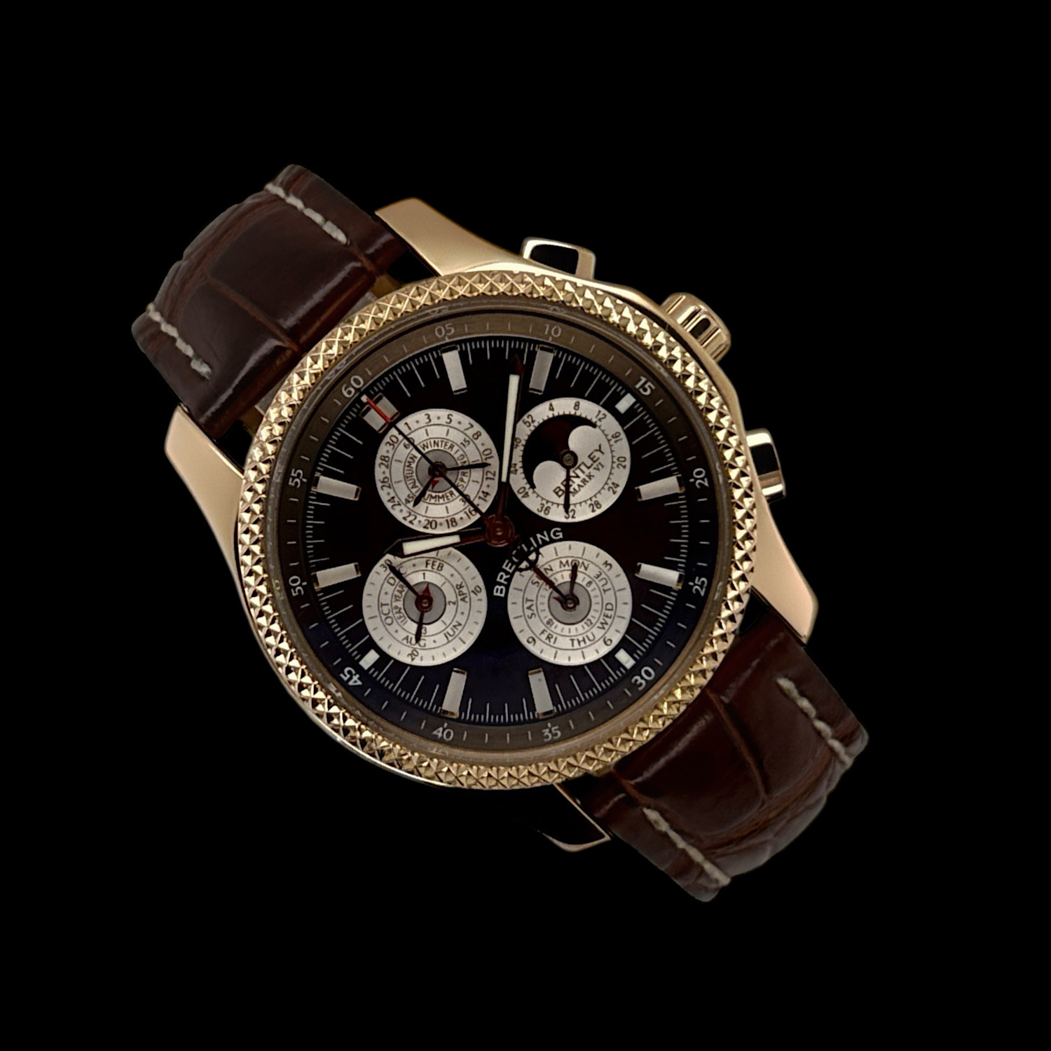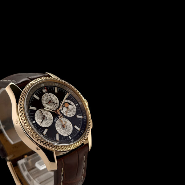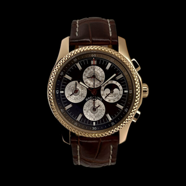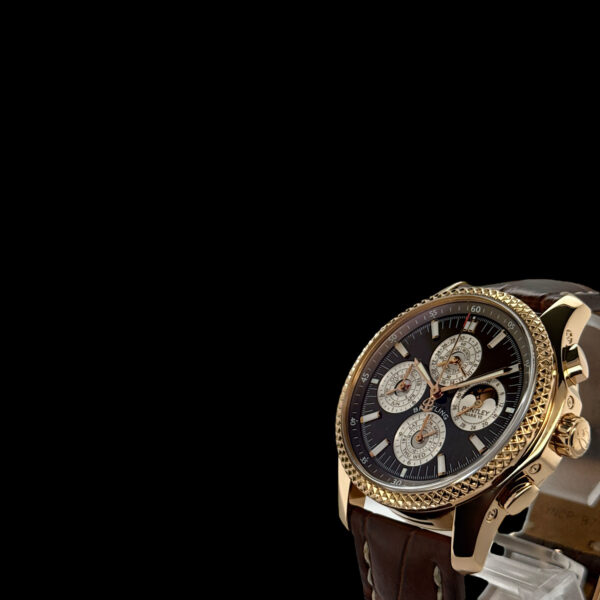 Das edle Rotgold-Gehäuse mit seinem perfekt proportionierten 42mm Durchmesser verkörpert exklusiven Luxus in seiner reinsten Form. Die charakteristische perlgeschliffene Lünette greift geschickt die klassischen Designelemente legendärer Bentley-Automobile auf und macht jeden Blick auf das Handgelenk zu einem Statement für Expertise und Stil. Mit ihren 29 Komplikationen gehört die Mark VI zu den technisch anspruchsvollsten Zeitmessern der Breitling-Geschichte. Der integrierte Chronograph, der präzise ewige Kalender und weitere hochkomplexe Funktionen demonstrieren die Virtuosität Schweizer Uhrmacherkunst auf höchstem Niveau. Das warme braune Baton-Zifferblatt sorgt dabei nicht nur für eine luxuriöse Optik, sondern gewährleistet auch bei komplexester Anzeigenvielfalt eine hervorragende Ablesbarkeit.