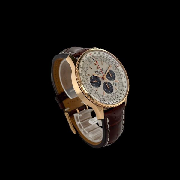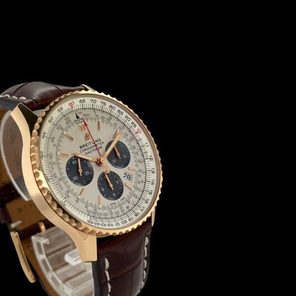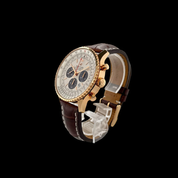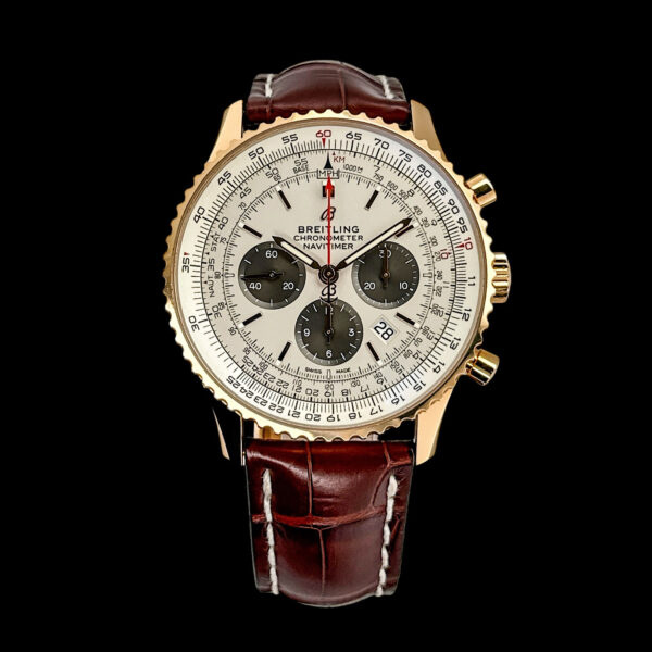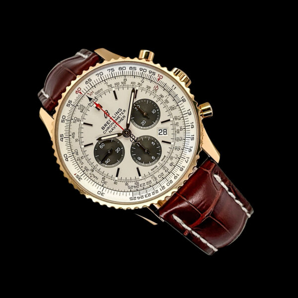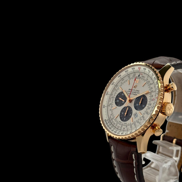 Das hier präsentierte Modell verkörpert all die charakteristischen Merkmale, die den Navitimer berühmt gemacht haben – und hebt sich gleichzeitig durch seine einzigartige Eleganz und Exklusivität hervor. Das edle Gehäuse aus 18-karätigem Roségold verleiht der Uhr einen warmen, luxuriösen Glanz, während das weiße Zifferblatt mit seinen kontrastierenden anthrazithfarbenen Totalisatoren für eine sportlich-moderne Note sorgt.