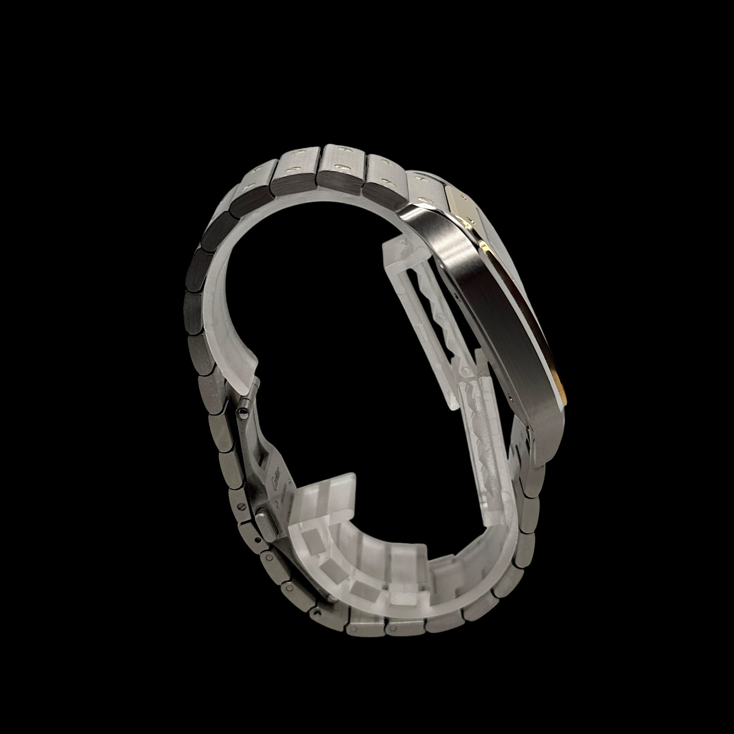 Das Gehäuse aus Edelstahl und 18-karätigem Gelbgold befindet sich in sehr gutem Zustand, minimale Tragespuren können erkennbar sein.