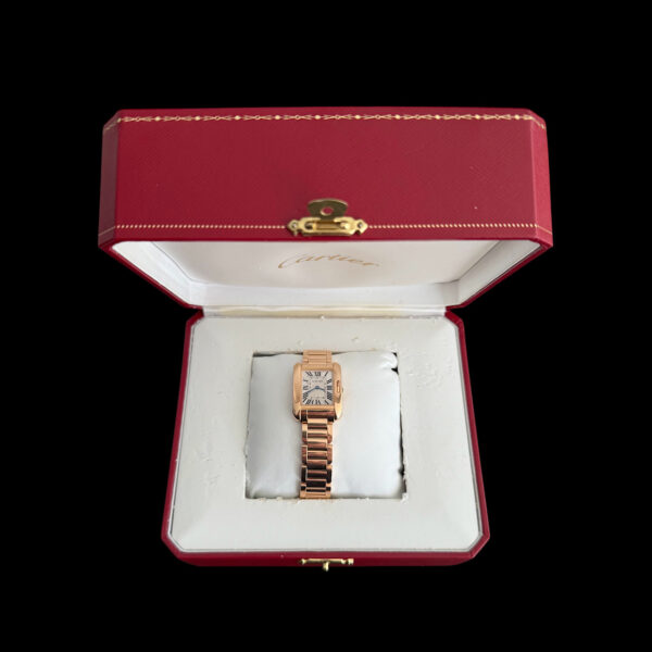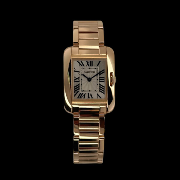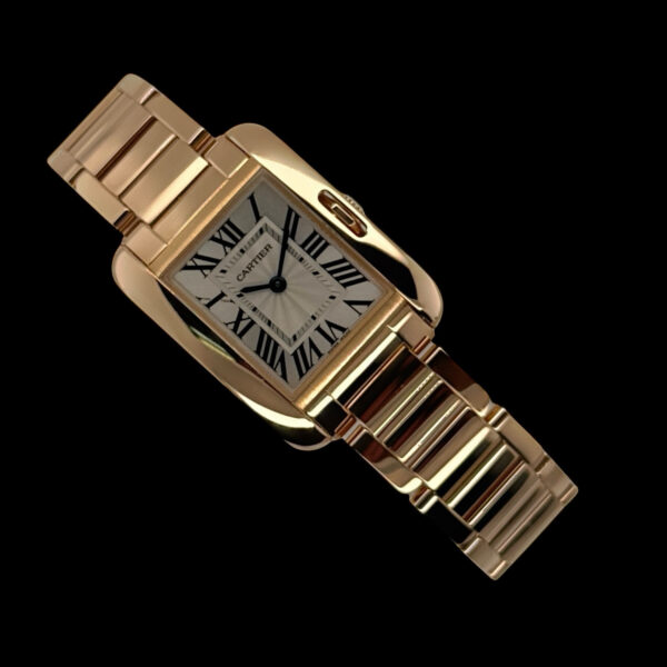 Diese Tank Anglaise ist ein echtes Schmuckstück, das zu jedem Anlass passt: elegant fürs Business, stilvoll für besondere Momente. In dieser Roségold-Ausführung mit Massivarmband ist sie besonders selten und begehrt.