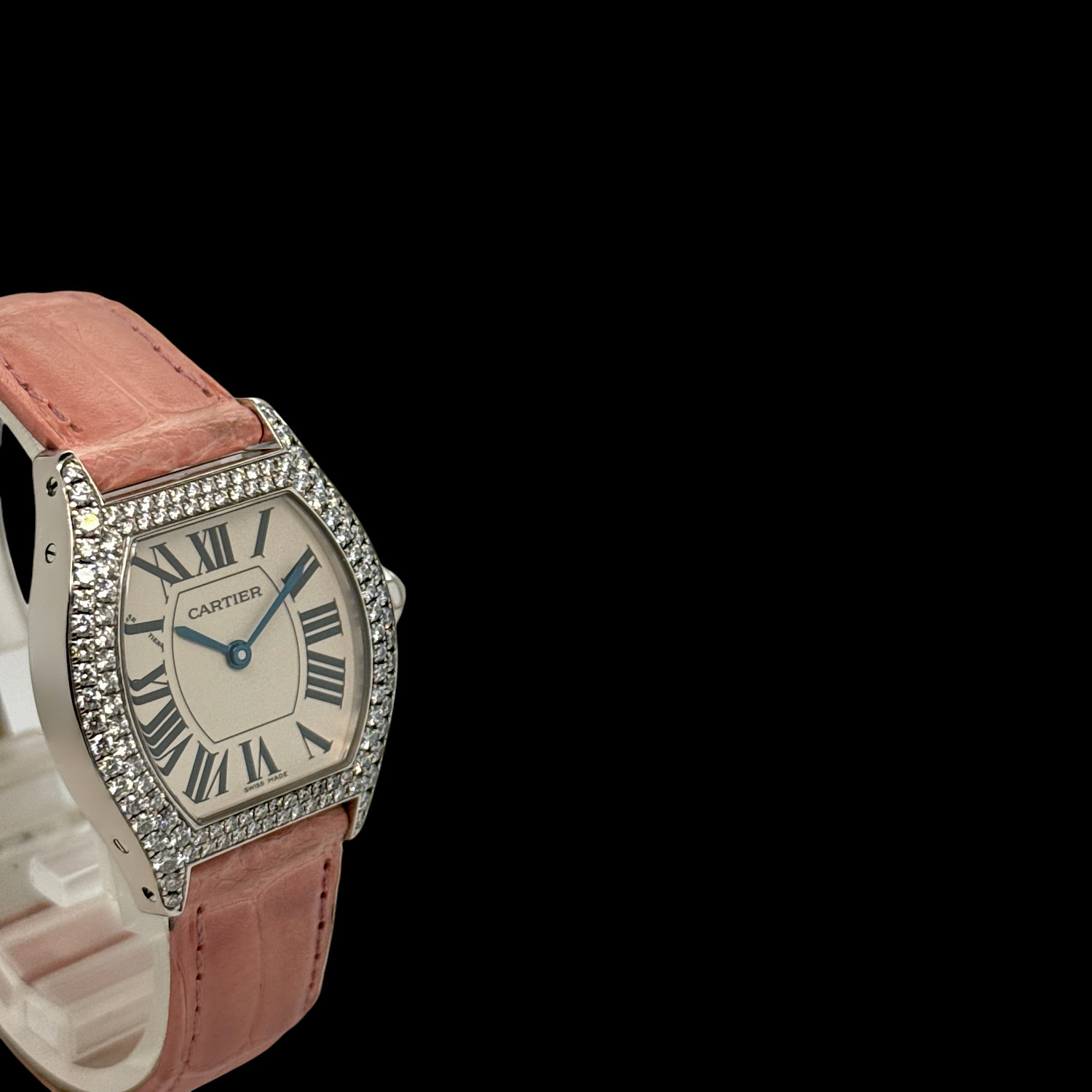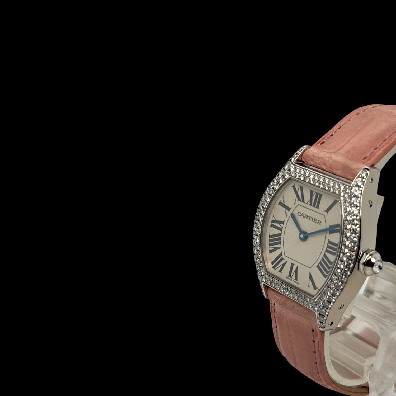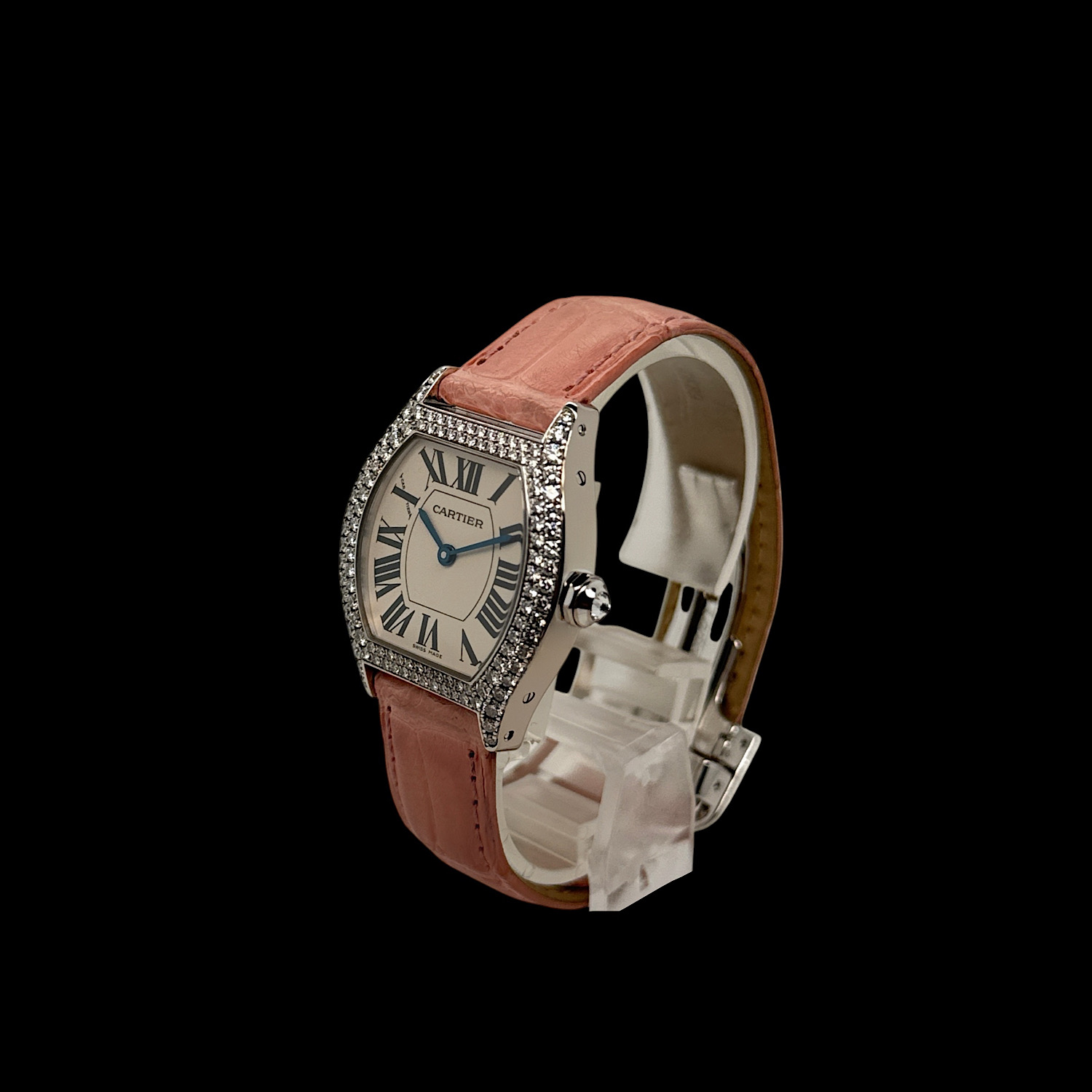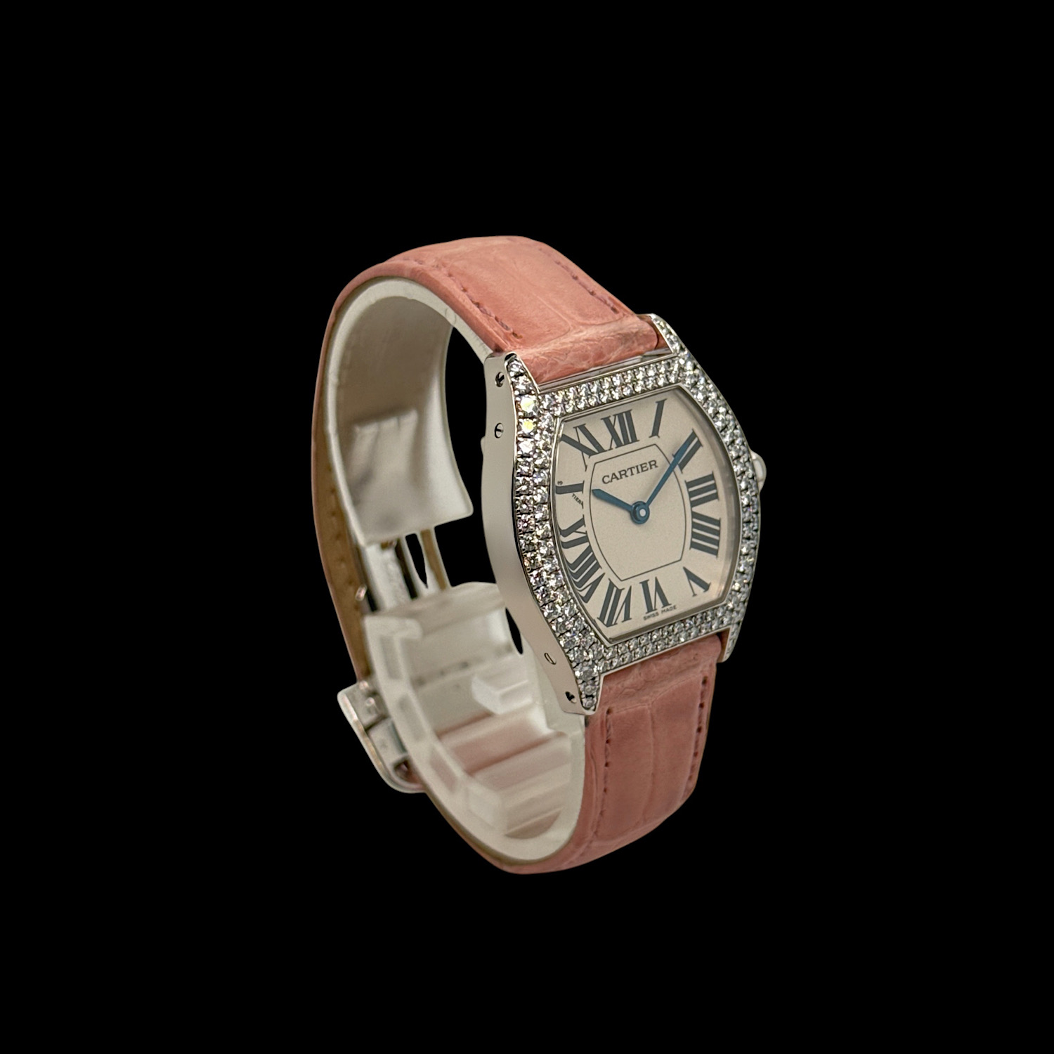 Mit ca. 26 × 28 mm liegt die Tortue leicht und feminin am Arm, das rosa Lederarmband mit originaler Faltschließe in 18-karätigem Weißgold schmiegt sich weich an die Haut. Das präzise Quarzwerk läuft zuverlässig im Hintergrund – diese Uhr will getragen werden, nicht in der Vitrine warten.