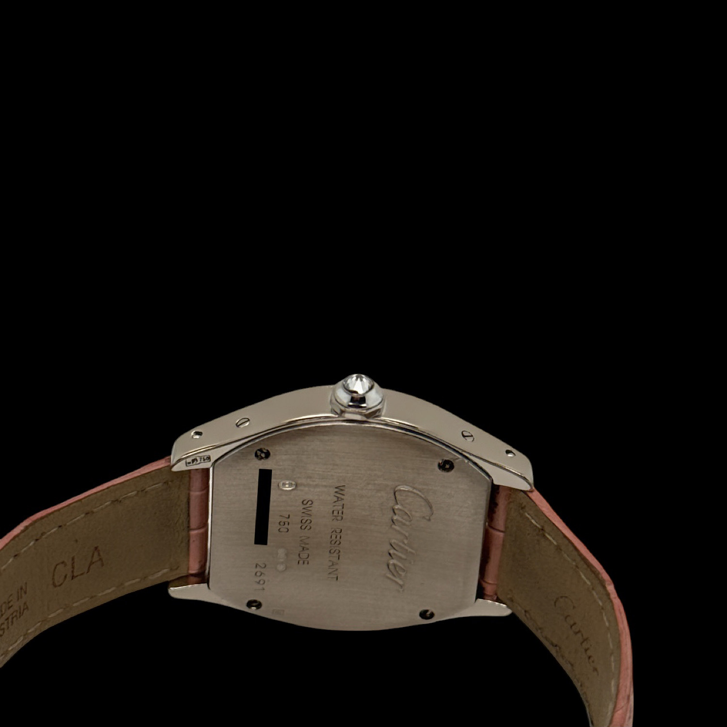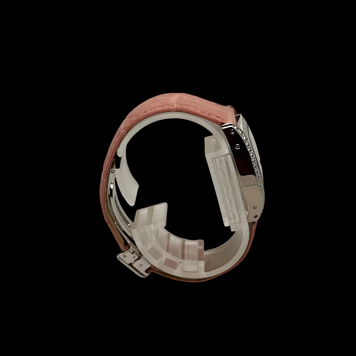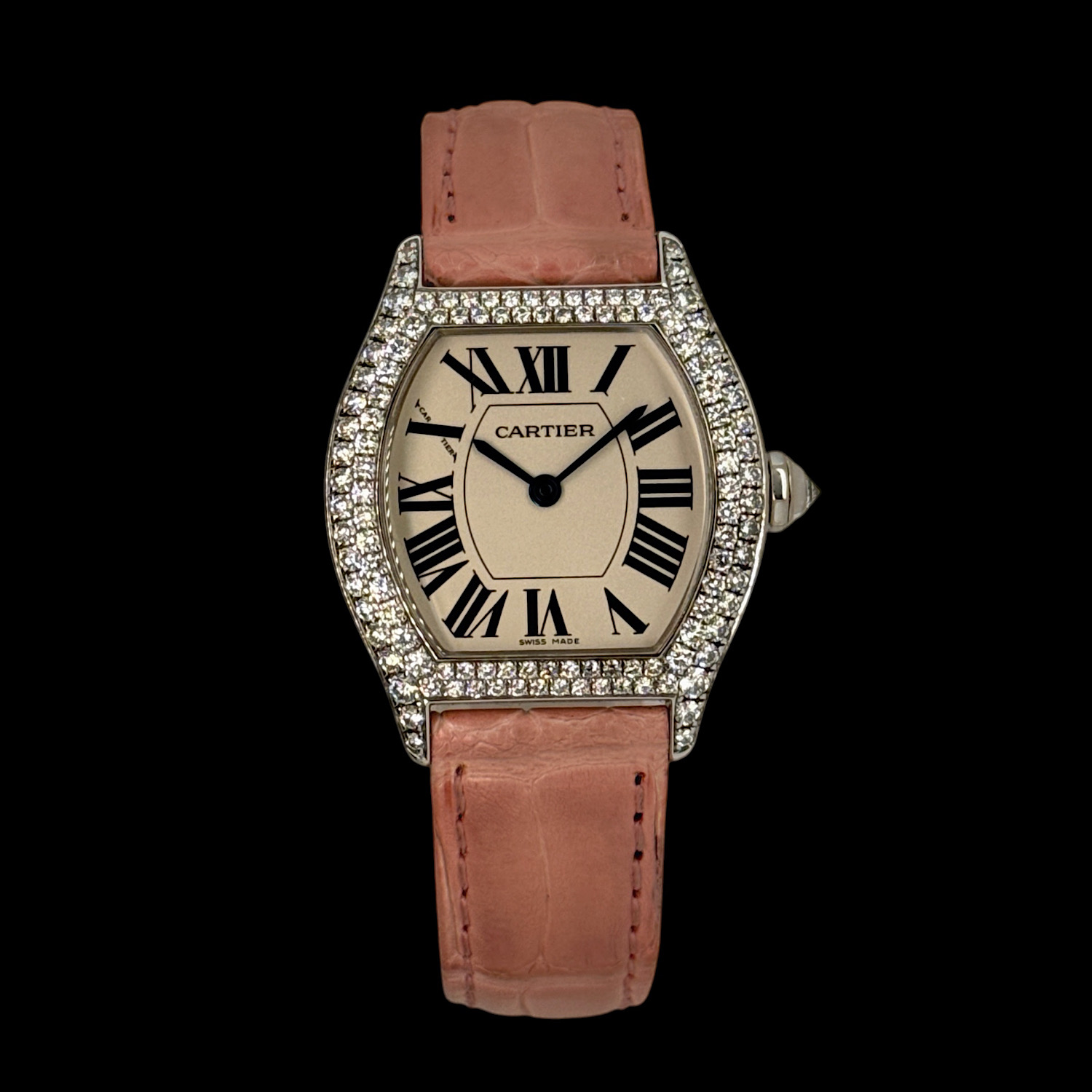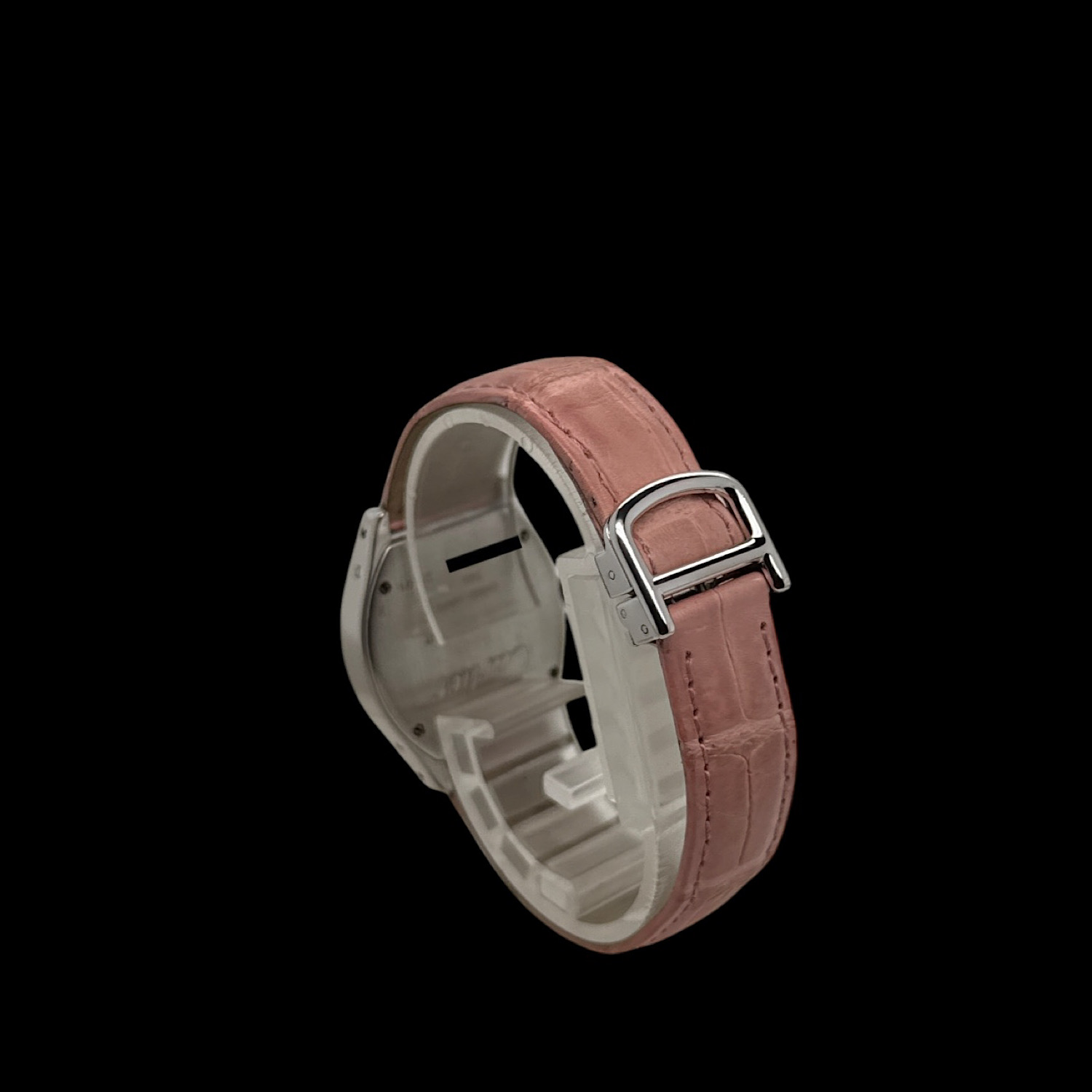 Mit ca. 26 × 28 mm liegt die Tortue leicht und feminin am Arm, das rosa Lederarmband mit originaler Faltschließe in 18-karätigem Weißgold schmiegt sich weich an die Haut. Das präzise Quarzwerk läuft zuverlässig im Hintergrund – diese Uhr will getragen werden, nicht in der Vitrine warten.