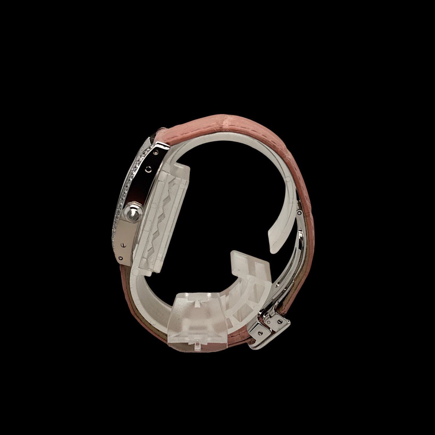 Das rosafarbene Cartier Lederarmband mit der passenden Faltschließe aus 18-karätigem Weißgold zeigt sich mit dezenten Tragespuren in gutem Zustand.