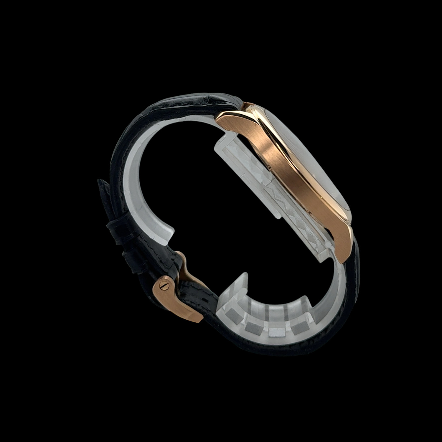 Das 43 mm große Gehäuse aus 18-karätigem Roségold verleiht der Uhr mit seiner flachen Bauweise von nur 3,1 mm Höhe eine edle Ausstrahlung, ohne aufdringlich zu wirken. Das vertikal gebürstete, silberfarbene Zifferblatt zeigt klassische Eleganz, dezent akzentuiert durch roségoldene Zeiger und aufgesetzte Indizes. Die geschickt platzierte Gangreserveanzeige bei 12 Uhr sowie das kleine Sekundenzifferblatt mit Datum bei 6 Uhr sorgen für perfekte Harmonie und unterstreichen den zeitlosen Charakter dieser besonderen Uhr.