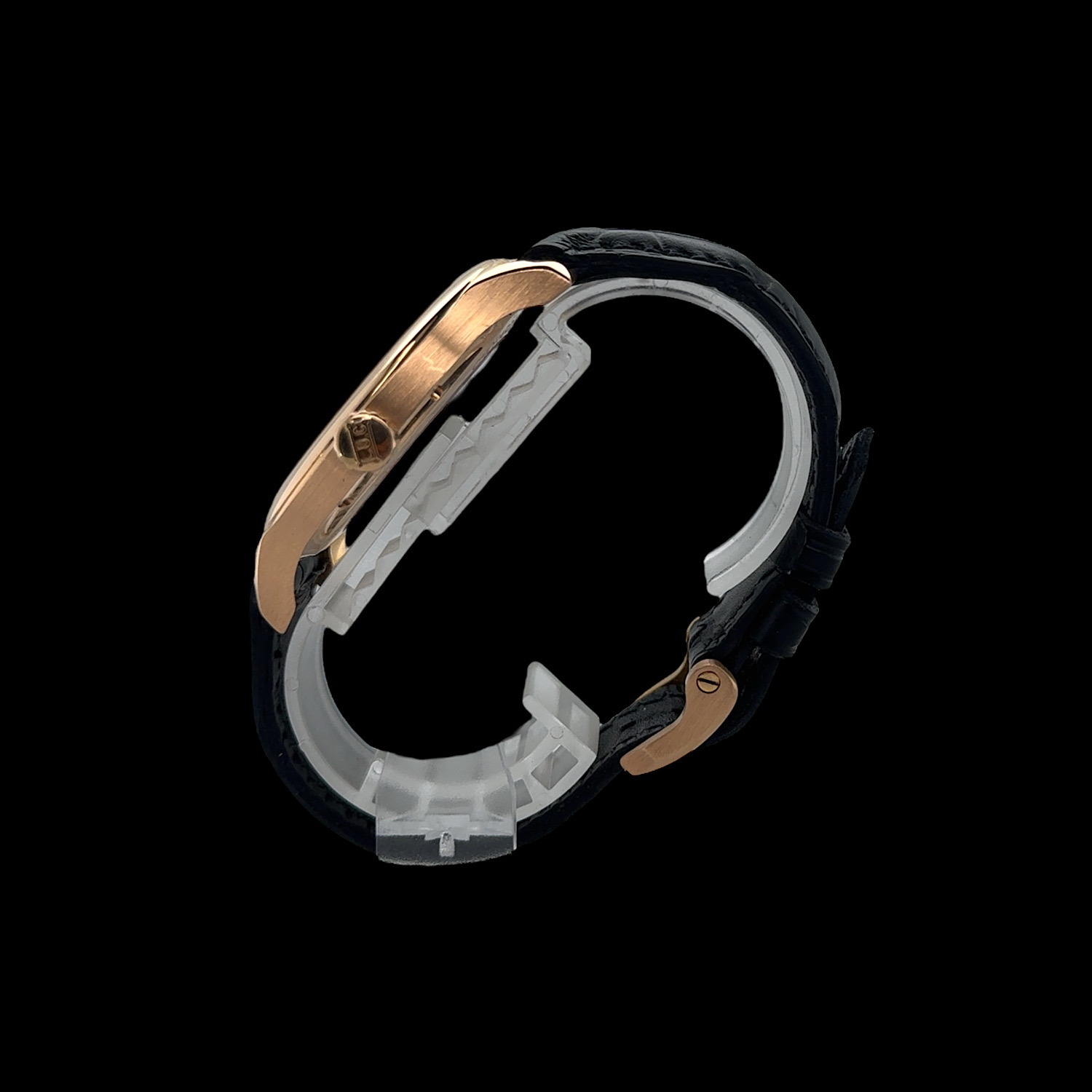 Das elegante schwarze Lederarmband mit roségoldener Dornschließe rundet das Gesamtbild perfekt ab. Diese exklusive Uhr richtet sich an Liebhaber mechanischer Meisterwerke, die in ihrer Armbanduhr mehr als nur ein Accessoire sehen – sondern ein Zeichen für Stilbewusstsein, technisches Verständnis und Sinn für wahre Werte.