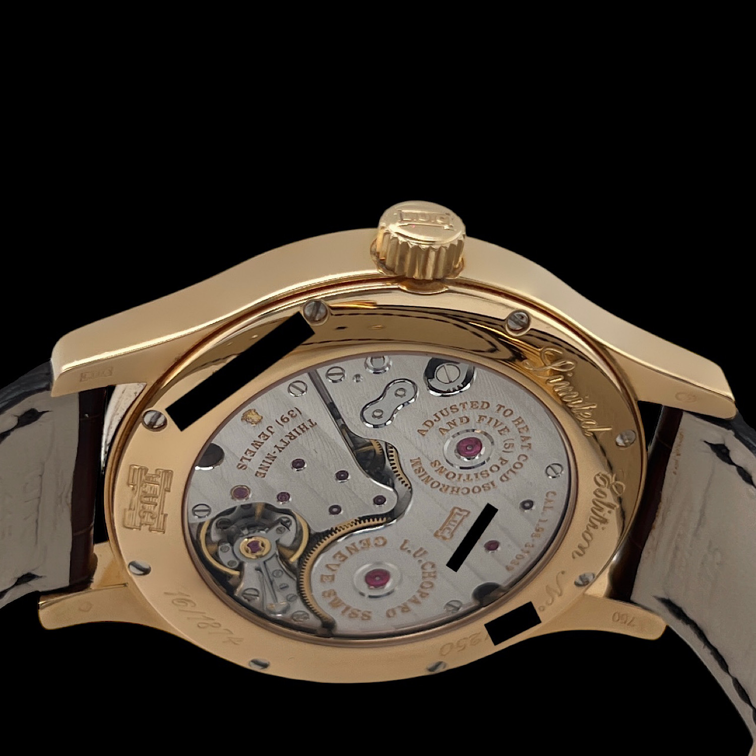 Im Inneren schlägt das fein dekorierte Manufakturkaliber L.U.C 1.98-37089 – ein Handaufzugswerk mit der innovativen Quattro-Technologie. Vier Federhäuser ermöglichen eine beeindruckende Gangreserve von acht Tagen. Das Werk trägt sowohl das COSC-Chronometerzertifikat als auch das begehrte Poinçon de Genève, die gemeinsam für Präzision, Genfer Herkunft und höchste Finissage bürgen.