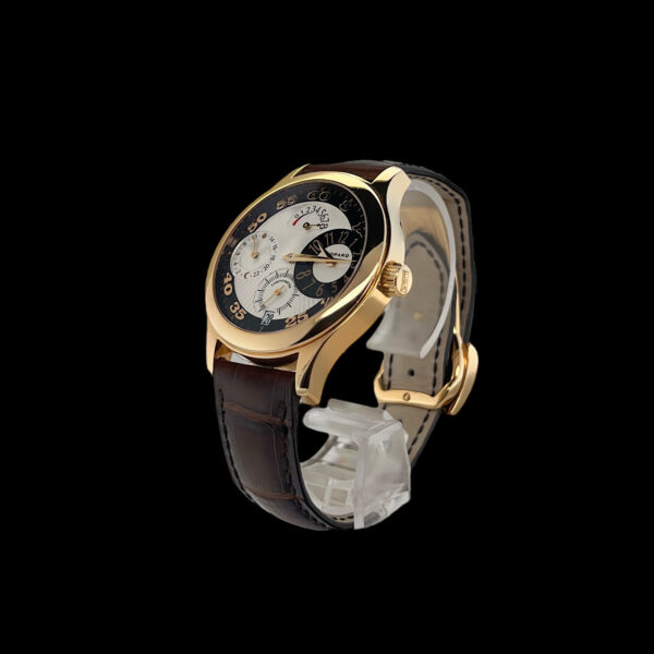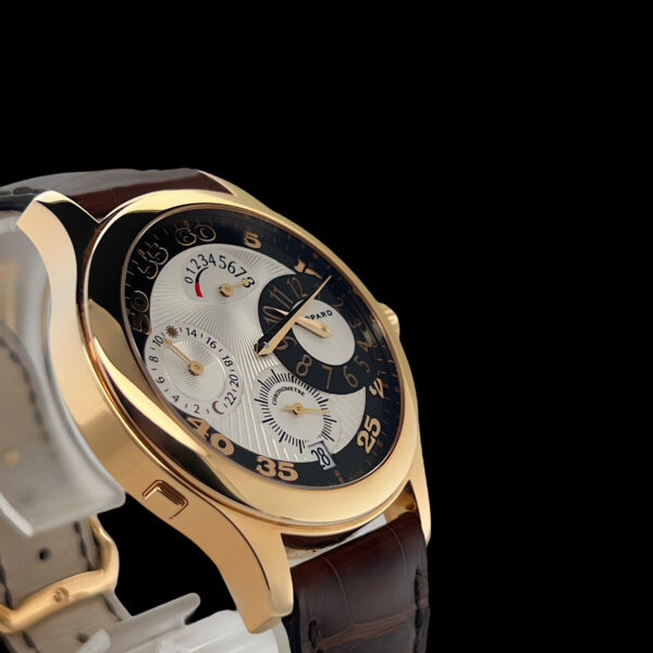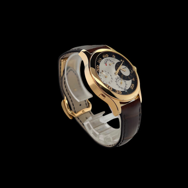 Das ca. 40 mm große Gehäuse aus 18-karätigem Gelbgold umschließt ein charakterstarkes Régulateur-Zifferblatt mit zentraler Minutenanzeige, separater Stundenanzeige bei drei Uhr und kleiner Sekunde mit 24-Stunden-Anzeige bei neu Uhr. Die Gangreserveanzeige auf zwölf Uhr und das präzise Datum bei sechs Uhr verleihen dem Zifferblatt eine harmonische, symmetrische Struktur von bemerkenswerter Klarheit.