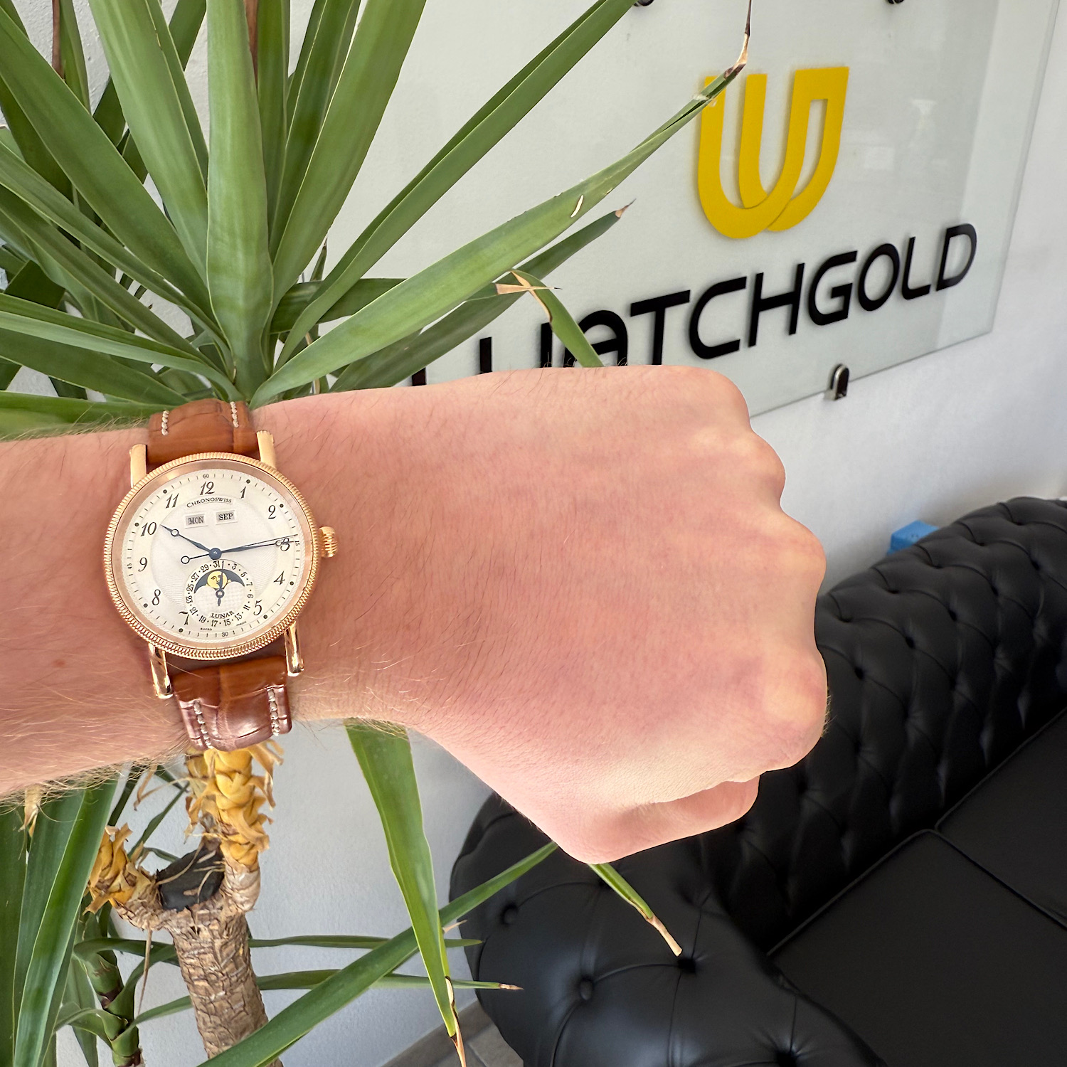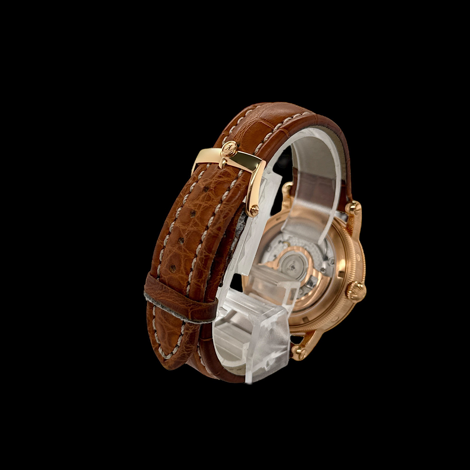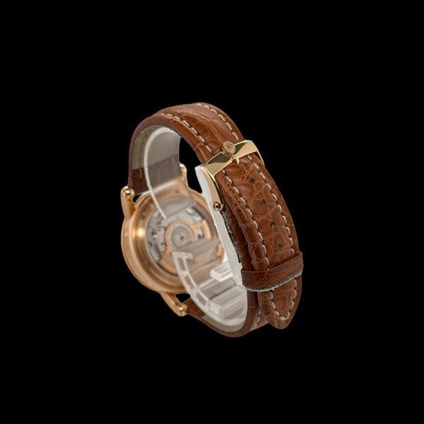 Montiert ist das originale Lederband mit Chronoswiss-Dornschließe aus 18-karätigem Roségold. Band und Schließe präsentieren sich in sehr gutem Erhaltungszustand.