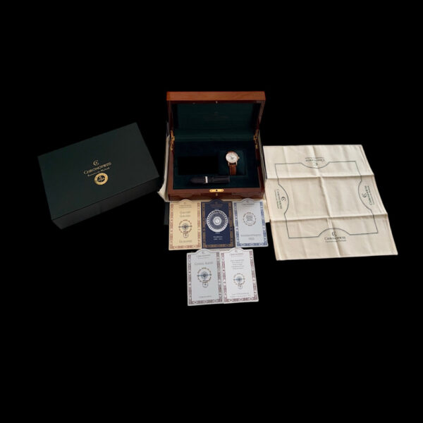 Zustand und Ausstattung: Sehr gut erhaltenes Exemplar am originalen Lederband mit signierter Chronoswiss-Dornschließe. Das komplette Set umfasst Box, Umkarton und alle Papiere (bitte beachten Sie die Bilder) – perfekt für Sammler, die Wert auf Authentizität und Vollständigkeit legen.
