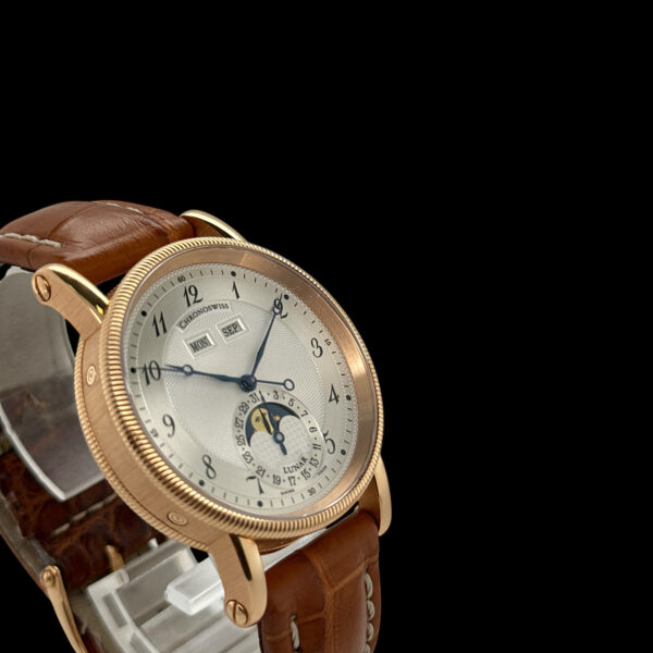 Die Chronoswiss Lunar Ref. CH 9321 R vereint traditionelle Uhrmacherkunst mit raffinierter Komplikationstechnik. Das edle 38mm Gehäuse aus 18-karätigem Roségold wird von der charakteristischen Zwiebelkrone und fein gerändelten Lünetten geprägt. Das kunstvolle guillochierte Silberzifferblatt mit klassischen Breguet-Ziffern verleiht dieser Luxusuhr zeitlose Eleganz.