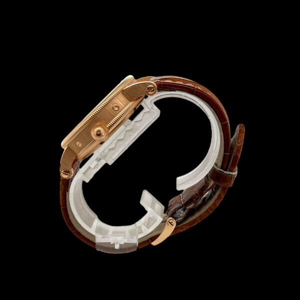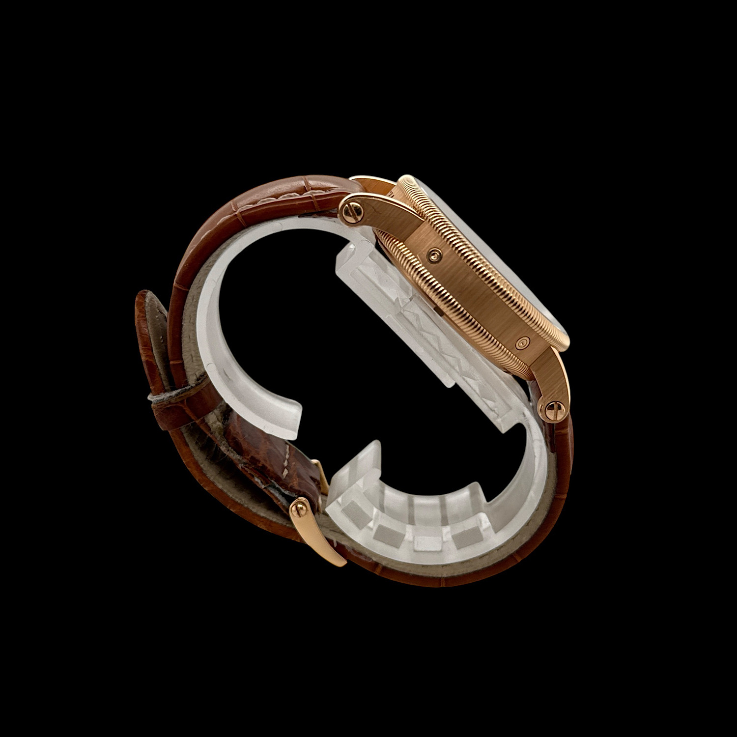Der Gesamtzustand des geriffeltes Gehäuses aus 18-karätigem Roségold ist sehr gut mit lediglich leichten Tragespuren.