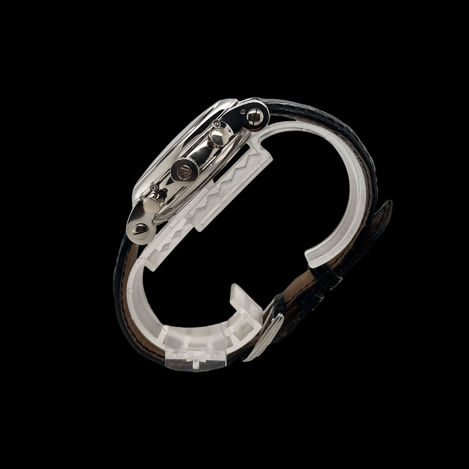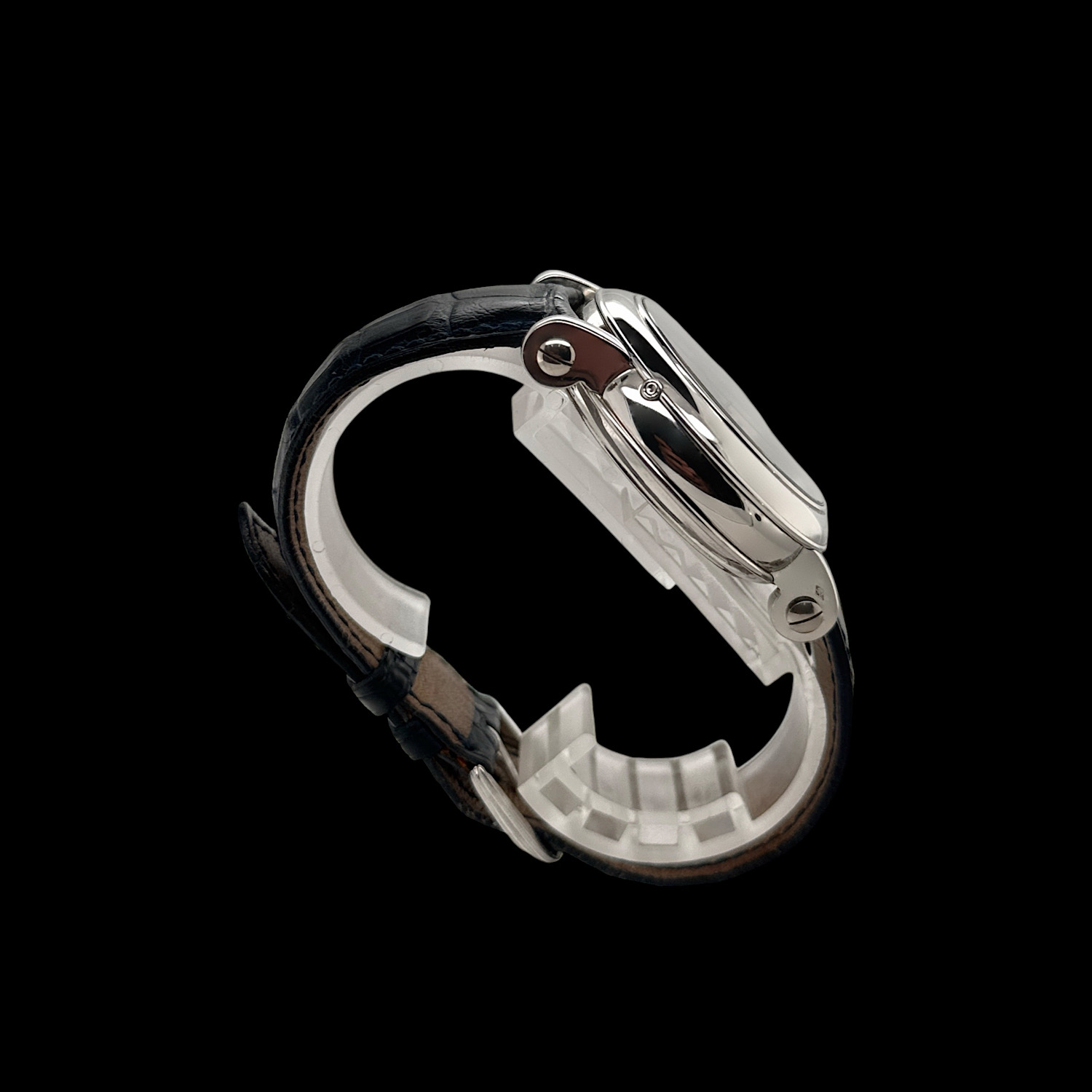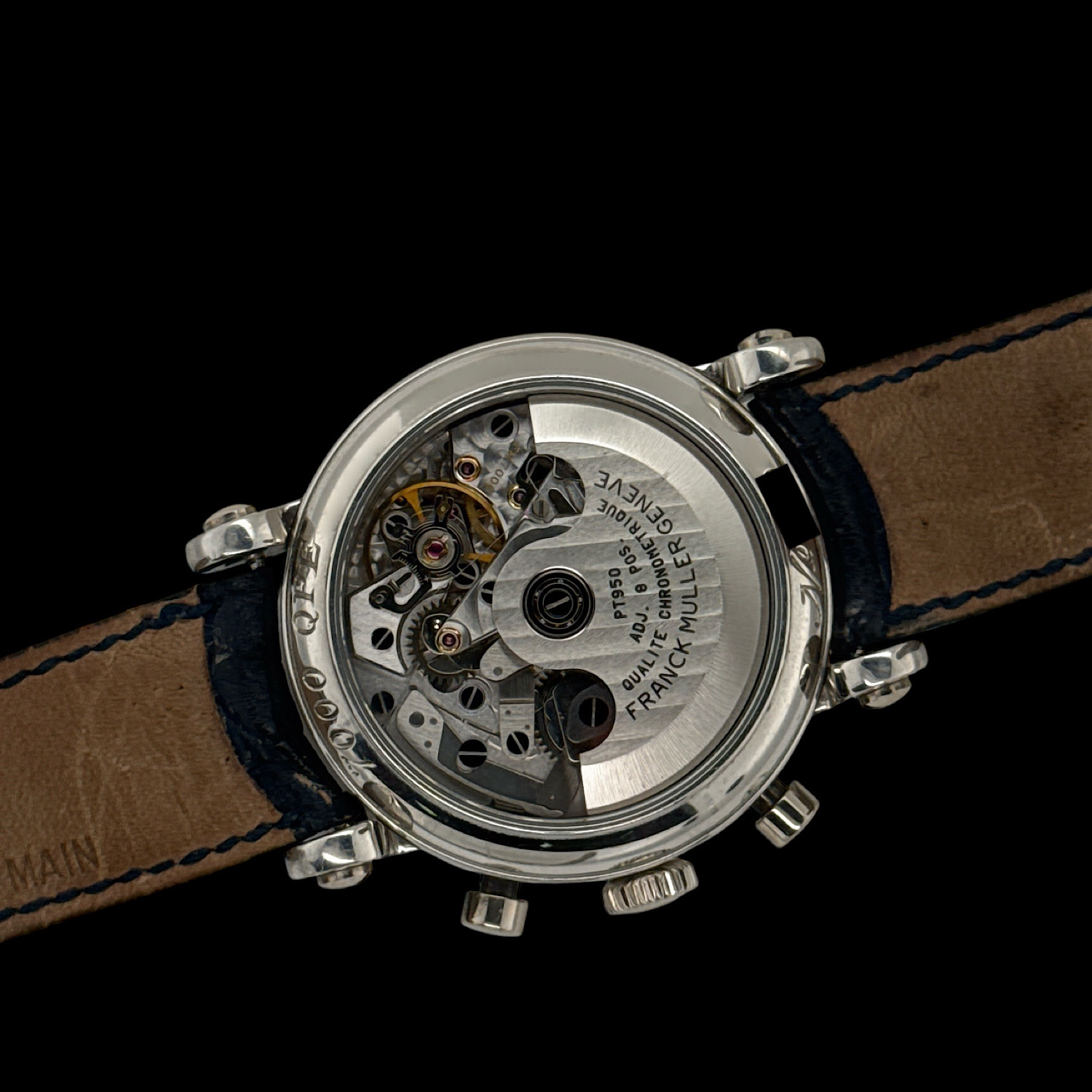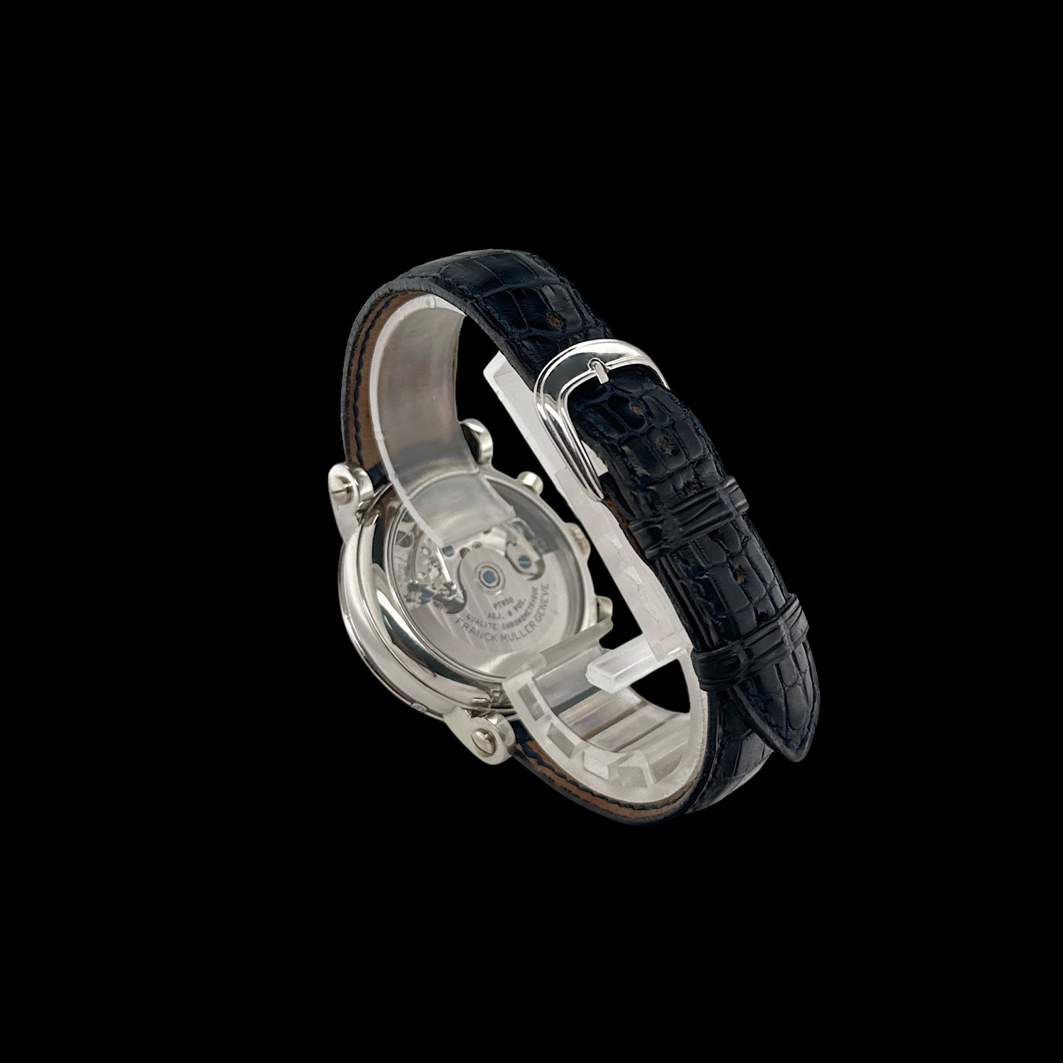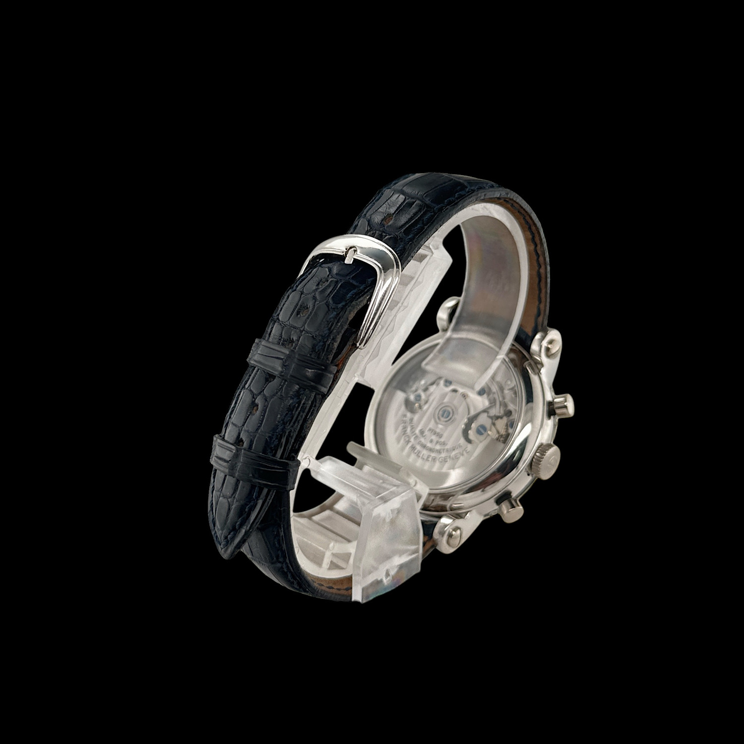Das Franck Muller Lederarmband zeigt leichte Tragespuren. Die originale Dornschließe aus 950er Platin ist montiert.