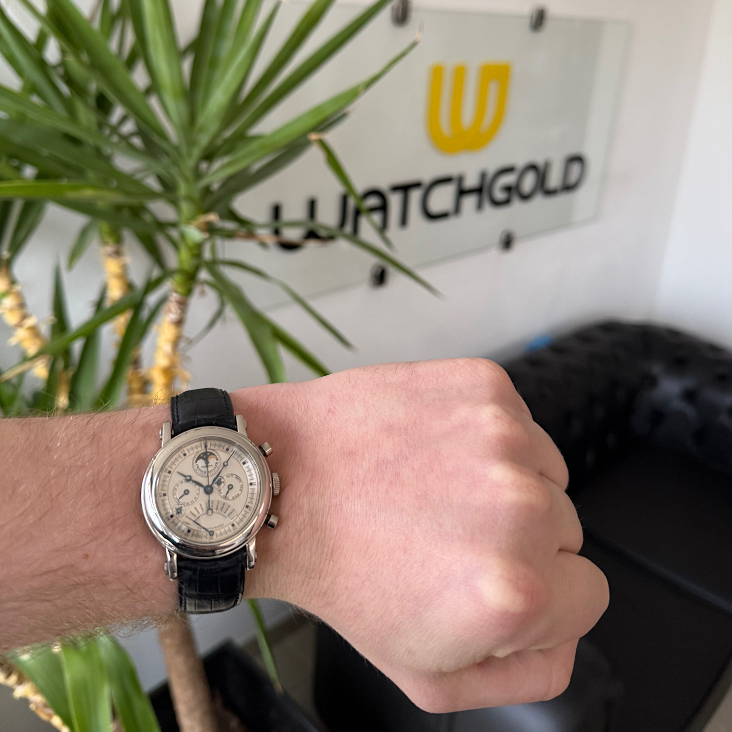 Das hier präsentierte Exemplar der Round Perpetual Calendar Retrograde Chronograph Single Face, Referenz 7000 QPE, besticht durch sein dezentes Platingehäuse von 42 mm Durchmesser. Während ewige Kalender mit Chronograph durchaus bekannt sind, offenbart ein genauer Blick auf das Zifferblatt die wahre Besonderheit: Die retrograde Monatsanzeige bei sechs Uhr integriert zusätzlich die seltene Equation of Time – die Anzeige der Differenz zwischen Sonnenzeit und mittlerer Zeit. Mondphase, Wochentag, Datum, Schaltjahresanzeige und Chronograph fügen sich stilsicher in das durchdachte Zifferblattlayout. Das hauseigene Kaliber 7000 mit Handaufzug überzeugt mit einer Amplitude von 304 Grad und einer minimalen Gangabweichung von minus zwei Sekunden täglich. Das schwarze Lederarmband mit Platin-Faltschließe rundet die elegante Erscheinung ab.