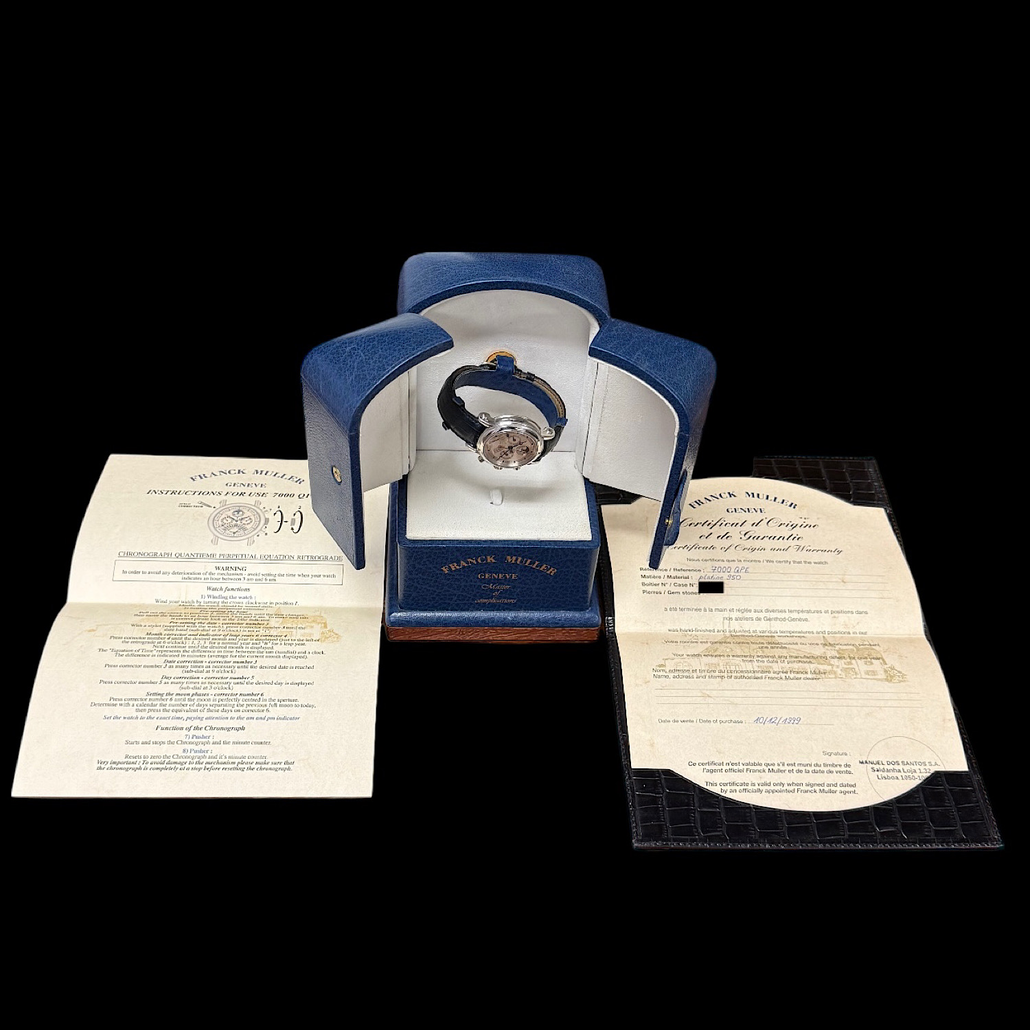 Der Lieferumfang umfasst den originalen Franck Muller Uhrenbeweger, der die kontinuierliche Funktion aller Komplikationen gewährleistet, sowie die vollständigen Originalpapiere in der charakteristischen Ledermappe.