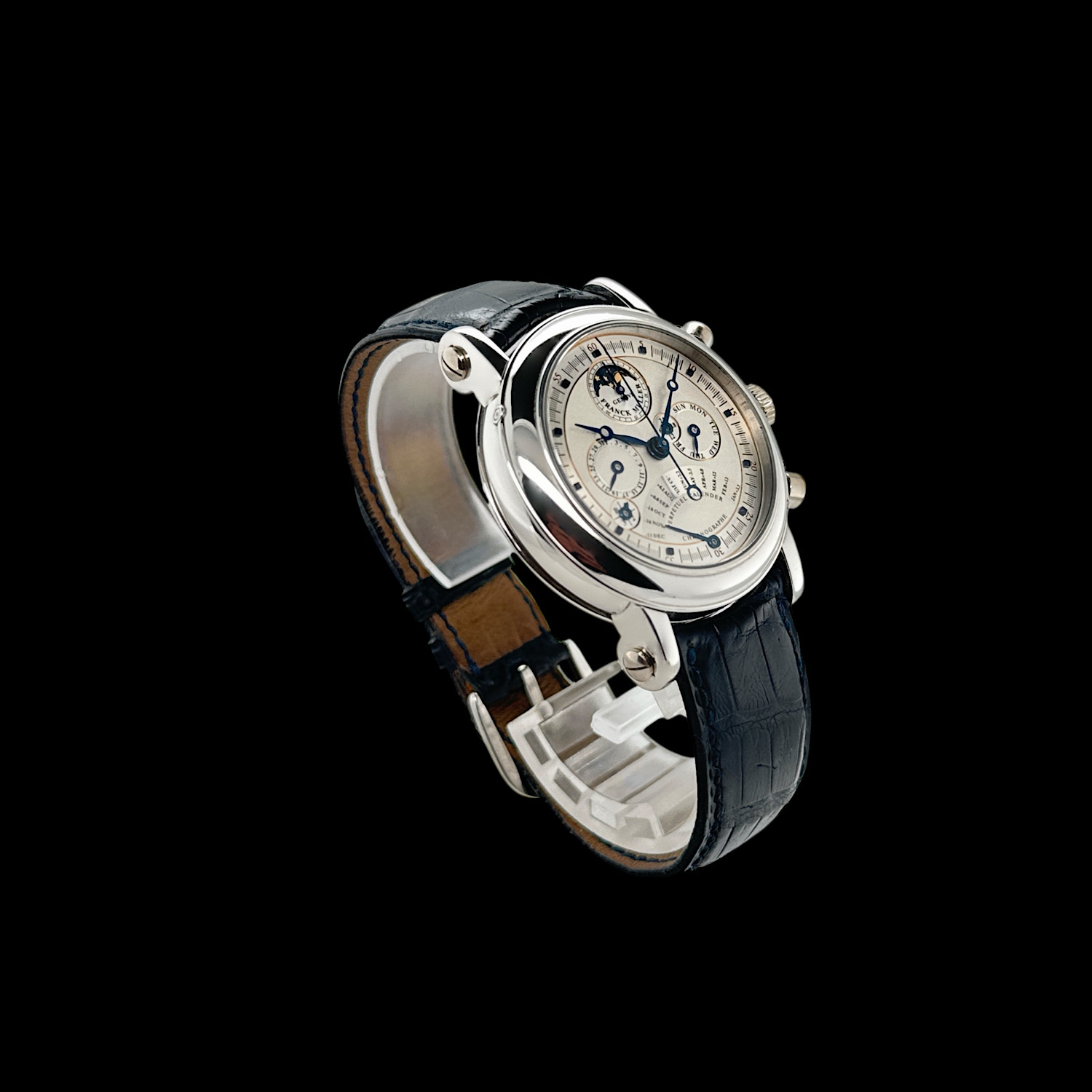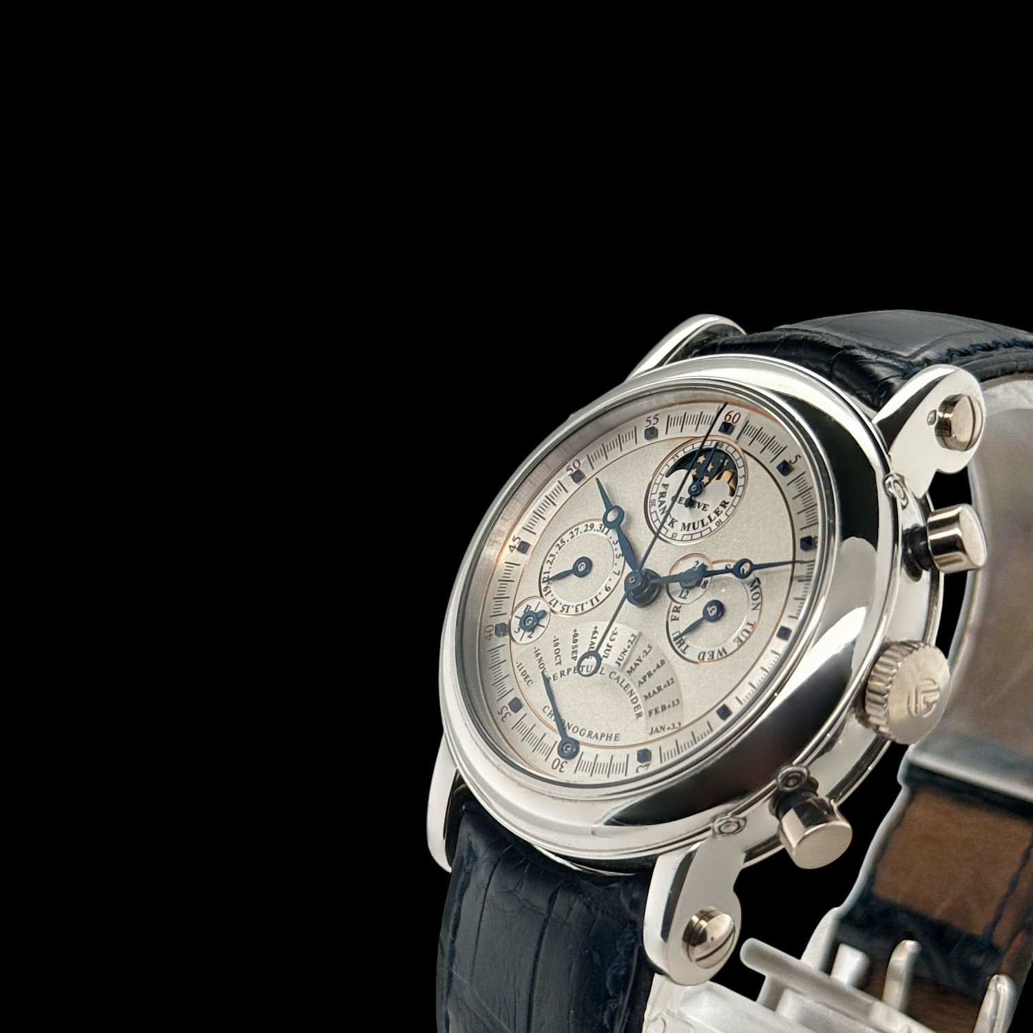 Mit ihrer seltenen Kombination aus ewigem Kalender, retrograder Monatsanzeige mit Equation of Time und Chronograph ist diese Franck Muller ein faszinierendes Meisterwerk für anspruchsvolle Sammler.