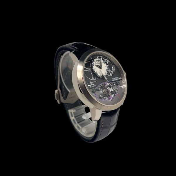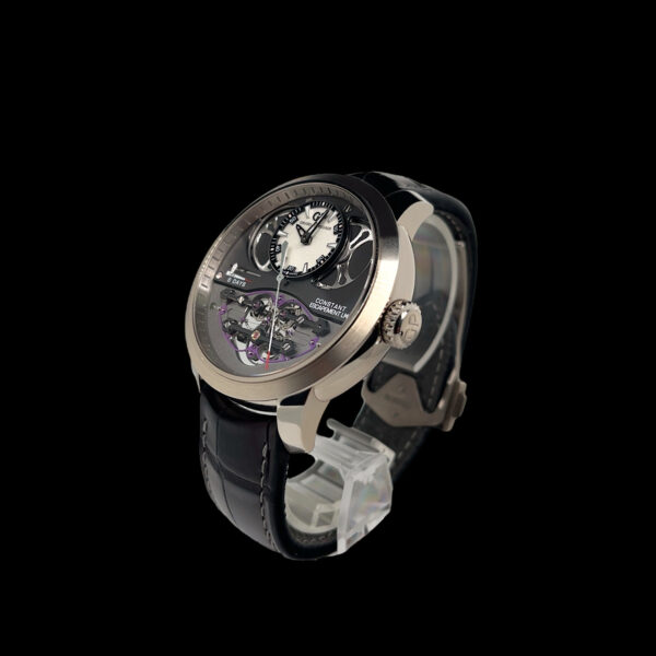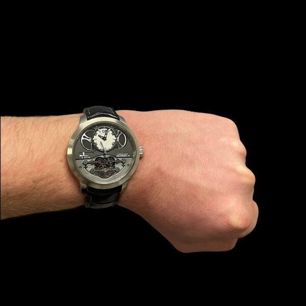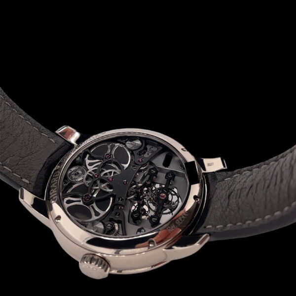 Das Gehäuse aus 18-karätigem Weißgold umschließt das zweifarbig graue Zifferblatt, dass den Blick auf die Brücken und den Tourbillon genießen lässt. Das dezentrale Zwei-Zeiger-Zifferblatt und die Gangreserveanzeige heben diese Uhr auch konzeptionell von anderen Modellen am Markt ab.