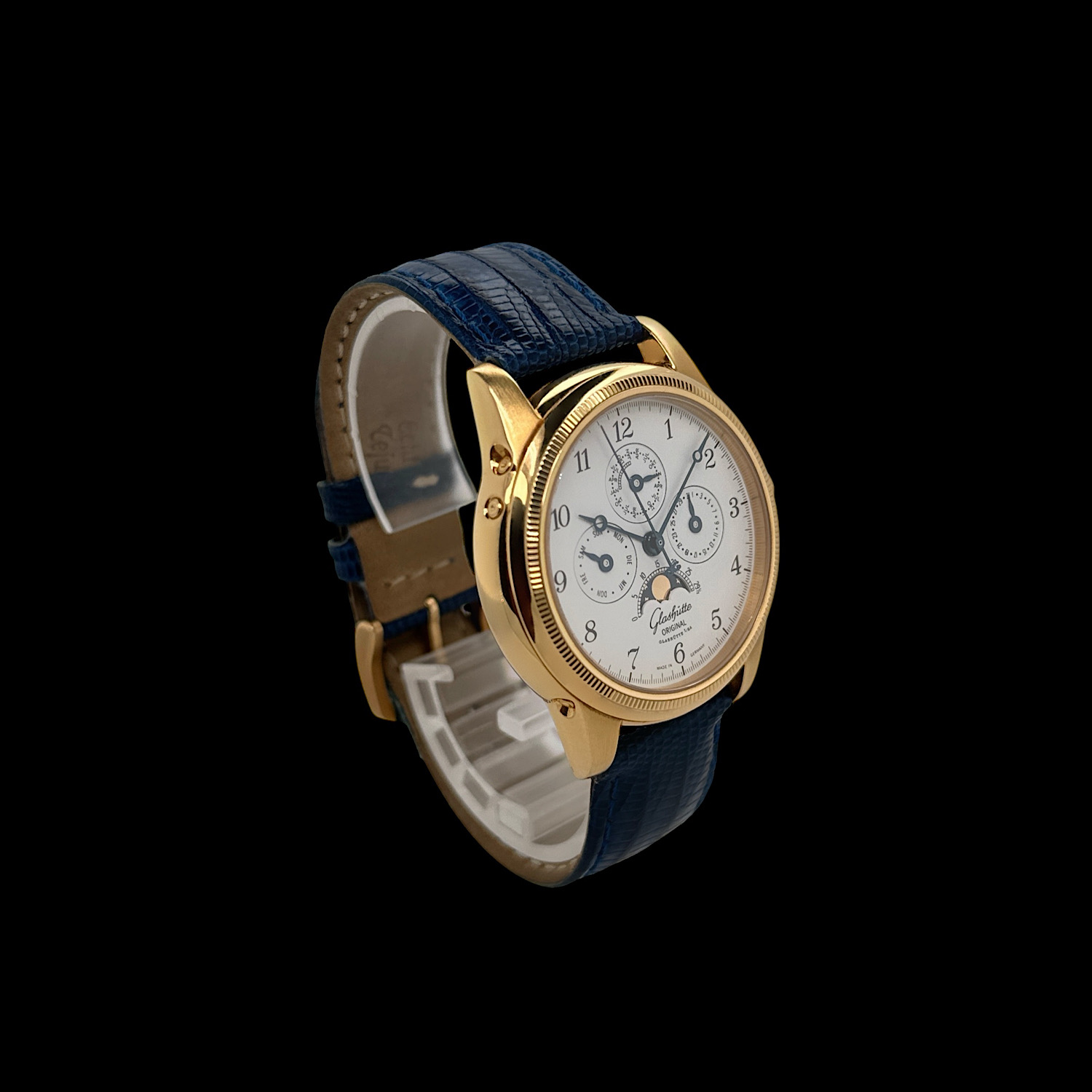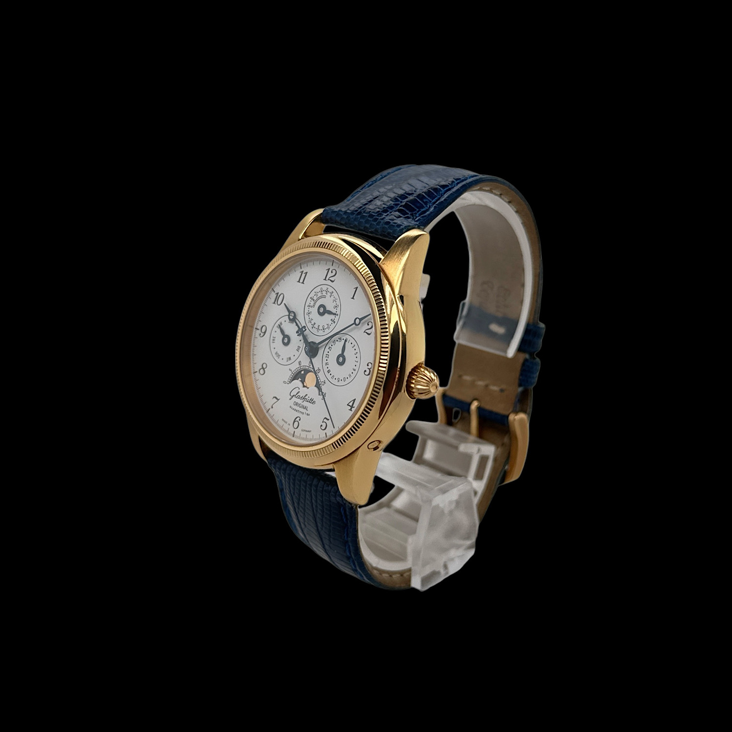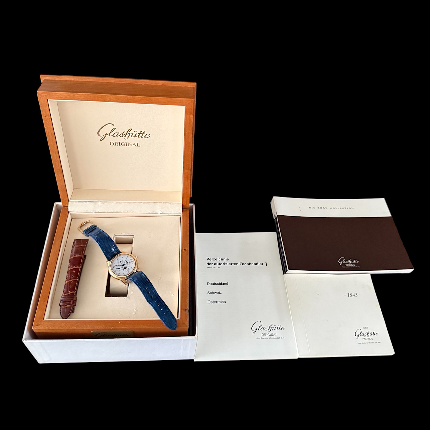 - Lieferumfang: Glashütte Original Uhrenbox inkl. Umkarton, Papiere, Händlerverzeichnis, Bedienungsanleitung, historische Preisliste von 1998