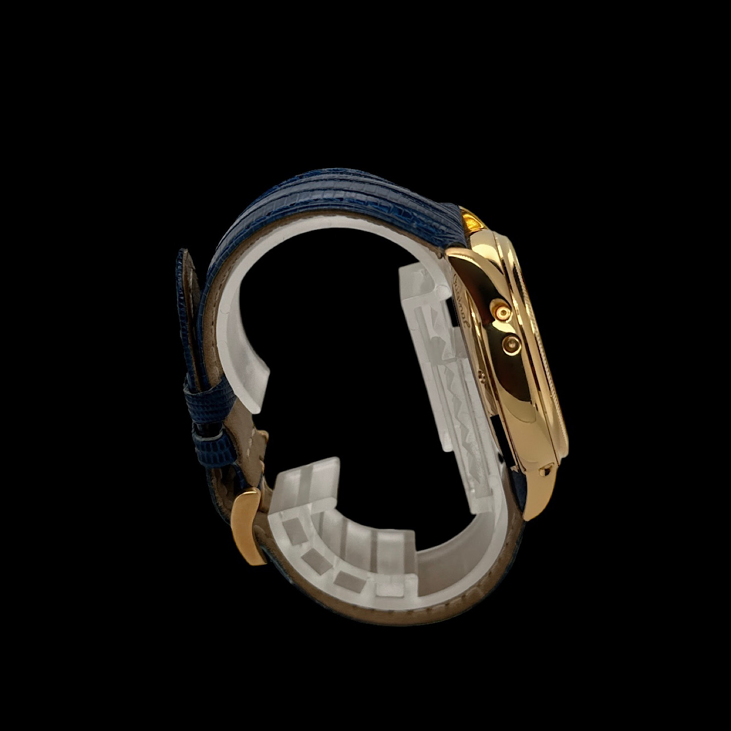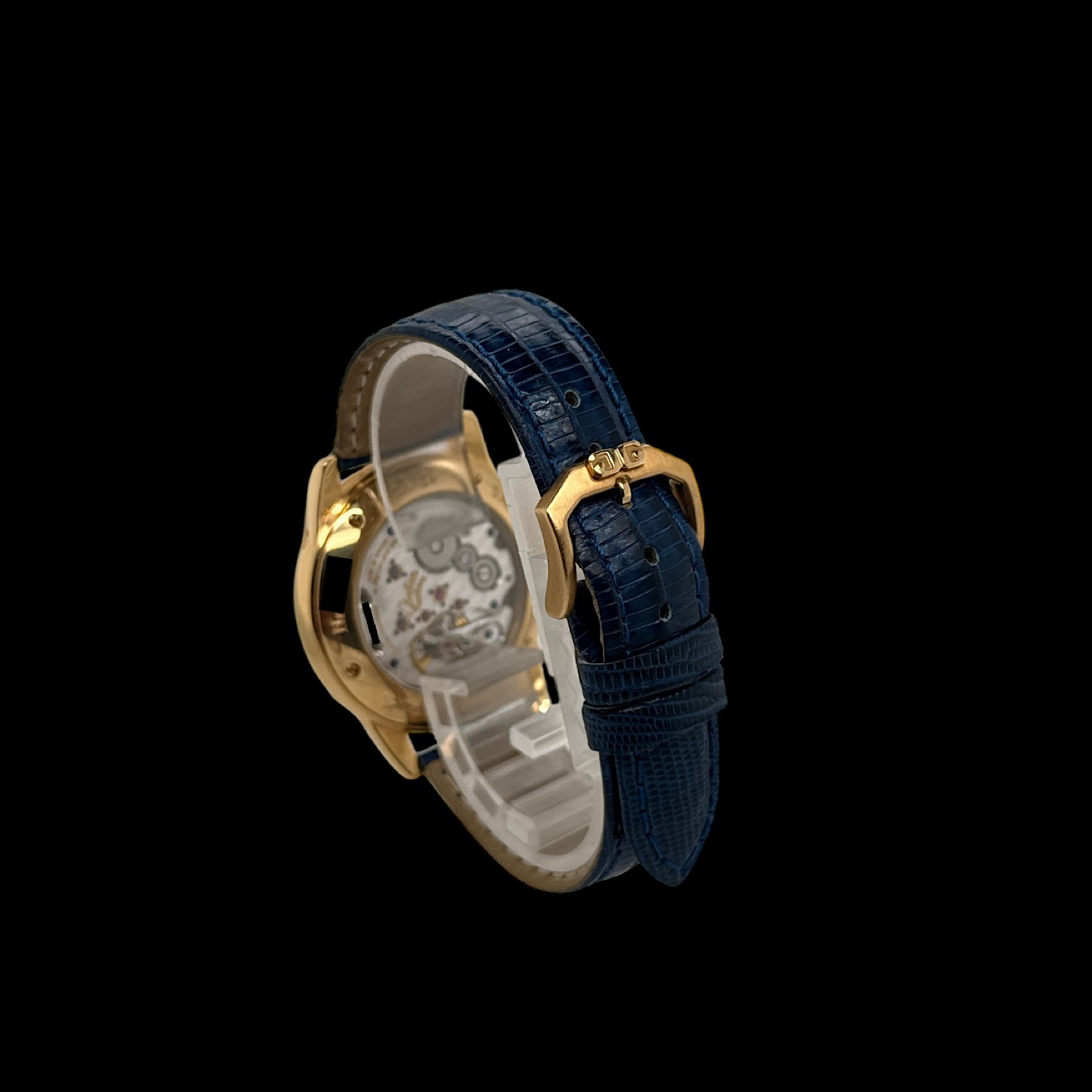 Das Armband befindet sich in wenig getragenem Zustand, es ist die originale Dornschließe aus 18-karätigem Gelbgold montiert. Zum Lieferumfang gehört ein neues Wechselarmband aus braunem Leder.
