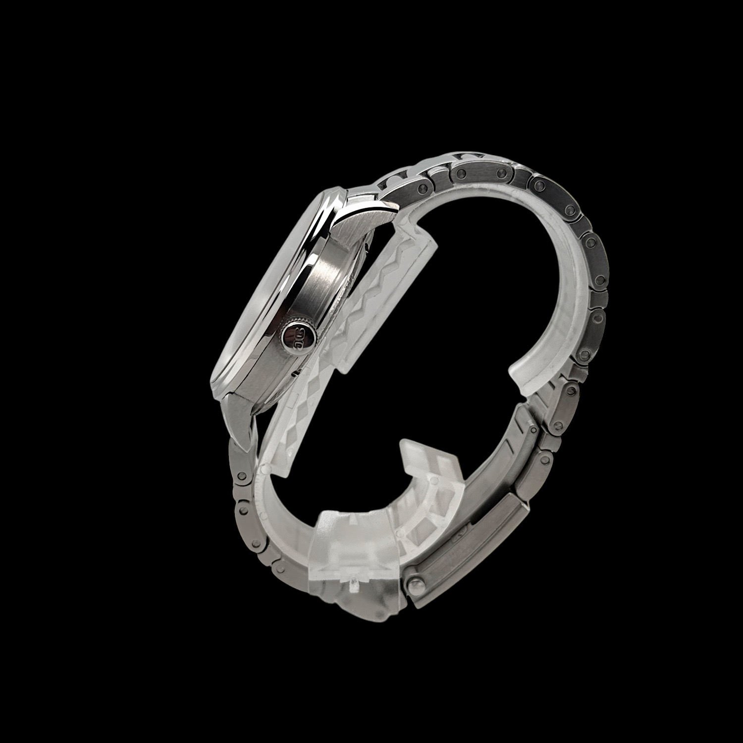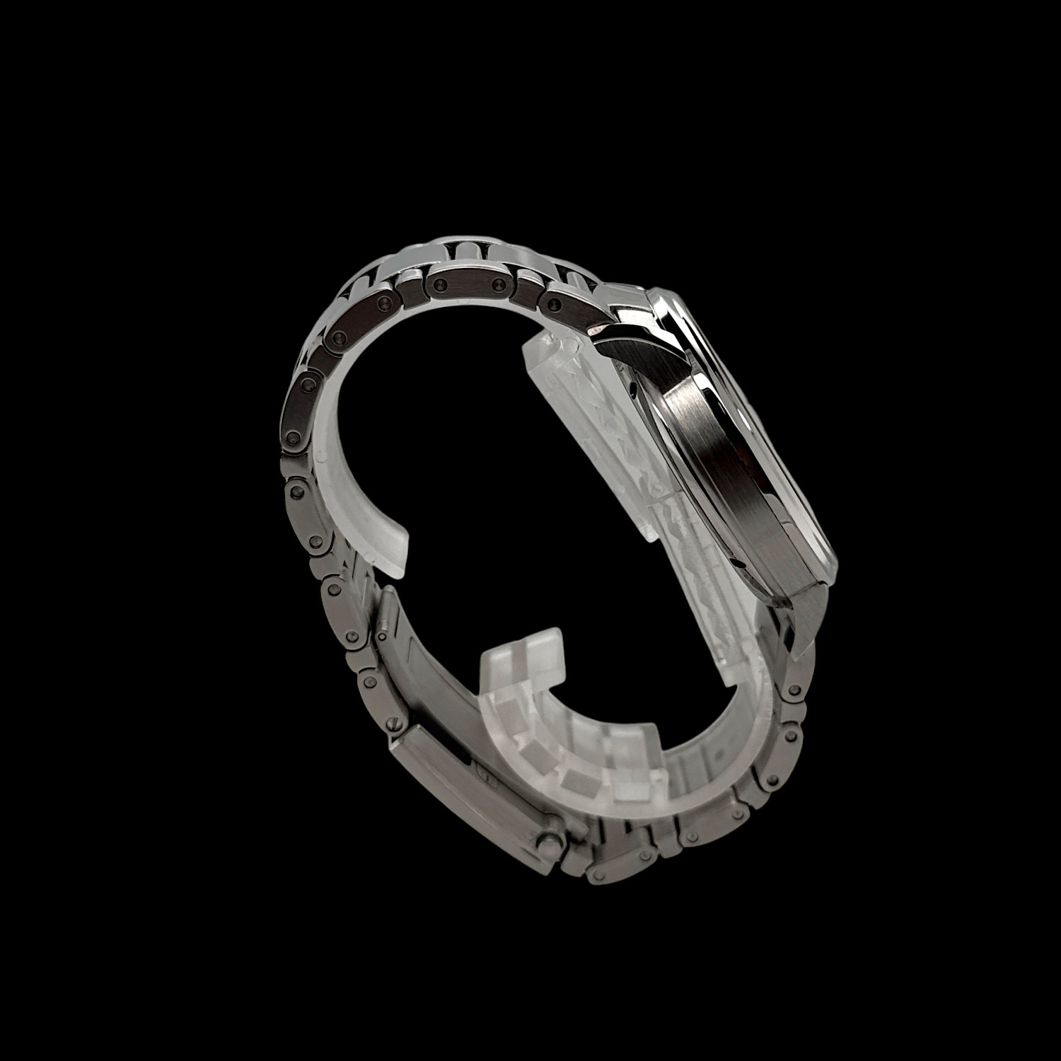Das Edelstahl-Gliederarmband mit seiner satinierten und polierten Oberfläche zeigt minimale Tragespuren.