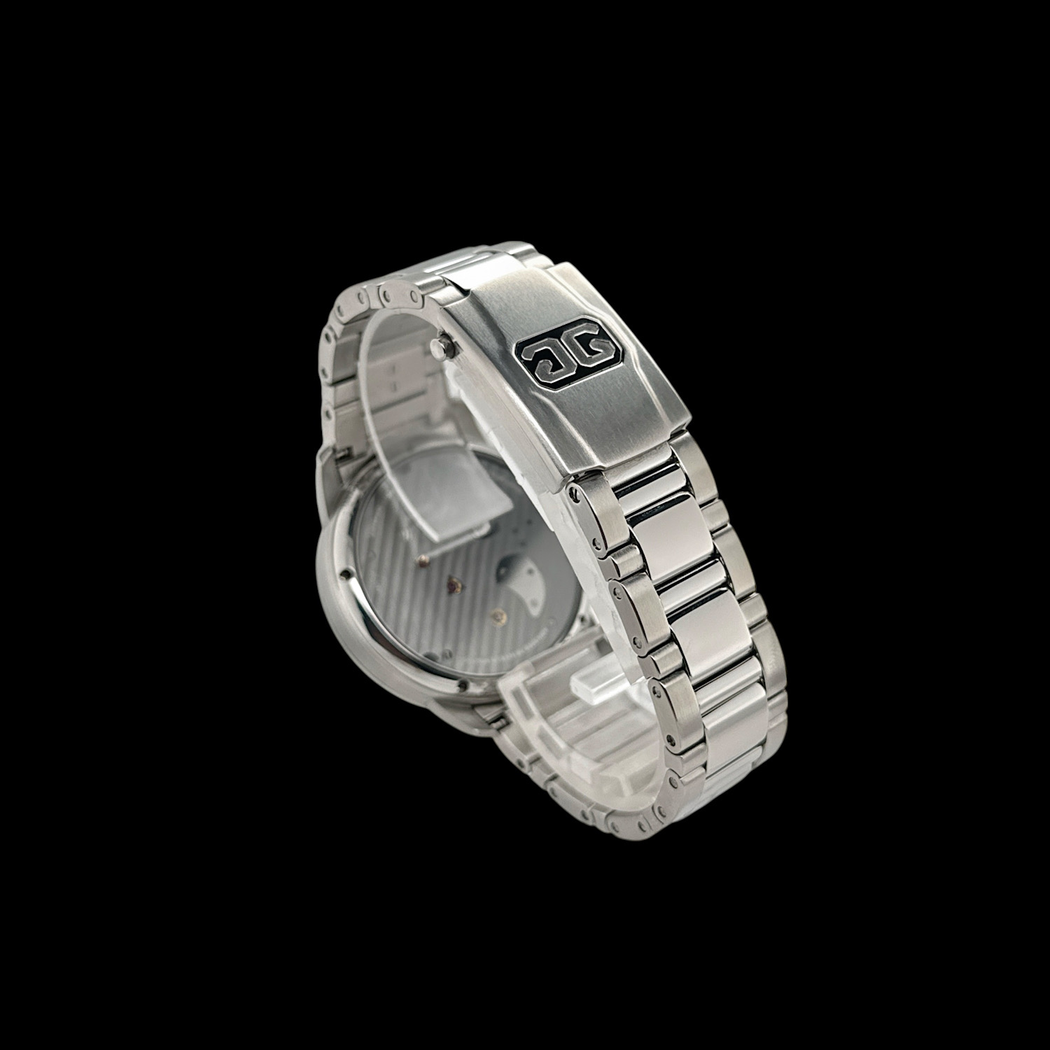 Das polierte und satinierte Edelstahlgehäuse präsentiert sich mit dezenten Tragespuren, die den Gesamteindruck nicht beeinträchtigen.