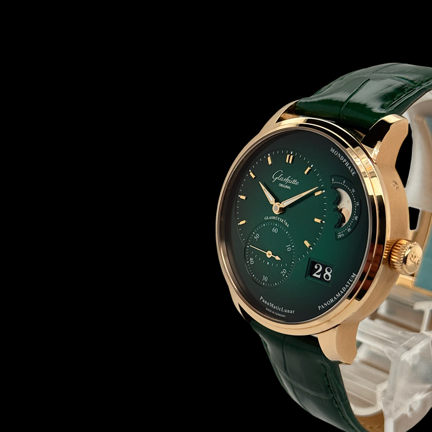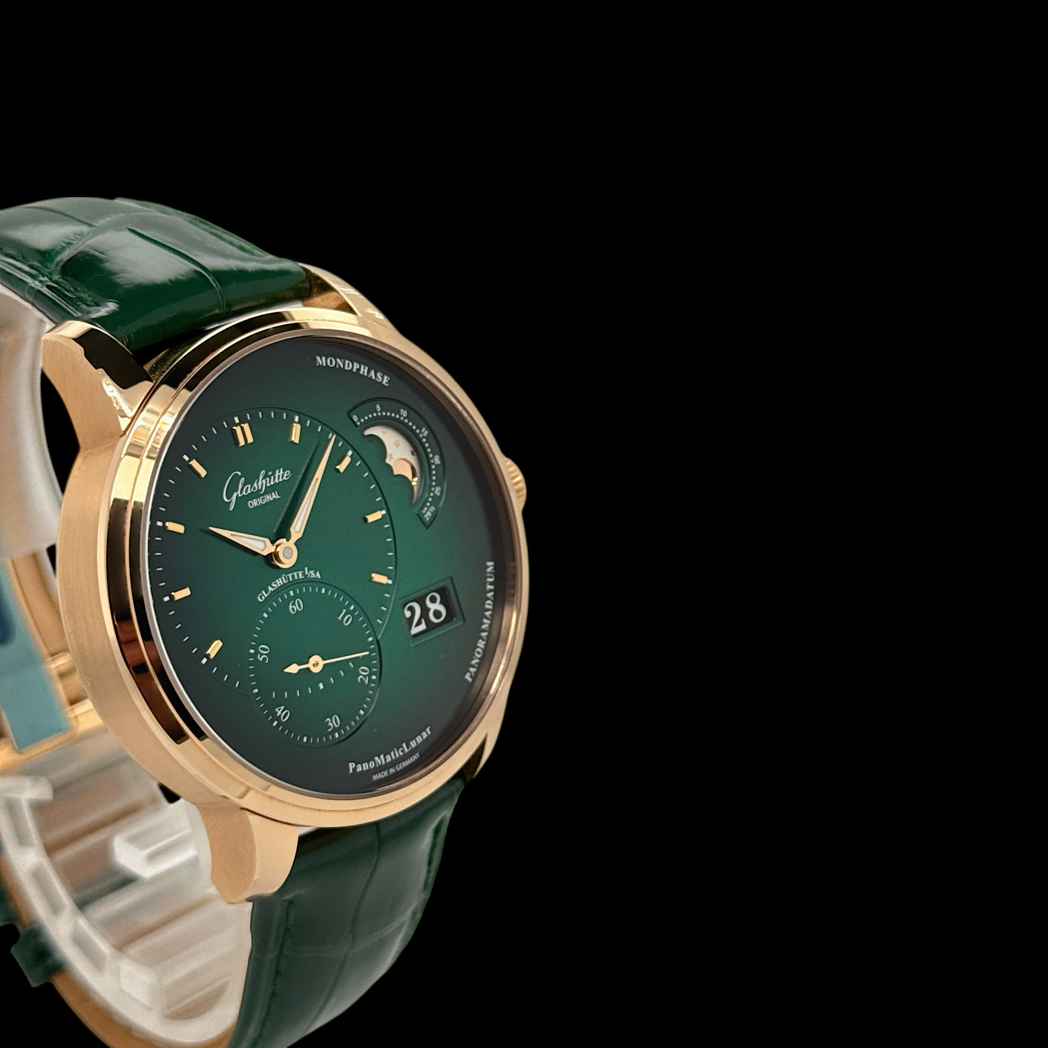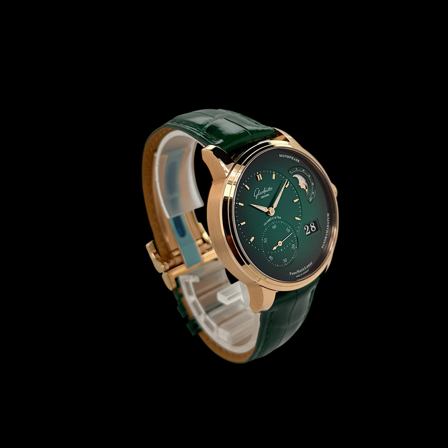 Das 40 Millimeter große Gehäuse aus warmem 18-karätigem Roségold umschließt die nach dem Goldenen Schnitt gestaltete asymmetrische Anordnung der Pano-Kollektion. Links präsentiert sich die Zeitanzeige mit zarter Guillochierung, rechts verzaubern die manufakturintern gefertigte Mondphasenanzeige mit handpoliertem Mond vor sternenbesetztem Himmel sowie das legendäre Panoramadatum. Im Inneren arbeitet das Manufakturkaliber 90-02 – Glashütter Streifenschliff, handgravierte Unruhbrücke und Doppelschwanenhals-Feinregulierung sind durch den Saphirglasboden sichtbar. Das glänzende grüne Lederband mit Faltschließe rundet diese seltene Ausführung ab. Die Herrenuhr präsentiert sich in sehr gutem Zustand und wird mit Box, Papieren aus 2021 und weiteren Booklets geliefert.