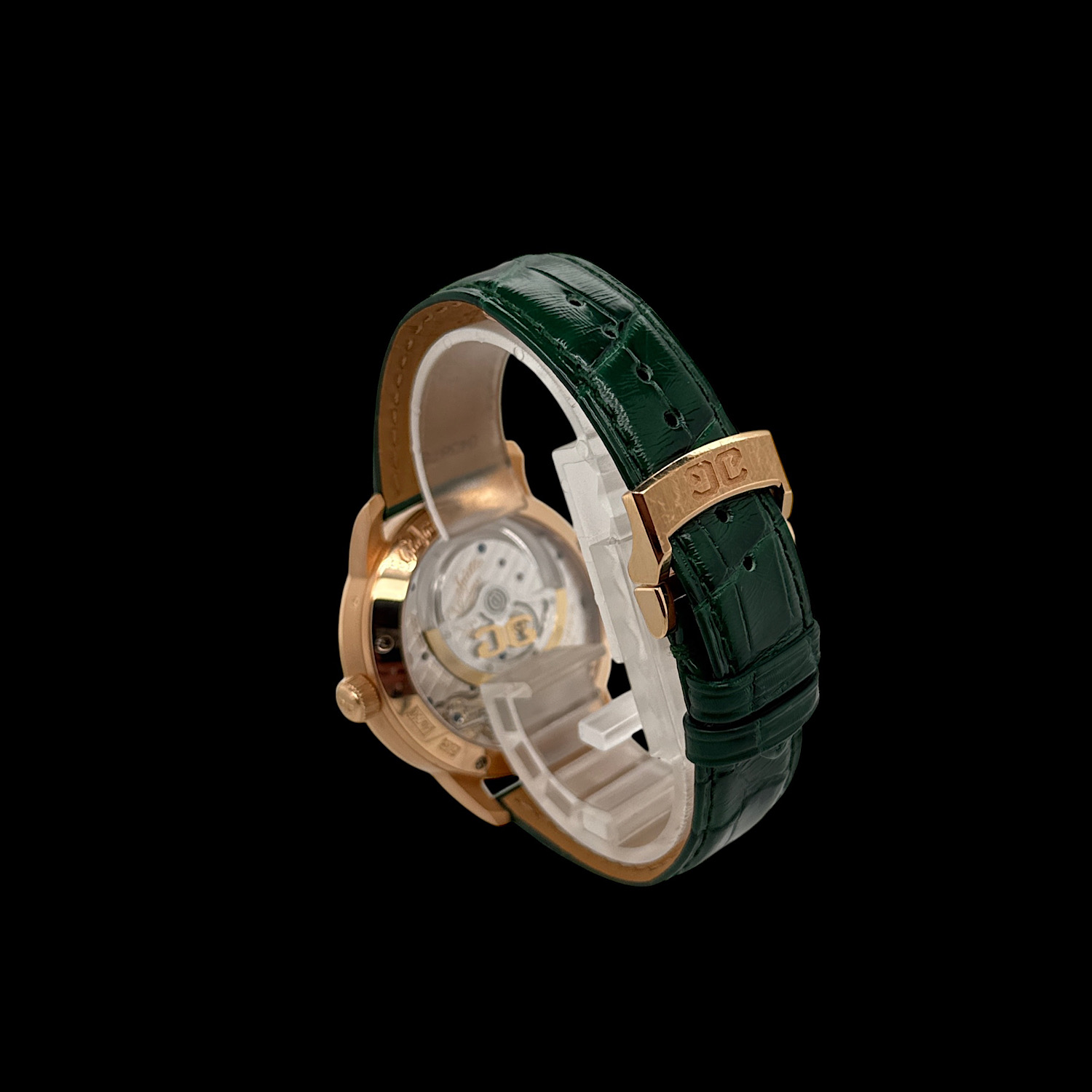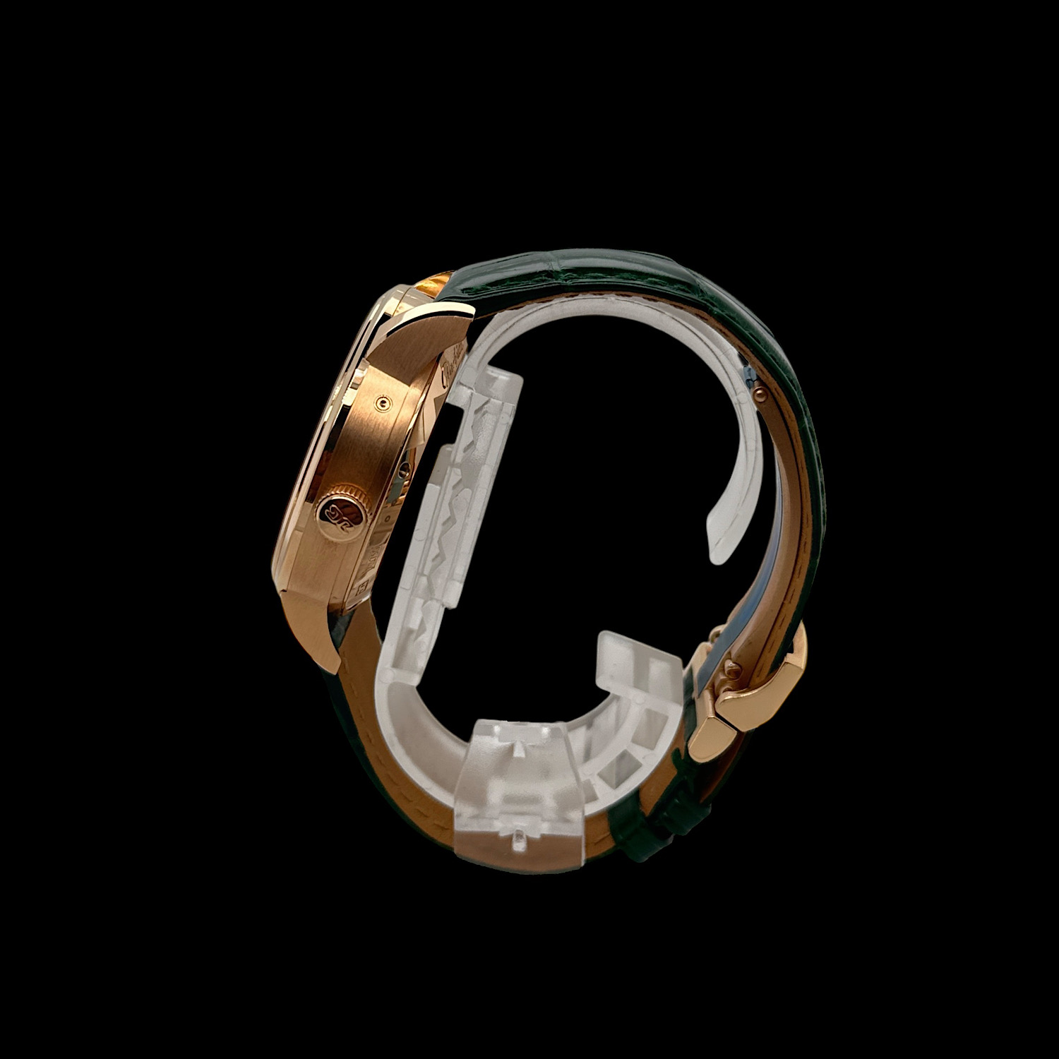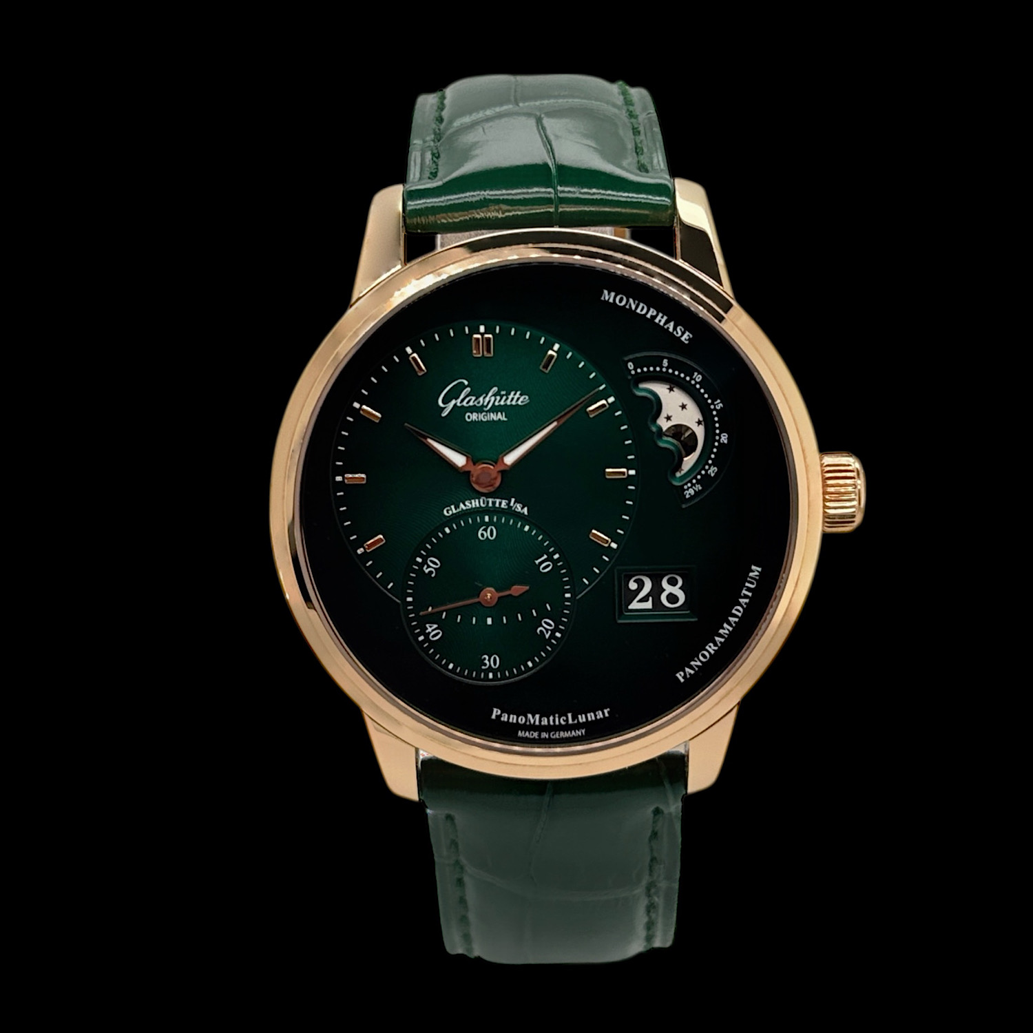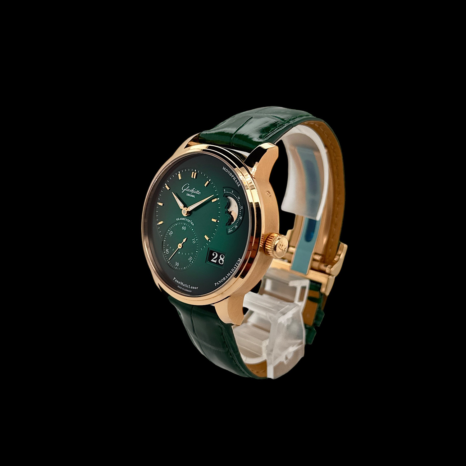 Das 40 Millimeter große Gehäuse aus warmem 18-karätigem Roségold umschließt die nach dem Goldenen Schnitt gestaltete asymmetrische Anordnung der Pano-Kollektion. Links präsentiert sich die Zeitanzeige mit zarter Guillochierung, rechts verzaubern die manufakturintern gefertigte Mondphasenanzeige mit handpoliertem Mond vor sternenbesetztem Himmel sowie das legendäre Panoramadatum. Im Inneren arbeitet das Manufakturkaliber 90-02 – Glashütter Streifenschliff, handgravierte Unruhbrücke und Doppelschwanenhals-Feinregulierung sind durch den Saphirglasboden sichtbar. Das glänzende grüne Lederband mit Faltschließe rundet diese seltene Ausführung ab. Die Herrenuhr präsentiert sich in sehr gutem Zustand und wird mit Box, Papieren aus 2021 und weiteren Booklets geliefert.