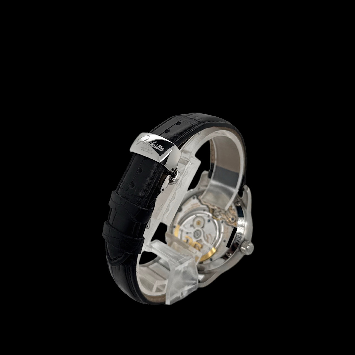 Das originale Lederarmband befindet sich in wenig getragenem Zustand. Es ist die originale Glashütter Faltschließe montiert.