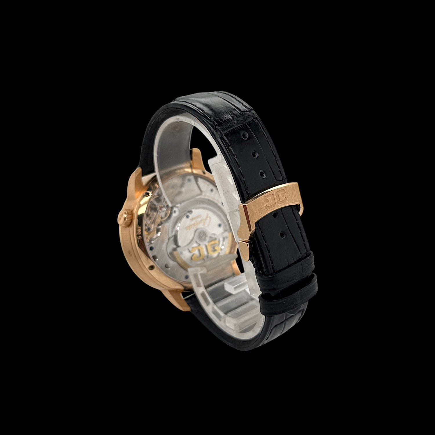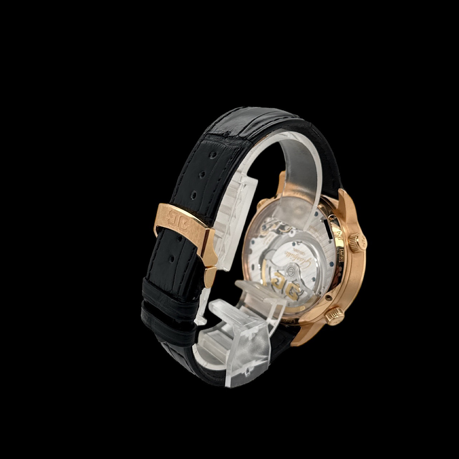 Die intelligente Weltzeitfunktion bildet 37 Zeitzonen nach IATA Flughafencodes ab und macht diese Uhr zum idealen Begleiter für internationale Geschäftsreisen. Panoramadatum und Tag-Nacht-Anzeigen bieten jederzeit die perfekte Orientierung. Das schwarze Lederband mit Rotgold-Faltschließe unterstreicht den exklusiven Charakter.