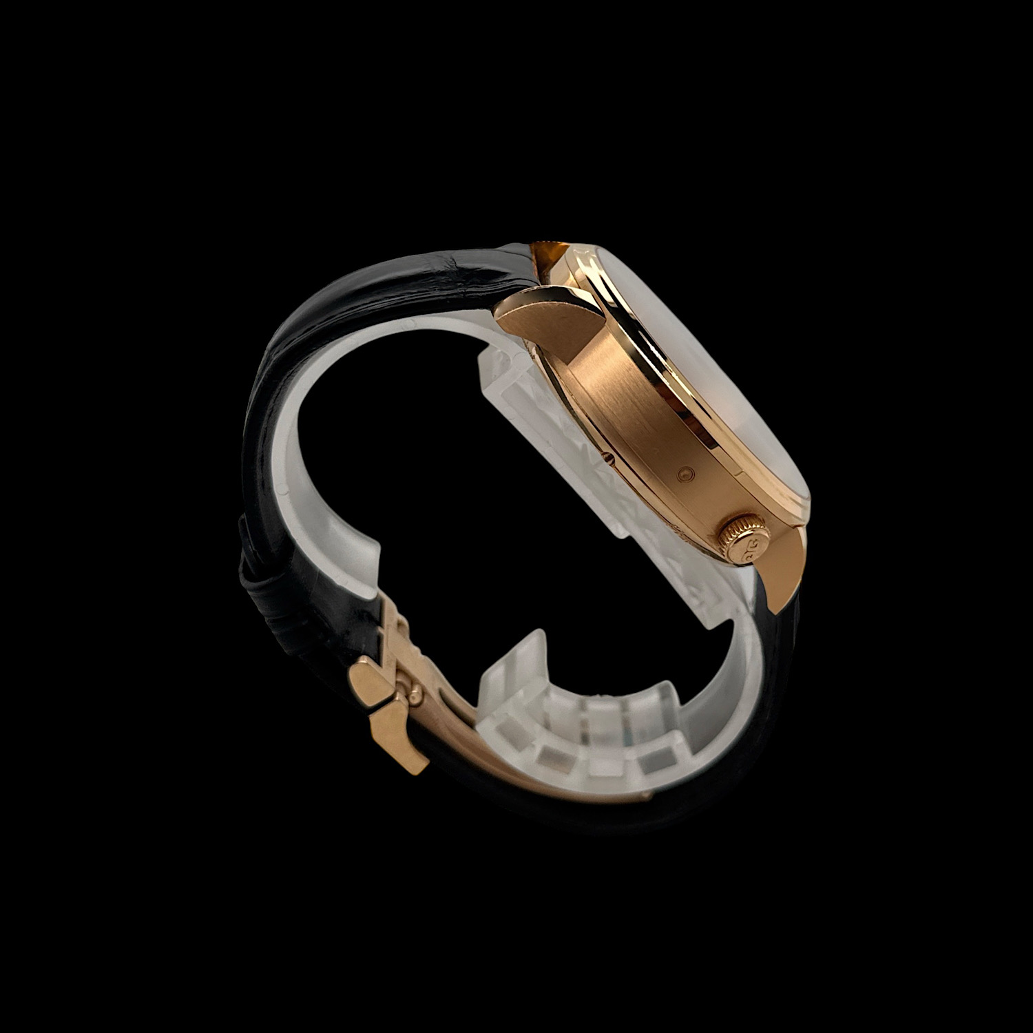 Das Gehäuse aus 18-karätigem Rotgold befindet sich in einem nahezu ungetragenen Zustand. Feine Lagerungsspuren können erkennbar sein.
