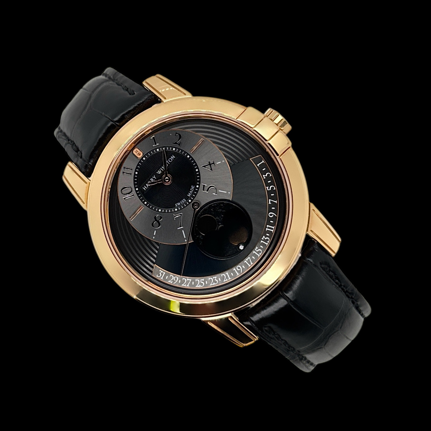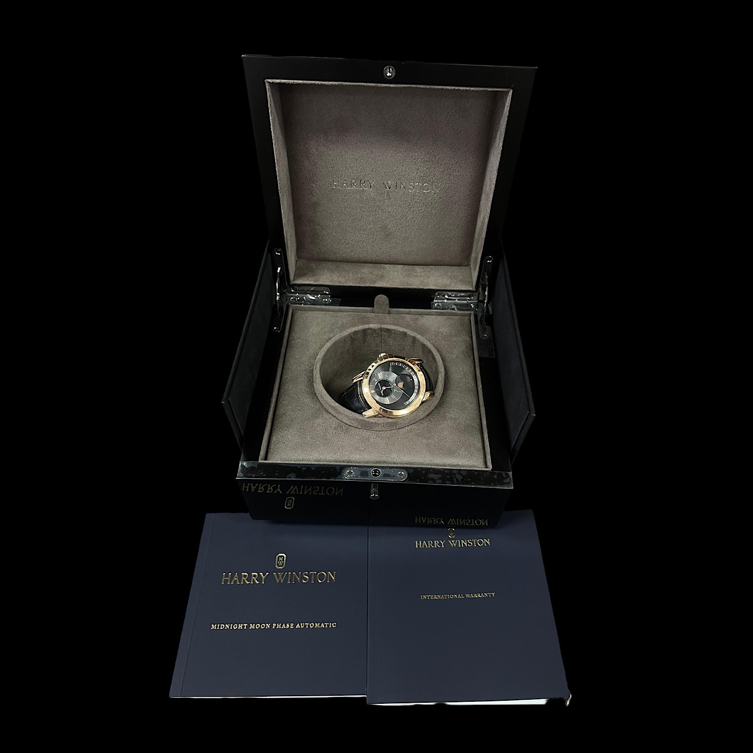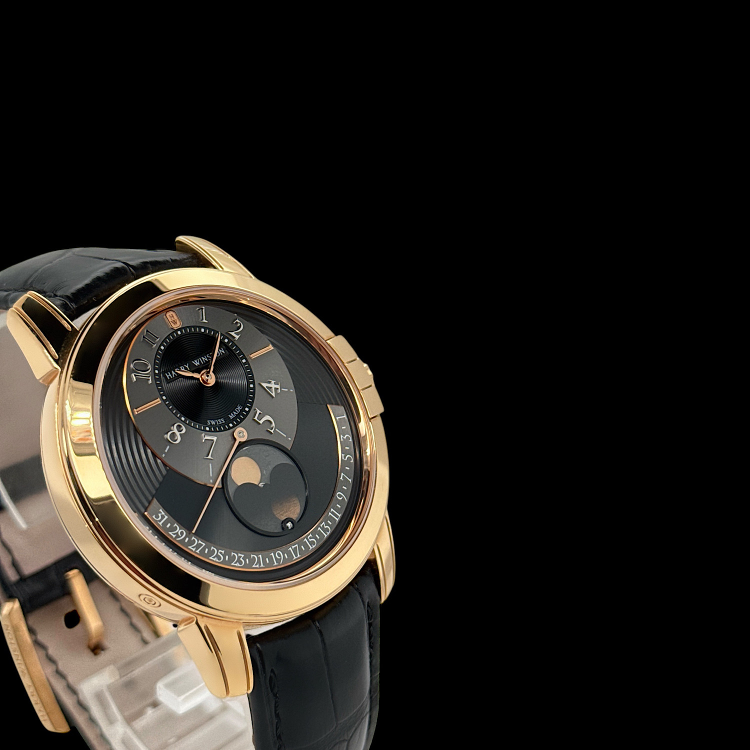 Wenn Haute Joaillerie auf Haute Horlogerie trifft, entstehen Zeitmesser wie diese Harry Winston Midnight Moon Phase Automatic 42mm, Referenz MIDAMP42RR002. Das Haus des legendären "King of Diamonds" vereint in diesem außergewöhnlichen Zeitmesser jene Eleganz, die seit 1932 die Welt der Luxusgüter prägt. Das 42,5 Millimeter große Gehäuse aus warmem 18-karätigem Roségold umschließt ein faszinierendes anthrazitfarbenes Zifferblatt, dessen mehrschichtige Oberflächenbearbeitungen ein kunstvolles Spiel aus Licht und Schatten erzeugen. Die dezentrierte Zeitanzeige und die poetische Mondphasen-Komplikation mit retrograder Datumsanzeige verleihen dieser Herrenuhr eine unverwechselbare Persönlichkeit, die sich elegant von konventionellen Zeitmessern abhebt. Im Herzen schlägt das Schweizer Automatikkaliber HW3202 mit Silizium-Spiralfeder und beeindruckenden 68 Stunden Gangreserve, dessen kunstvolle Finissierung durch den Saphirglasboden bewundert werden kann. Die Uhr präsentiert sich in sehr gutem Zustand und wird komplett mit Harry Winston Box (ohne Kissen) mit Umkarton, Papieren aus 2016 und Booklet geliefert – bereit für den nächsten Kenner zeitloser Eleganz.