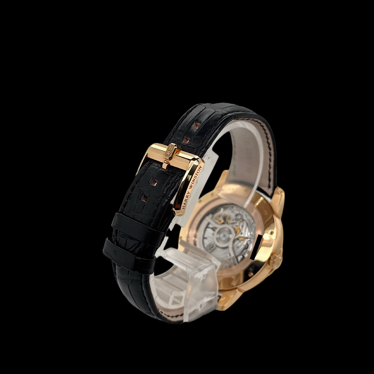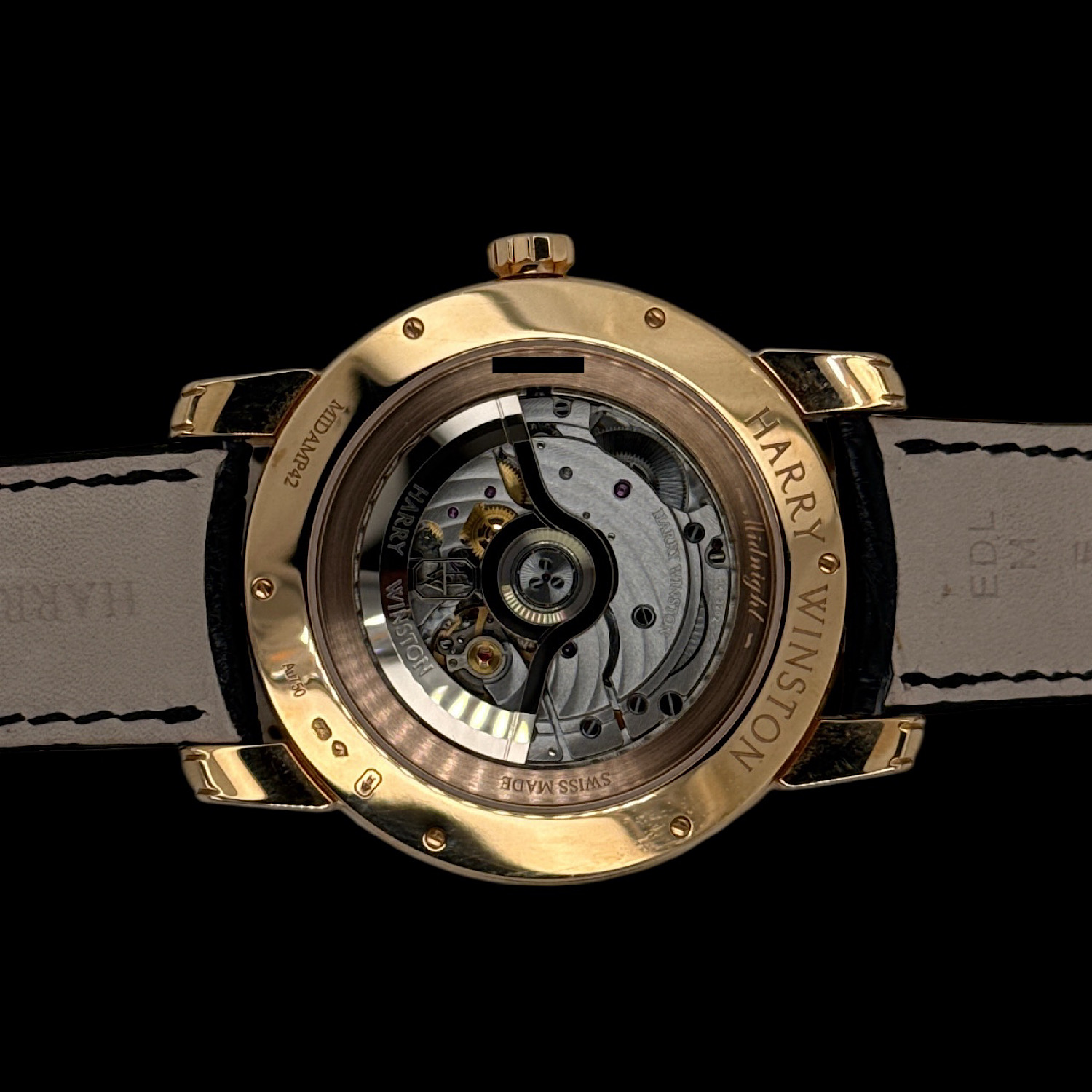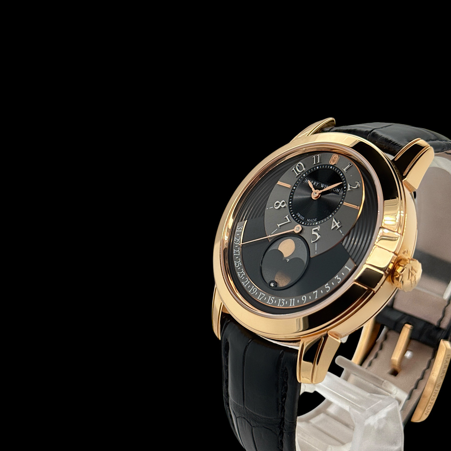 Wenn Haute Joaillerie auf Haute Horlogerie trifft, entstehen Zeitmesser wie diese Harry Winston Midnight Moon Phase Automatic 42mm, Referenz MIDAMP42RR002. Das Haus des legendären "King of Diamonds" vereint in diesem außergewöhnlichen Zeitmesser jene Eleganz, die seit 1932 die Welt der Luxusgüter prägt. Das 42,5 Millimeter große Gehäuse aus warmem 18-karätigem Roségold umschließt ein faszinierendes anthrazitfarbenes Zifferblatt, dessen mehrschichtige Oberflächenbearbeitungen ein kunstvolles Spiel aus Licht und Schatten erzeugen. Die dezentrierte Zeitanzeige und die poetische Mondphasen-Komplikation mit retrograder Datumsanzeige verleihen dieser Herrenuhr eine unverwechselbare Persönlichkeit, die sich elegant von konventionellen Zeitmessern abhebt. Im Herzen schlägt das Schweizer Automatikkaliber HW3202 mit Silizium-Spiralfeder und beeindruckenden 68 Stunden Gangreserve, dessen kunstvolle Finissierung durch den Saphirglasboden bewundert werden kann. Die Uhr präsentiert sich in sehr gutem Zustand und wird komplett mit Harry Winston Box (ohne Kissen) mit Umkarton, Papieren aus 2016 und Booklet geliefert – bereit für den nächsten Kenner zeitloser Eleganz.