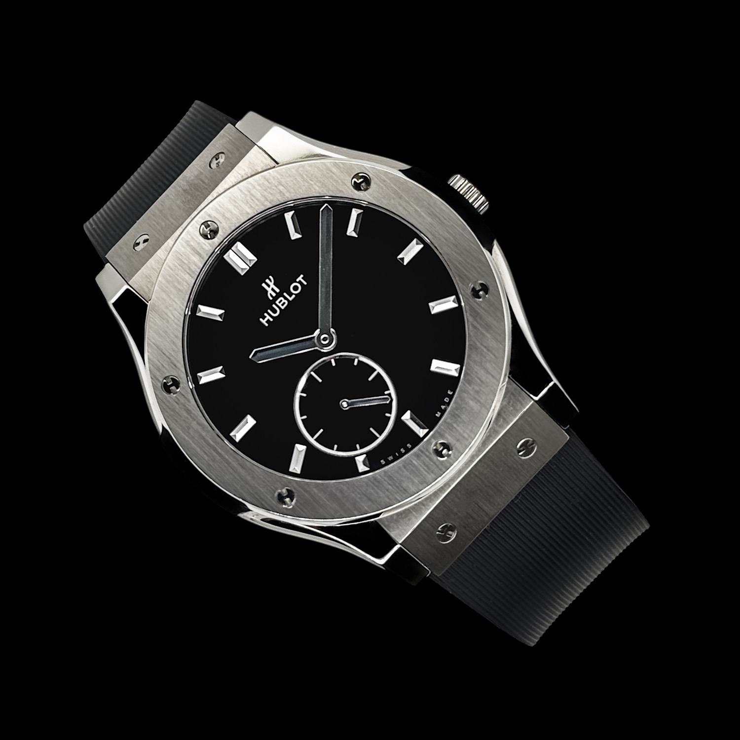 Das 45-mm-Titangehäuse liegt mit gerade einmal 9 mm Höhe fast schwerelos am Handgelenk. Die satiniert-polierte Oberfläche, die charakteristischen H-Schrauben der Lünette, das tiefschwarz lackierte Zifferblatt mit rhodinierten Appliken, alles an dieser Uhr ist präzise komponiert. Im Inneren arbeitet der Handaufzugskaliber HUB 1300, entwickelt und gefertigt von Hublot, mit einer Gangreserve von 90 Stunden. Der Saphirglasboden gibt den Blick frei auf das Werk dahinter.