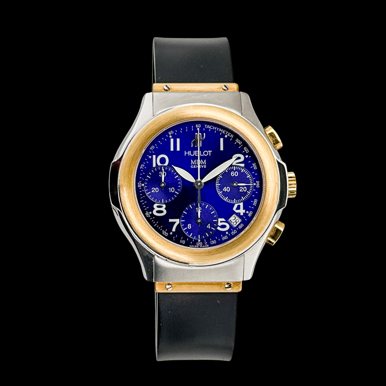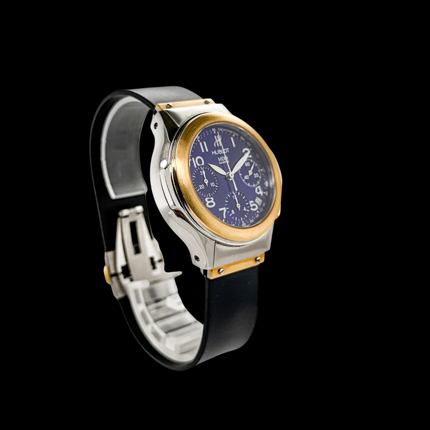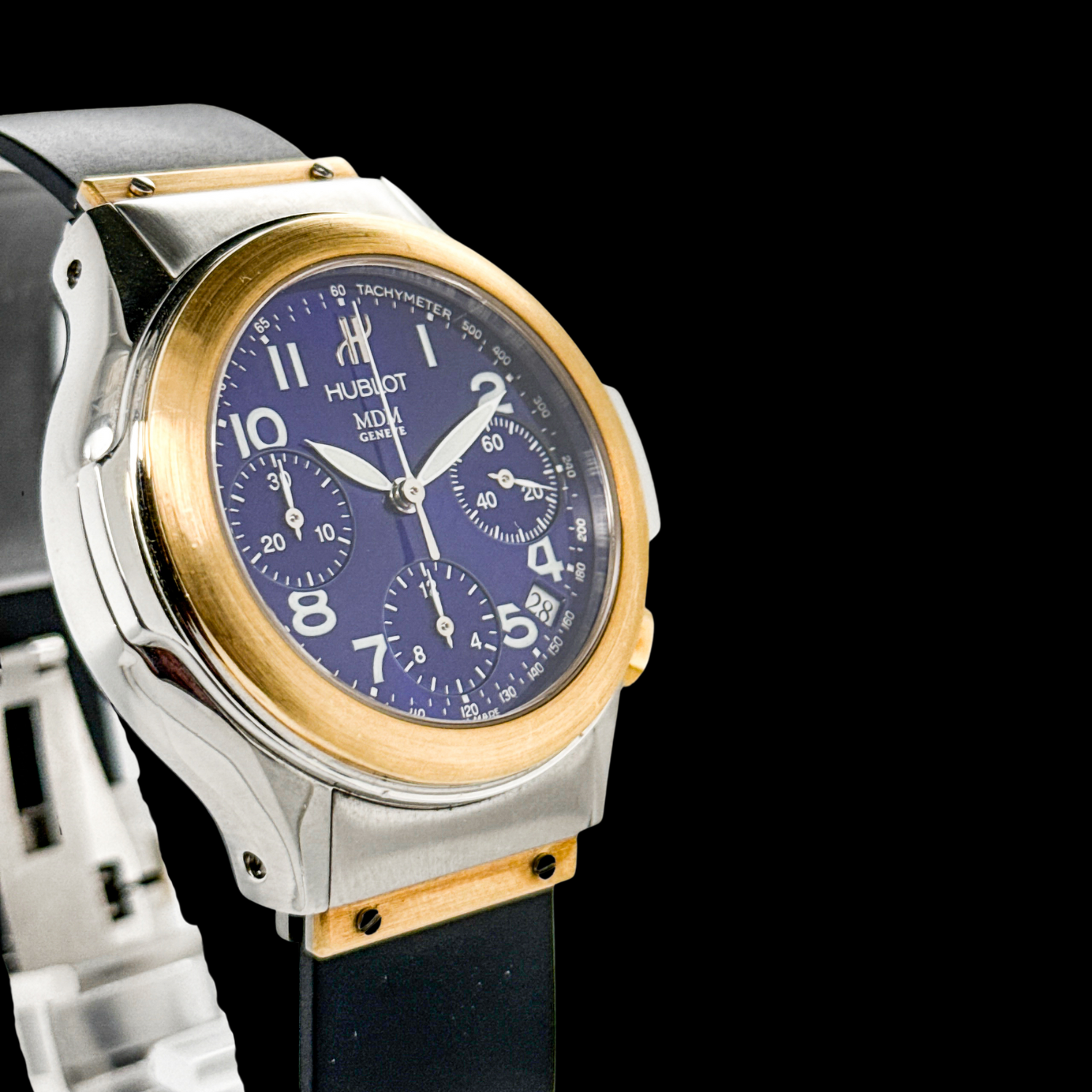 Die Hublot MDM Chronograph verkörpert das authentische Erbe der Schweizer Luxusmarke: den revolutionären Mix aus edlem Metall und innovativem Kautschuk in einer sportlich-raffinierten 40-mm-Silhouette. Als Zeugnis der Pre-Big-Bang-Ära vereint dieses Modell die zeitlose Formensprache der 1990er/2000er Jahre mit charakteristischen Hublot-Details – von der matt gebürsteten Lünette über die „MDM Genève"-Signatur bis zum komfortablen Kautschukarmband.