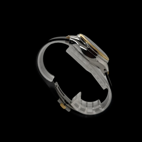 Das meisterhafte Gehäuse aus Edelstahl und 18-karätigem Gelbgold setzt luxuriöse Bicolor-Akzente, während die Stahl-Gold-Butterfly-Faltschließe für sicheren, ausgewogenen Tragekomfort sorgt.